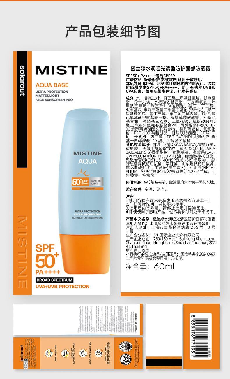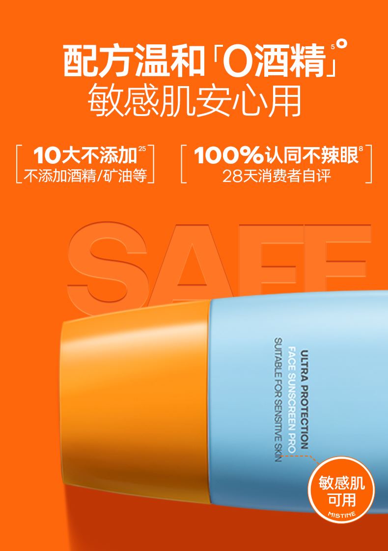 1.【科技升级】: 高倍防晒力 全波段防晒黑、防晒伤,上海皮肤病医院权威检测认证-SPF50+ PA++++ 高倍防晒,七大检测机构实测 2.【肤感升级】 专研AIR零感膜技术,一抹速成膜,空气般轻盈无感。SPF50+肤感专研Air 零感膜技术,MISTINE独有半乳化&水油双相防晒技术润而不油 不厚重 肌肤自由呼吸告别油包水剂型的“闷”感一抹,如轻风拂面 3.【科技升级】: 新增抗氧抑黑VC肽、强抗氧,抑制紫外线、蓝光诱发的自由基,减少胶原流失,帮助抵御晒老、晒纹;天然黄芩苷提取物,吸收紫外线,清除氧自由基,修护紫外线损伤;核心成分Taremi升级Taremi plus,280-400nm升级到280-450nm,帮助高效抗氧、提升防晒力、帮助抵御晒黑晒老。 4. 【友好升级】: 升级海洋友好配方,防晒配方不会造成珊瑚白化。 0酒精配方,10大不添加,安心配方、敏肌适用:不含尼泊金酯类防腐剂,不闷痘不致痘。