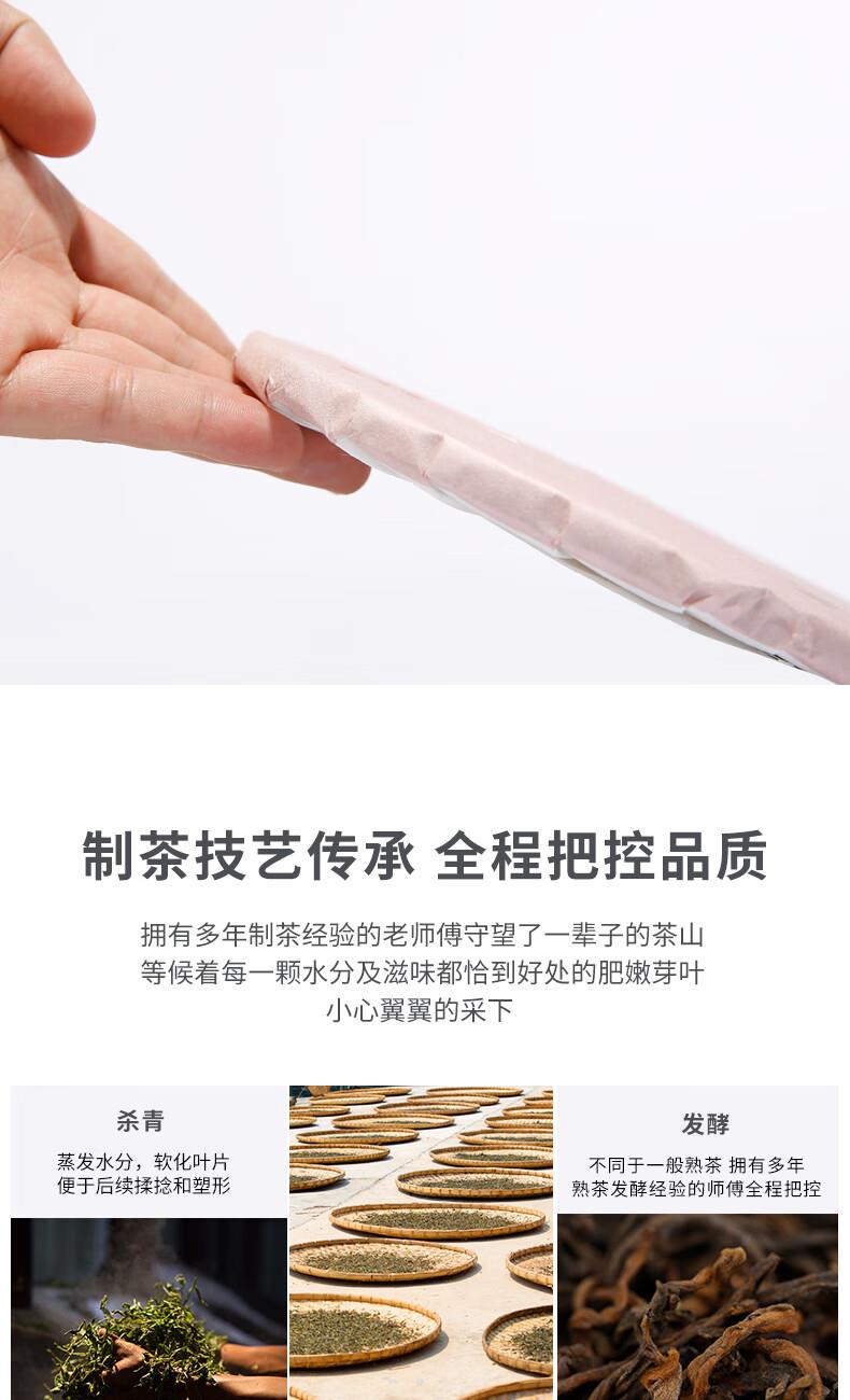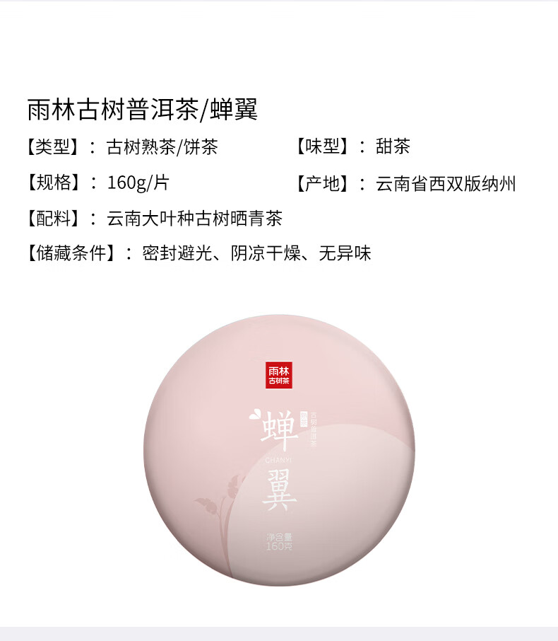 【生产工艺】 古树熟茶 【规 格】 160g 【配 料】 云南大叶种古茶树鲜叶 【上市年份】 2017年(生产日期见产品外包 装) 推荐理由: 蝉翼焕金装 一掰见真香, 薄如蝉翼! 厚度≈0.5cm的茶饼, 松紧适度, 一掰就开 喝! 8年陈化, 蝉翼熟茶: 糯滑如绸 陈韵 入骨) 金装升级! 焕新鎏金礼盒, 让茶叶 自带高光时刻!