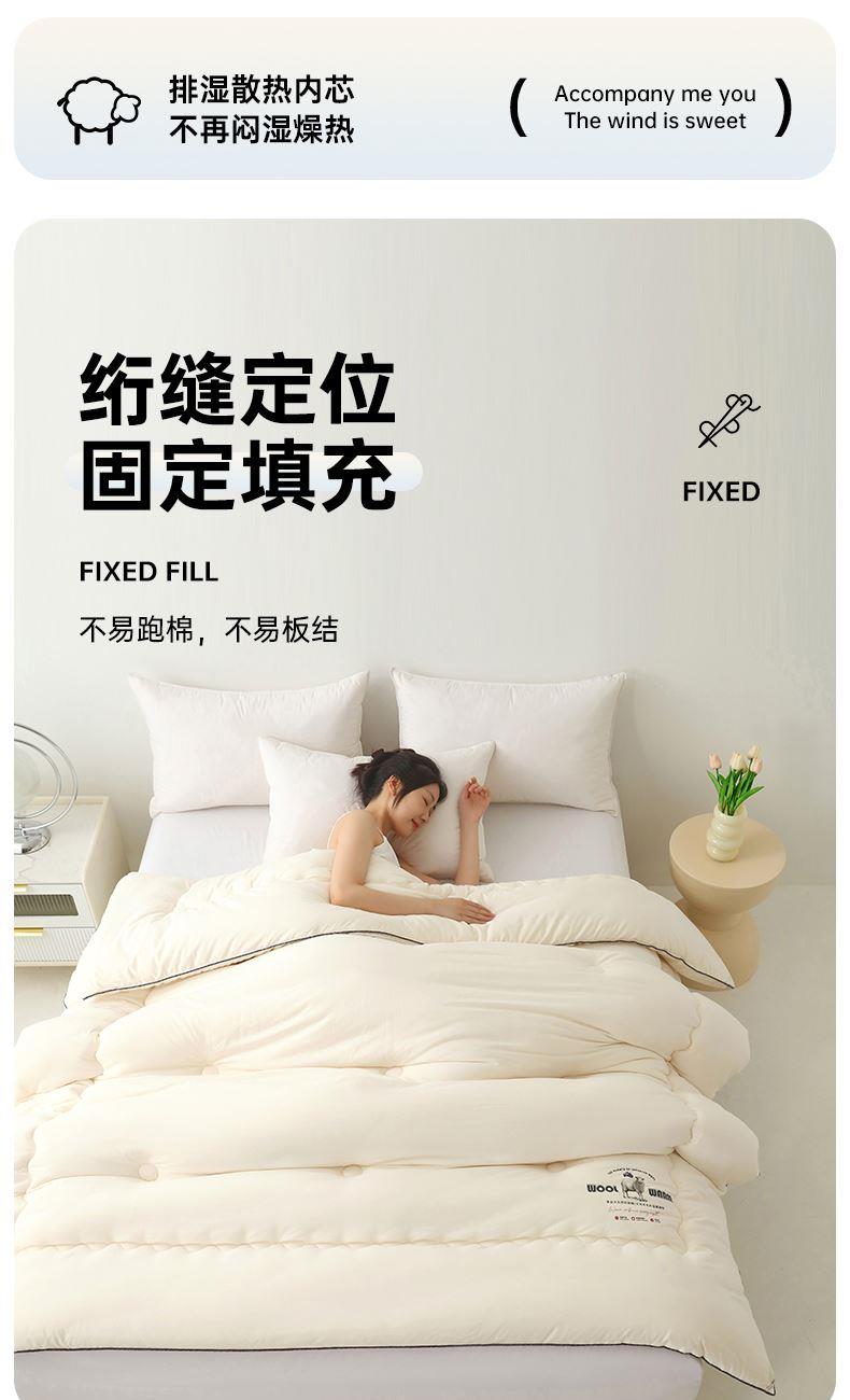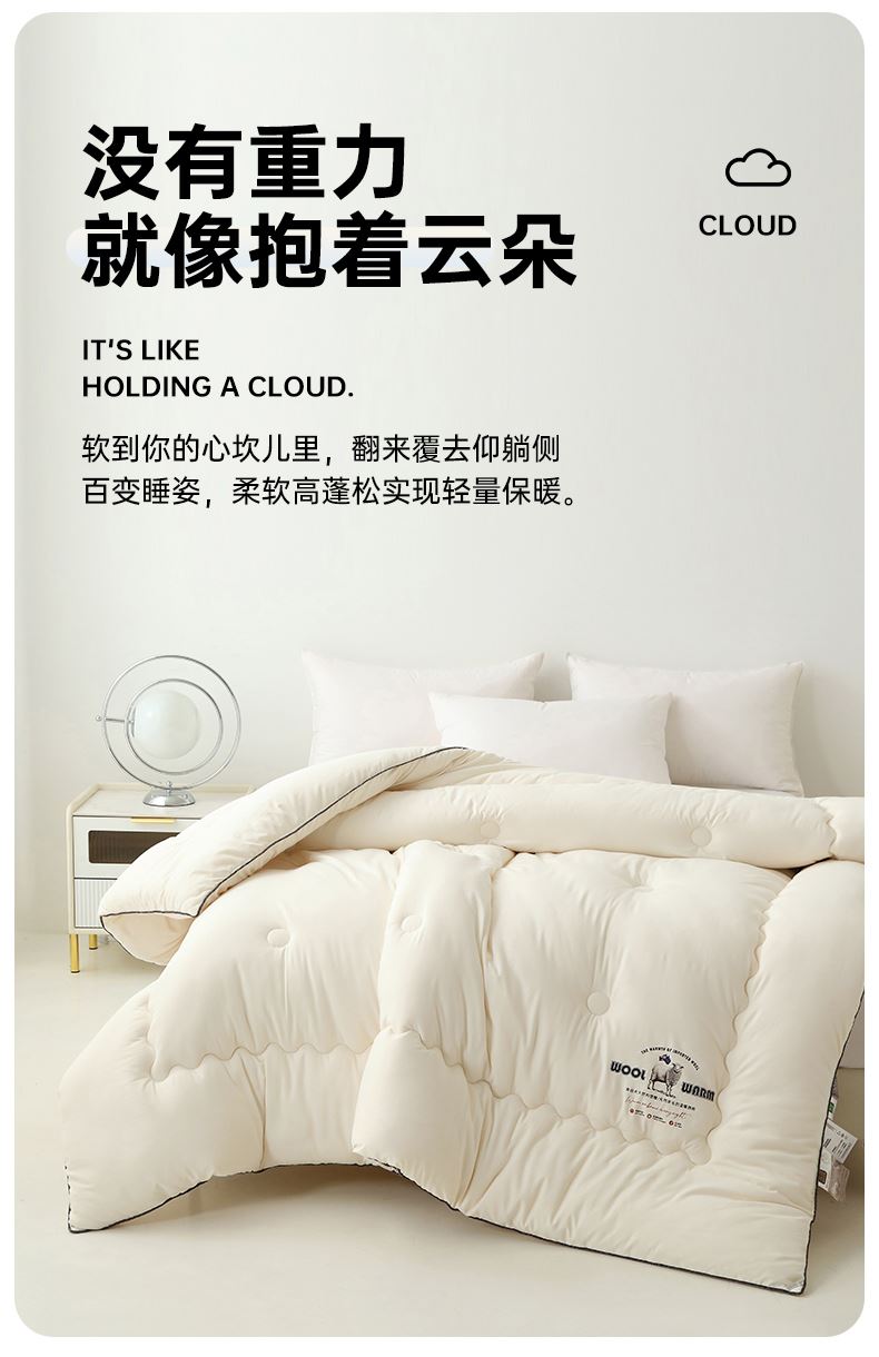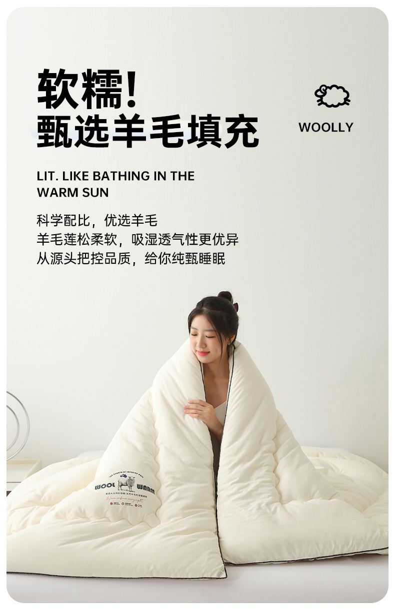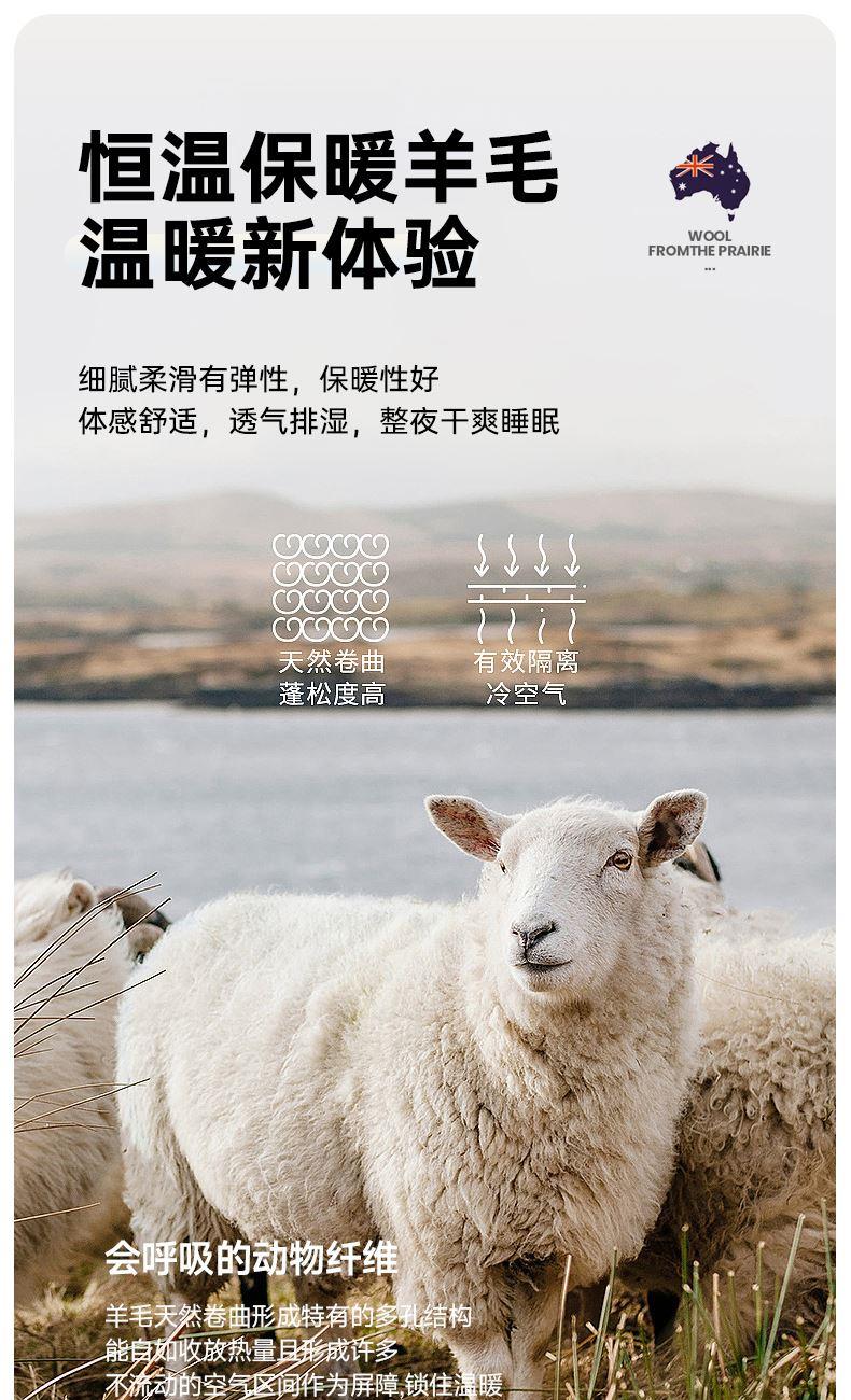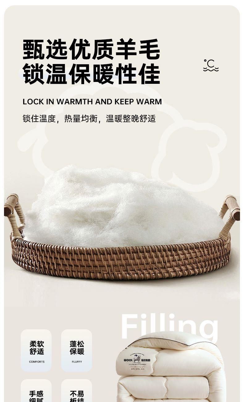 规格:200*230cm 面料:水洗棉 填充:羊毛 克重:2000g 1.甄选羊毛填充,科学配比。羊毛蓬松柔软,吸湿透气性更优异,从源头把控品质,给你纯甄睡眠。 2.暖感轻盈入梦,面包般松软,被芯手感高弹蓬松轻柔舒适兼具贴身不易压身的轻盈睡感。