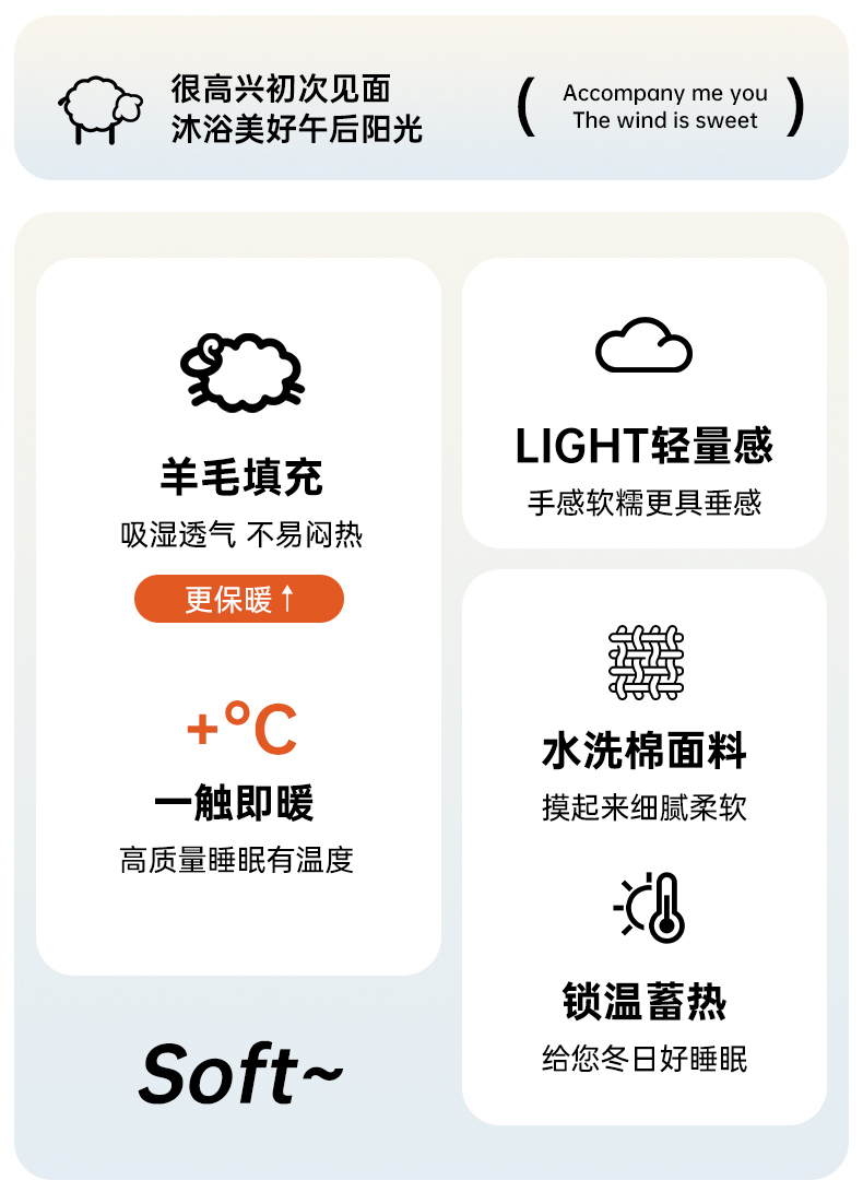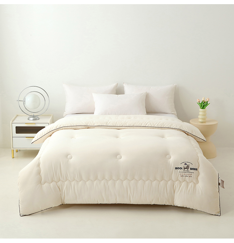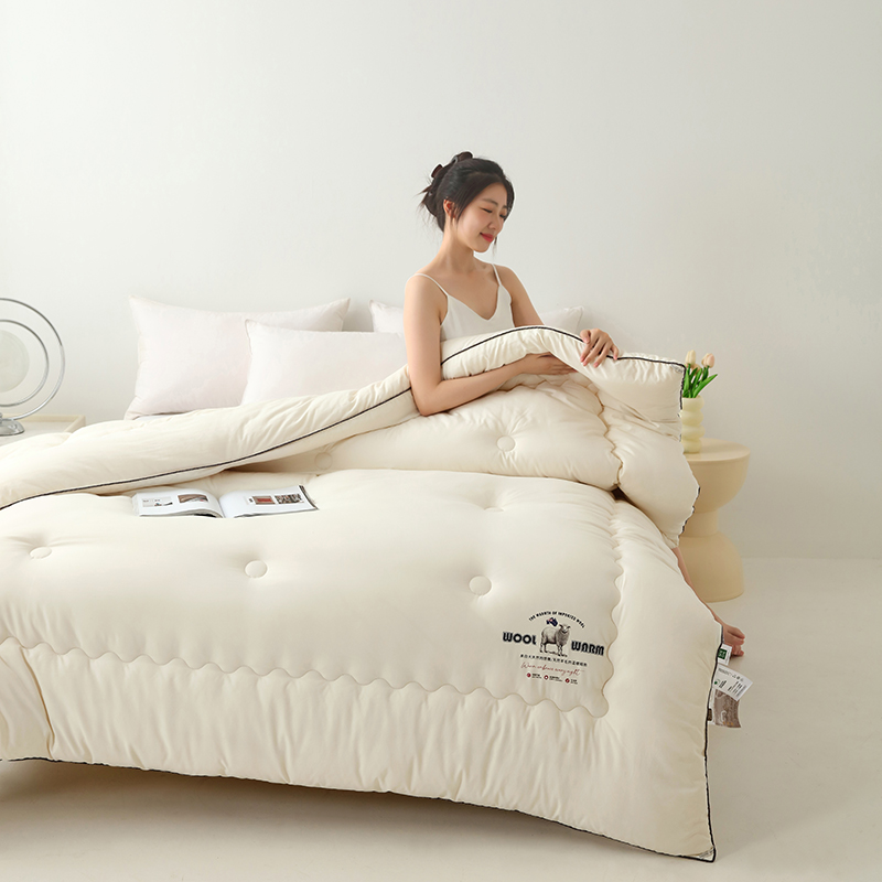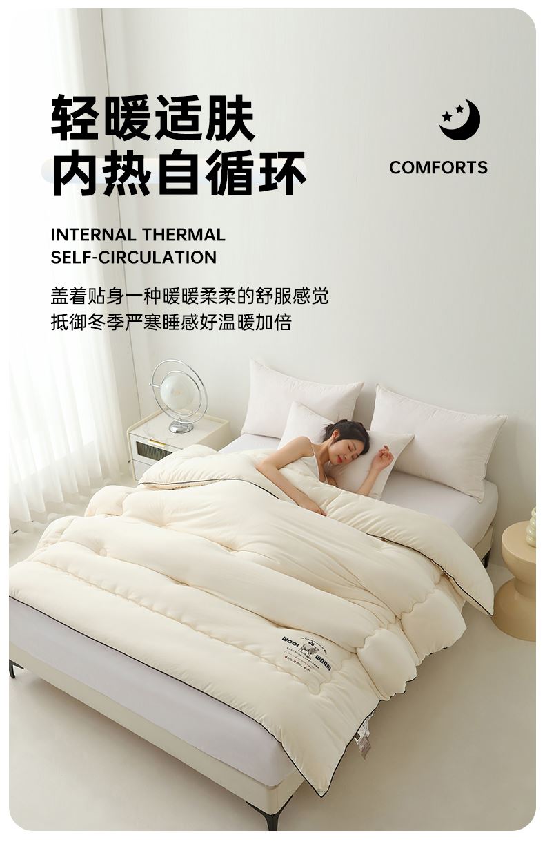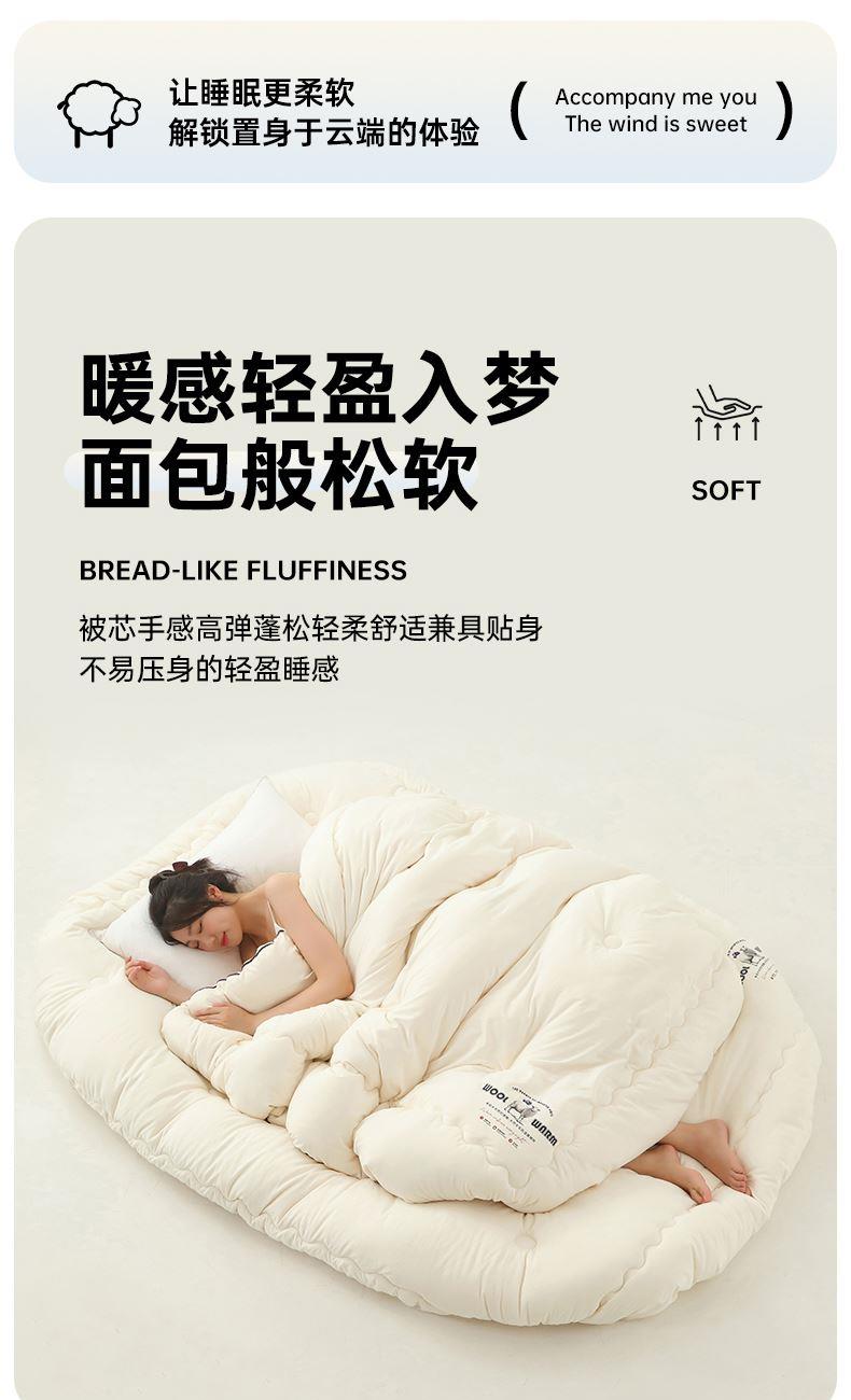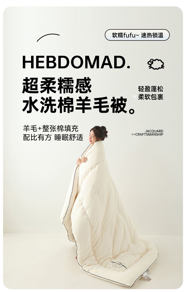 规格:200*230cm 面料:水洗棉 填充:羊毛 克重:2000g 1.甄选羊毛填充,科学配比。羊毛蓬松柔软,吸湿透气性更优异,从源头把控品质,给你纯甄睡眠。 2.暖感轻盈入梦,面包般松软,被芯手感高弹蓬松轻柔舒适兼具贴身不易压身的轻盈睡感。
