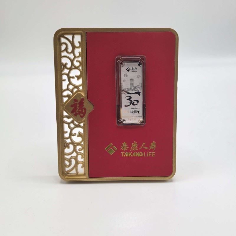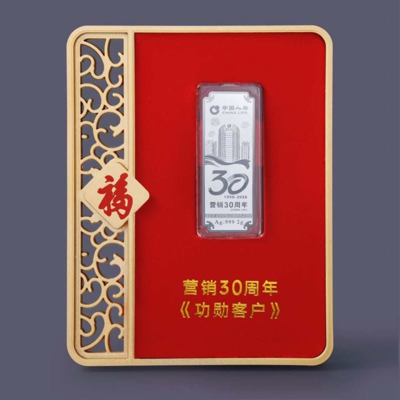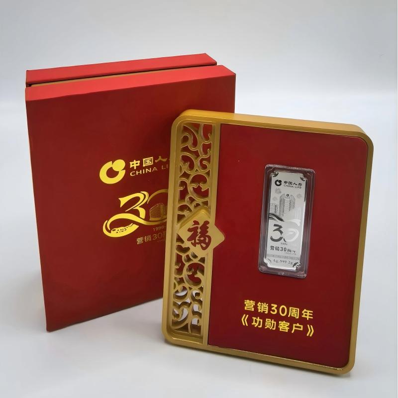 克重:足银999 1g 产品规格:100*127*13mm 包装规格:110*40*138mm 银条规格:19*52mm 三十载砥砺前行,初心如银 一银一诺,温暖永恒 每一道纹路诉说保险守护的恒久承诺 谨献Au.999足银臻品,铭刻时代华章 银耀盛世,珍藏典藏 精选999纯银锻造,银质润泽如月正面镌刻标志与“30”辉煌徽记, 方寸之间,尽显厚重底蕴。 锦绣礼呈,福运相传