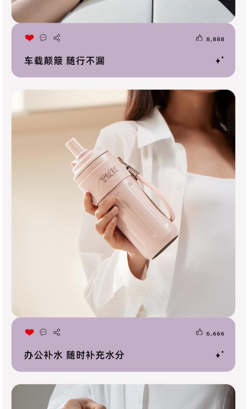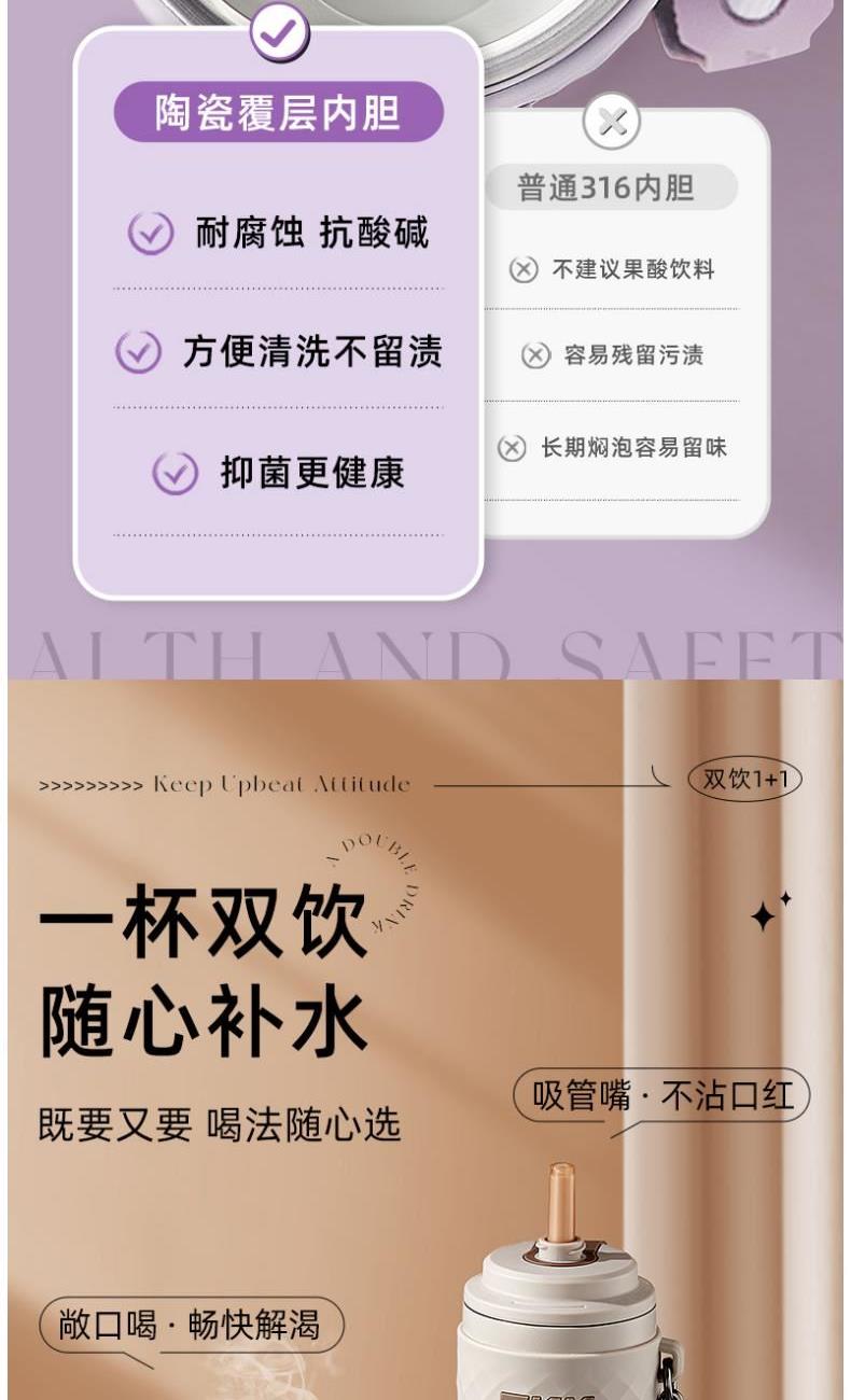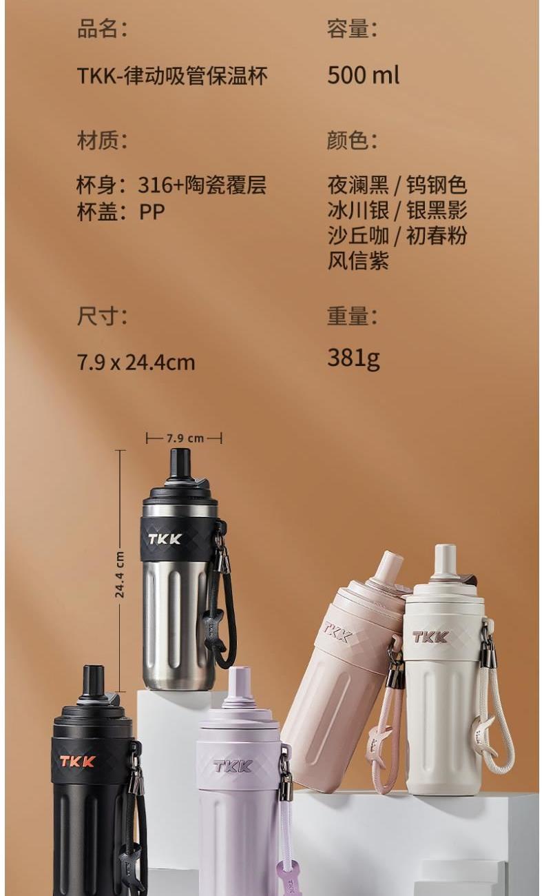 商品容量:500ML 杯身材质:316不锈钢 商品净重:381g 商品尺寸:8.2X9X24.4CM 1、 陶瓷内胆涂层,抗酸碱耐腐蚀;甄选316不锈钢材质,长效保温保冷。 2、精密防漏硅胶圈,多重防漏,无惧晃动,随身携带不湿包 3、食品级硅胶吸管,安全又健康 4、杯身温润细腻,磨砂亲肤触感,耐磨防摔,倒置不漏。 5、手提挂绳设计,出行随手提起更加便捷;吸管设计喝水更加方便。 6、时尚配色设计,耐看。 7硅胶杯底防滑垫,放置稳固。