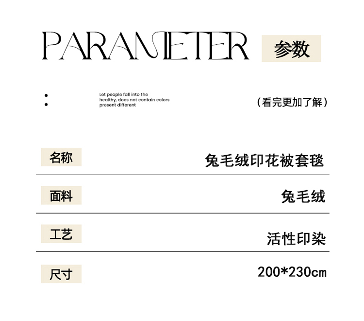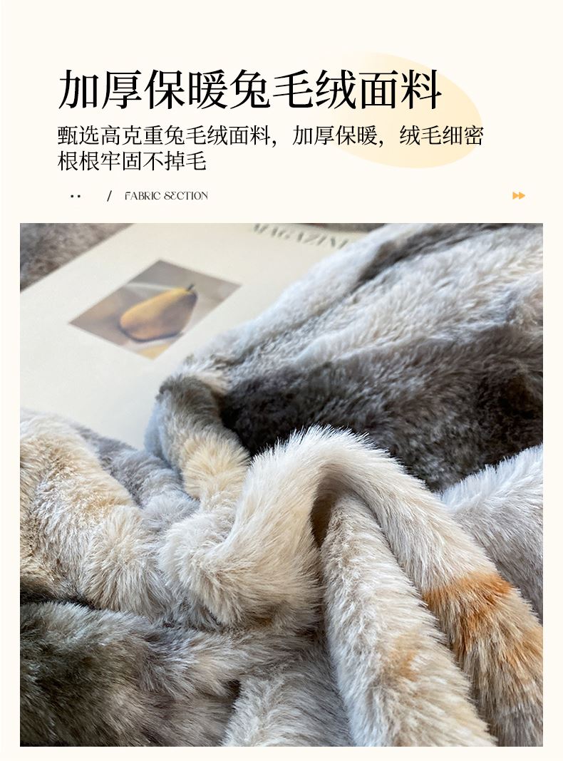 规格:200*230cm 面料:兔毛绒 克重:2200g 产品包装:精美礼盒 包装尺寸:48*35*16cm 1.兔毛绒面料纤维细长,表面光滑,柔软蓬松。 2.兔毛绒面料暖和,保暖性强。