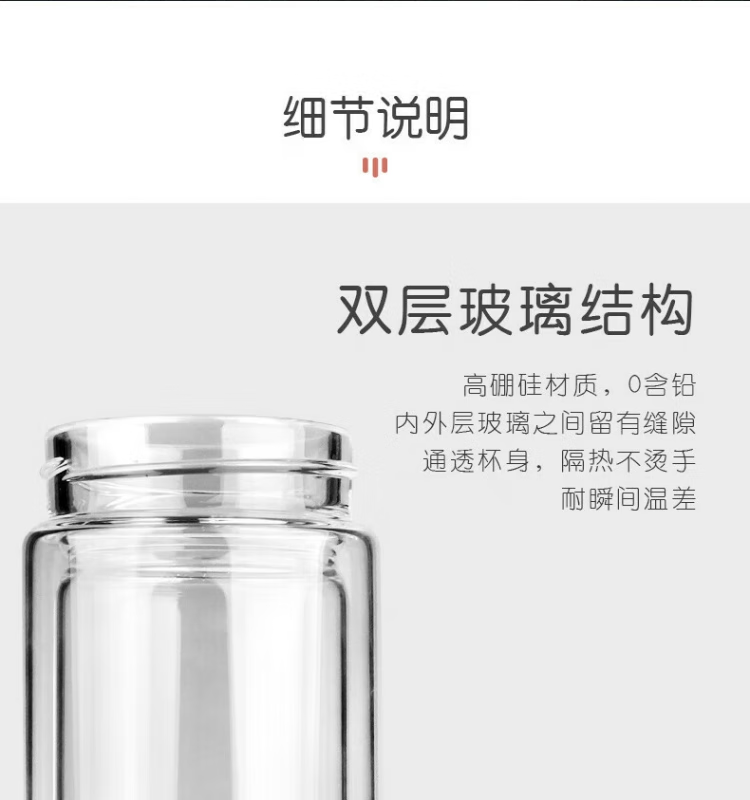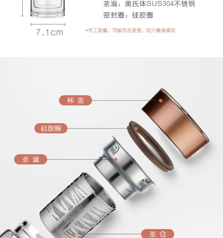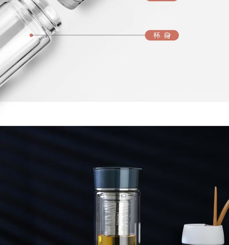 颜 色:GY灰/ BL蓝/GD金 容 量:400毫升 重 量:约470克 尺 寸:约21.4X7.0厘米 材 质: 杯身:高硼硅玻璃 杯盖:硅胶/奥氏体SUS304 不锈钢茶漏:奥氏体SUS304不锈钢 密封圈:硅橡胶 带茶隔玻璃杯