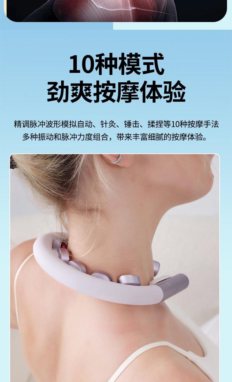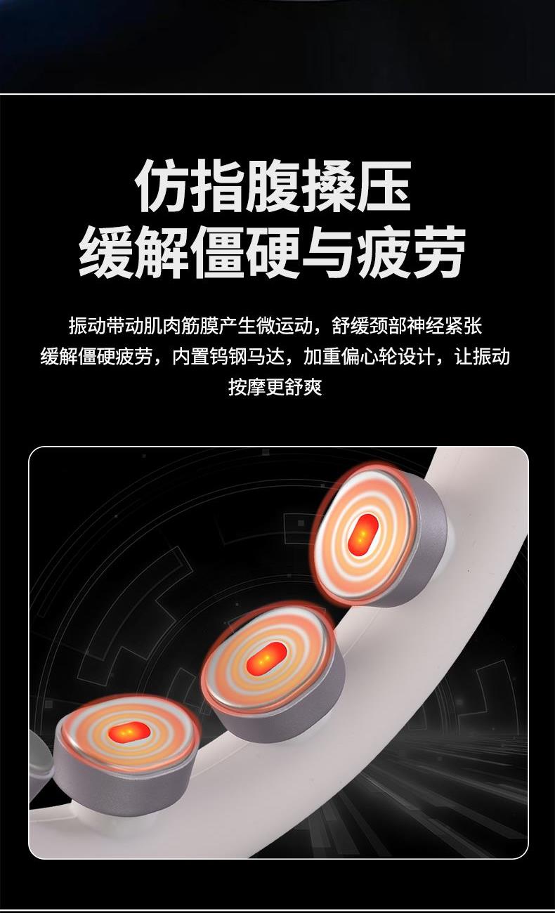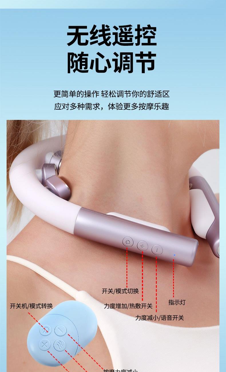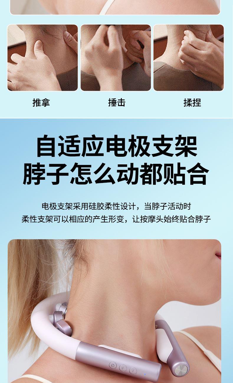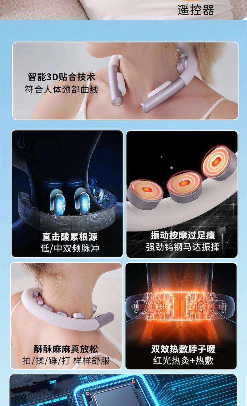 6 头立体按摩 + 360° 旋转:6 组按摩头搭配 360° 任性旋转设计,突破传统按摩局限,贴合颈椎曲线,覆盖后颈、肩周等酸痛区域,多维度模拟人手揉捏、按压,一次按摩即可缓解大面积肌肉僵硬 一键开启 42℃恒温热敷:无需复杂操作,一键启动热敷功能,暖流透过亲肤硅胶渗透颈肩,搭配脉冲、震动按摩同步作用,快速驱散肌肉寒意,秋冬使用暖颈更暖心,缓解酸痛效果翻倍 食品级软硅胶亲肤材质:按摩头与接触面均采用软硅胶材质,触感细腻亲肤,敏感肌使用无刺激,长期佩戴不闷汗、不压痕,贴合颈部时如同人手轻抚,舒适度远超普通塑料材质按摩仪 10 大模式 + 16 档力度 + 双频按摩:涵盖揉捏、捶打、脉冲等 10 大专业按摩模式,搭配 16 档细腻力度调节,再加上低 / 中双频按摩可选,无论是日常放松、运动后舒缓,还是针对性缓解颈椎不适,都能匹配需求,全家老少都能用 无线遥控 + 随心调节:配备无线遥控器,无需低头操作,躺卧、办公时随手就能切换模式、调节力度,远距离操控不耽误追剧、工作,享受按摩更自由,懒人必备便捷设计 智能芯片动态调节技术:内置高灵敏智能芯片,实时检测电极片与皮肤的贴合度,根据皮肤接触状态动态调整脉冲功率,避免高阻抗下的刺痛感,让脉冲按摩全程平稳舒适,新手也能轻松驾驭 多技术融合仿真人手体验:整合热敷、脉冲、震动三大核心技术,搭配智能芯片模拟专业按摩师手法,从浅层放松到深层舒缓,每一下按摩到位,足不出户就能享受线下理疗店级别的颈椎护理