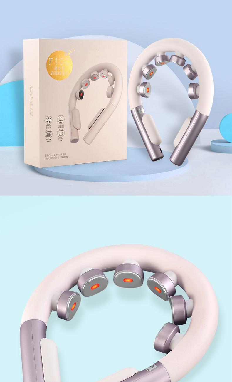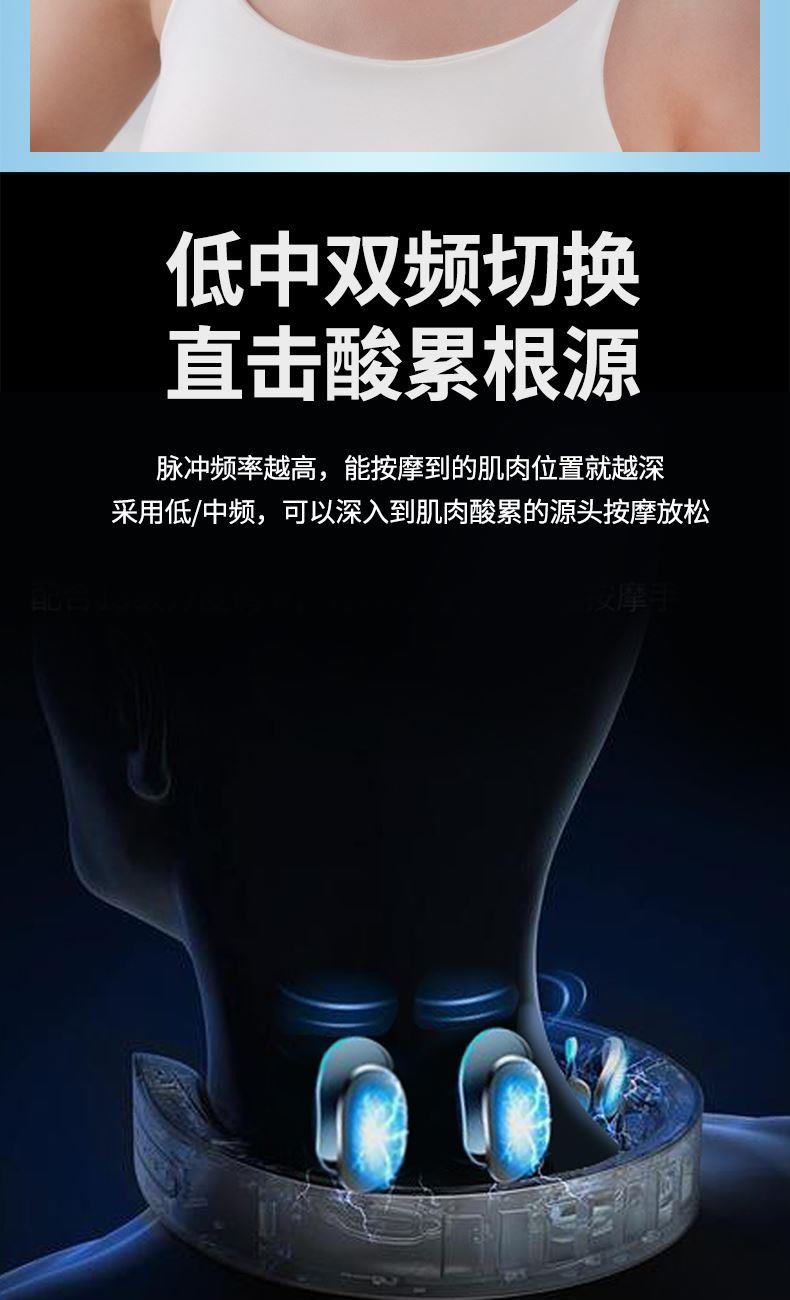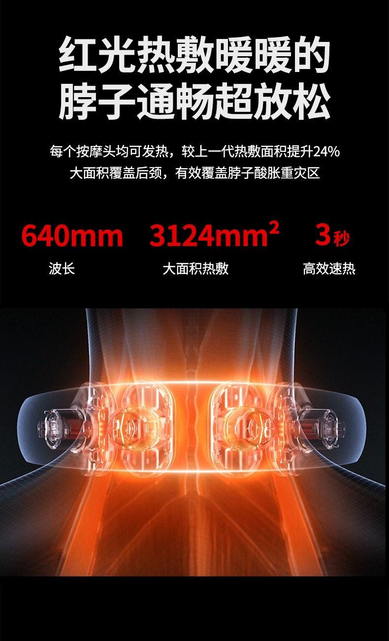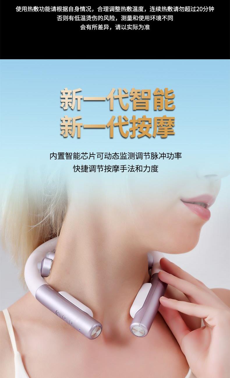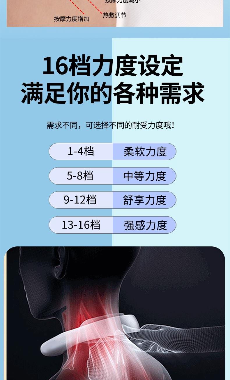 6 头立体按摩 + 360° 旋转:6 组按摩头搭配 360° 任性旋转设计,突破传统按摩局限,贴合颈椎曲线,覆盖后颈、肩周等酸痛区域,多维度模拟人手揉捏、按压,一次按摩即可缓解大面积肌肉僵硬 一键开启 42℃恒温热敷:无需复杂操作,一键启动热敷功能,暖流透过亲肤硅胶渗透颈肩,搭配脉冲、震动按摩同步作用,快速驱散肌肉寒意,秋冬使用暖颈更暖心,缓解酸痛效果翻倍 食品级软硅胶亲肤材质:按摩头与接触面均采用软硅胶材质,触感细腻亲肤,敏感肌使用无刺激,长期佩戴不闷汗、不压痕,贴合颈部时如同人手轻抚,舒适度远超普通塑料材质按摩仪 10 大模式 + 16 档力度 + 双频按摩:涵盖揉捏、捶打、脉冲等 10 大专业按摩模式,搭配 16 档细腻力度调节,再加上低 / 中双频按摩可选,无论是日常放松、运动后舒缓,还是针对性缓解颈椎不适,都能匹配需求,全家老少都能用 无线遥控 + 随心调节:配备无线遥控器,无需低头操作,躺卧、办公时随手就能切换模式、调节力度,远距离操控不耽误追剧、工作,享受按摩更自由,懒人必备便捷设计 智能芯片动态调节技术:内置高灵敏智能芯片,实时检测电极片与皮肤的贴合度,根据皮肤接触状态动态调整脉冲功率,避免高阻抗下的刺痛感,让脉冲按摩全程平稳舒适,新手也能轻松驾驭 多技术融合仿真人手体验:整合热敷、脉冲、震动三大核心技术,搭配智能芯片模拟专业按摩师手法,从浅层放松到深层舒缓,每一下按摩到位,足不出户就能享受线下理疗店级别的颈椎护理
