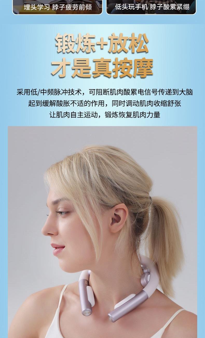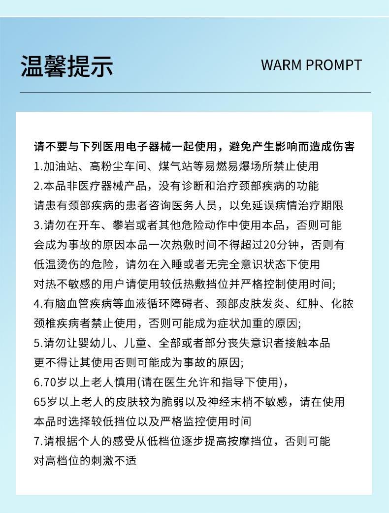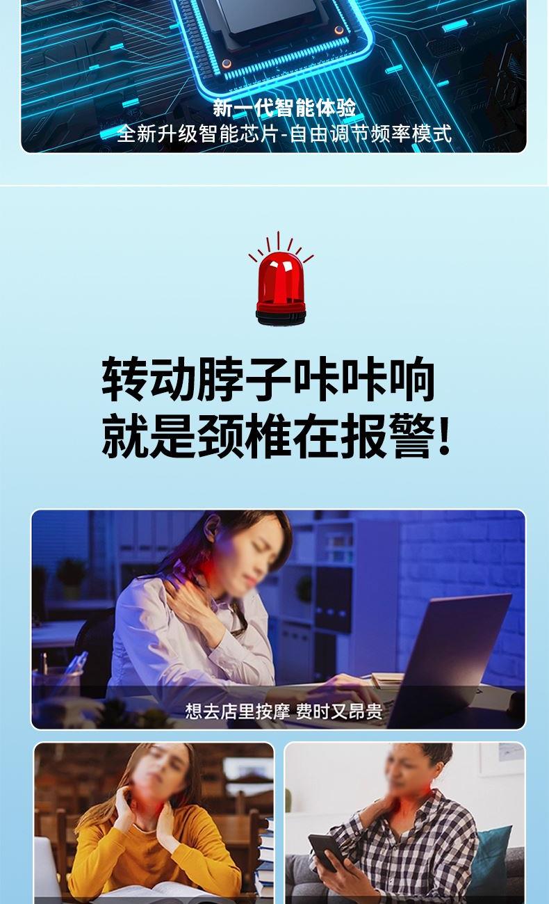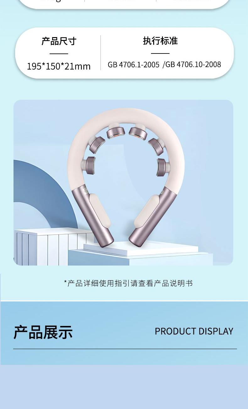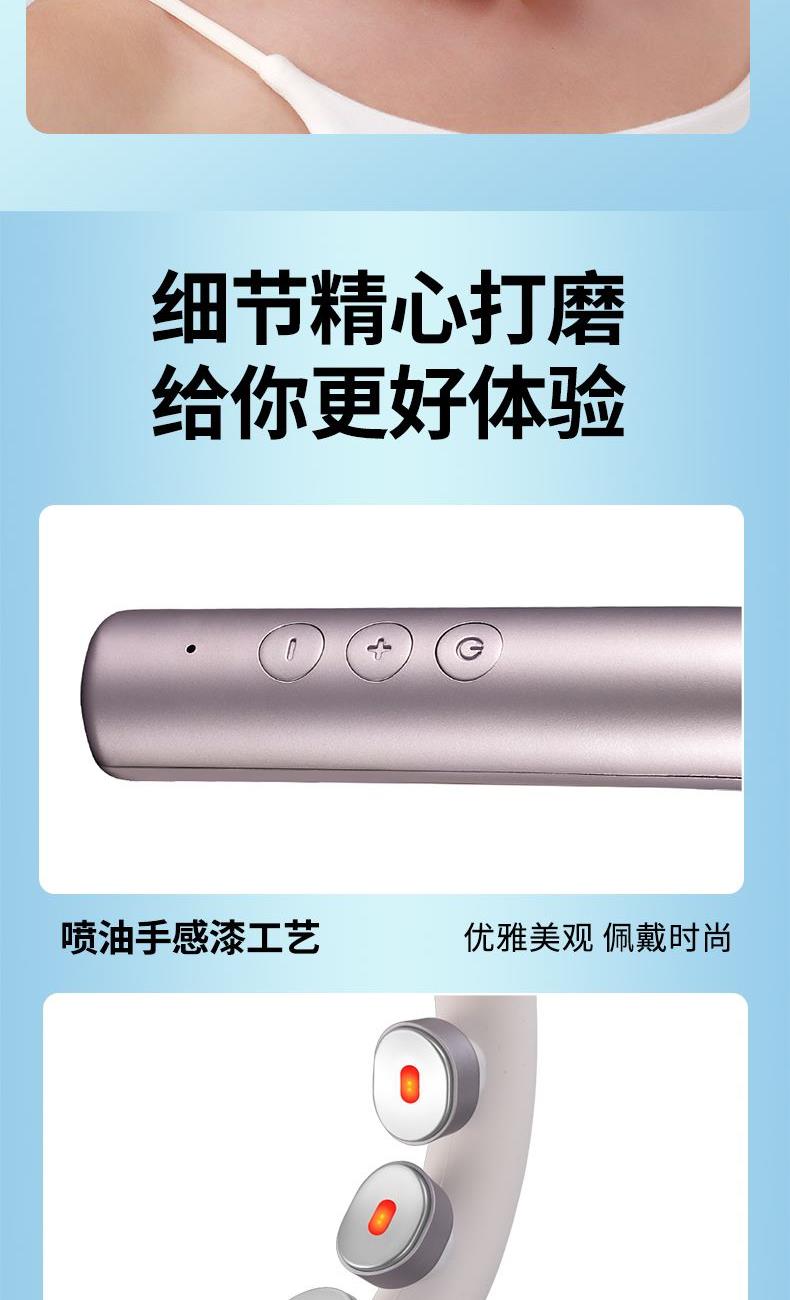 6 头立体按摩 + 360° 旋转:6 组按摩头搭配 360° 任性旋转设计,突破传统按摩局限,贴合颈椎曲线,覆盖后颈、肩周等酸痛区域,多维度模拟人手揉捏、按压,一次按摩即可缓解大面积肌肉僵硬 一键开启 42℃恒温热敷:无需复杂操作,一键启动热敷功能,暖流透过亲肤硅胶渗透颈肩,搭配脉冲、震动按摩同步作用,快速驱散肌肉寒意,秋冬使用暖颈更暖心,缓解酸痛效果翻倍 食品级软硅胶亲肤材质:按摩头与接触面均采用软硅胶材质,触感细腻亲肤,敏感肌使用无刺激,长期佩戴不闷汗、不压痕,贴合颈部时如同人手轻抚,舒适度远超普通塑料材质按摩仪 10 大模式 + 16 档力度 + 双频按摩:涵盖揉捏、捶打、脉冲等 10 大专业按摩模式,搭配 16 档细腻力度调节,再加上低 / 中双频按摩可选,无论是日常放松、运动后舒缓,还是针对性缓解颈椎不适,都能匹配需求,全家老少都能用 无线遥控 + 随心调节:配备无线遥控器,无需低头操作,躺卧、办公时随手就能切换模式、调节力度,远距离操控不耽误追剧、工作,享受按摩更自由,懒人必备便捷设计 智能芯片动态调节技术:内置高灵敏智能芯片,实时检测电极片与皮肤的贴合度,根据皮肤接触状态动态调整脉冲功率,避免高阻抗下的刺痛感,让脉冲按摩全程平稳舒适,新手也能轻松驾驭 多技术融合仿真人手体验:整合热敷、脉冲、震动三大核心技术,搭配智能芯片模拟专业按摩师手法,从浅层放松到深层舒缓,每一下按摩到位,足不出户就能享受线下理疗店级别的颈椎护理
