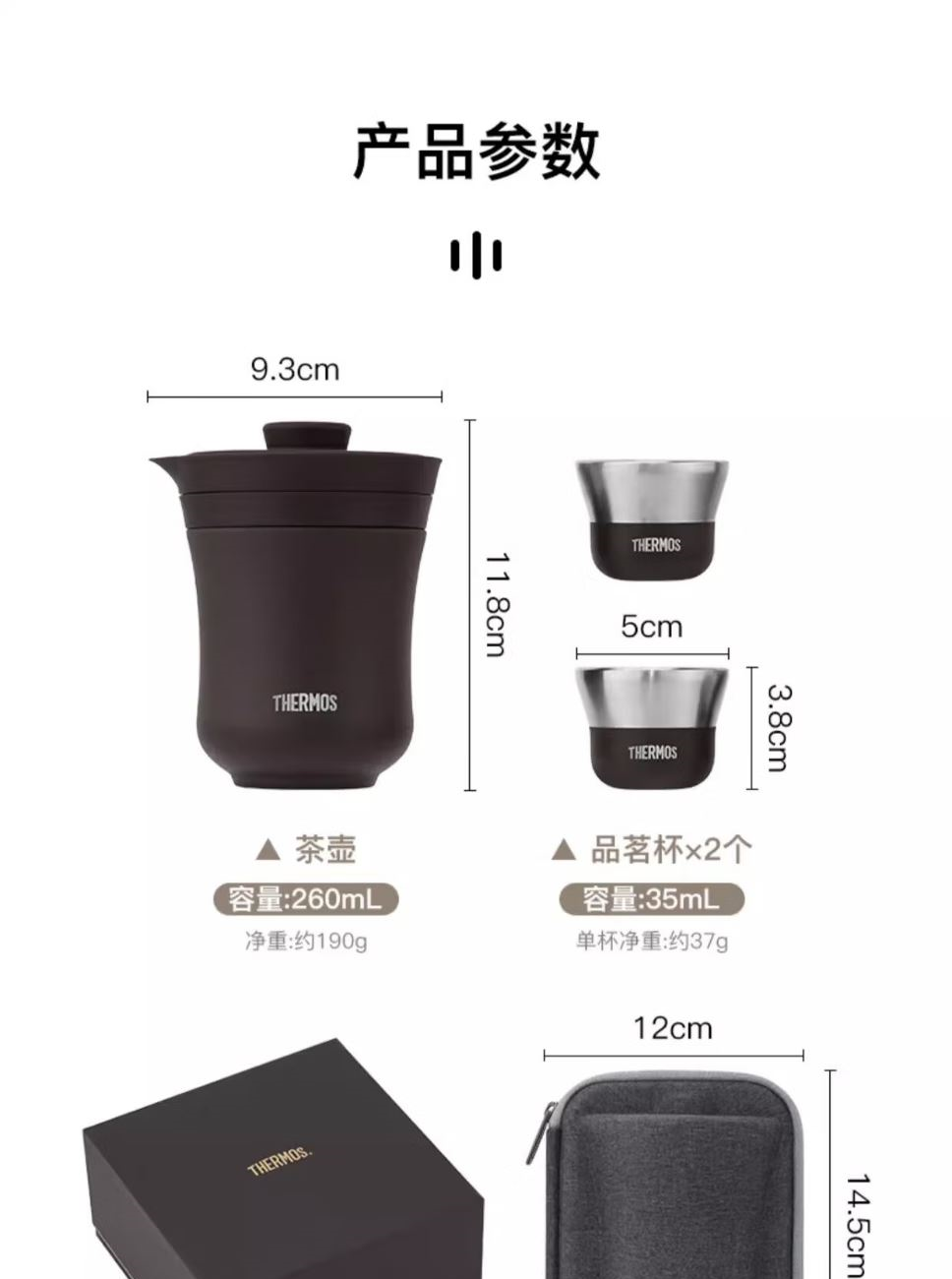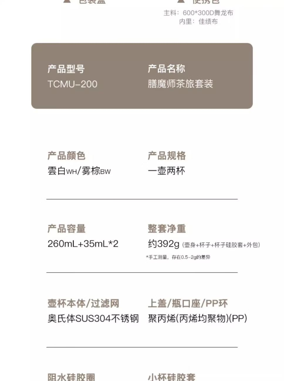 颜 色:BW咖色 WH白色 容 量:260ml+35ml+35ml毫升 保温效力:茶壶28℃以上(6小时) 茶杯 35℃以下(10分钟外壳中部) 外管材质:304不锈钢 内管材质:304不锈钢 密封圈:食品级硅胶 杯盖材质:食品级PP 包装:礼盒装 【常规为咖色白色,其他颜色或者陶瓷图层详询】