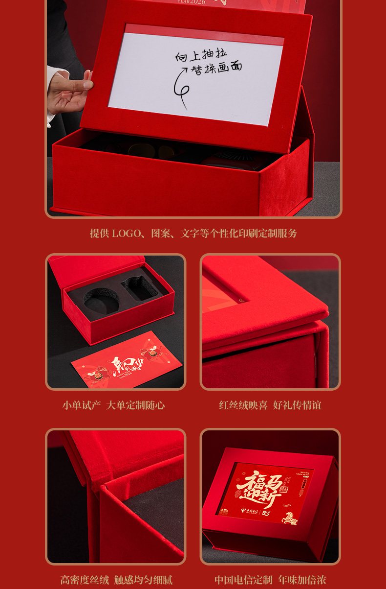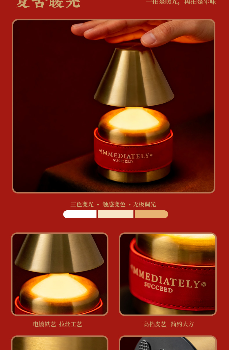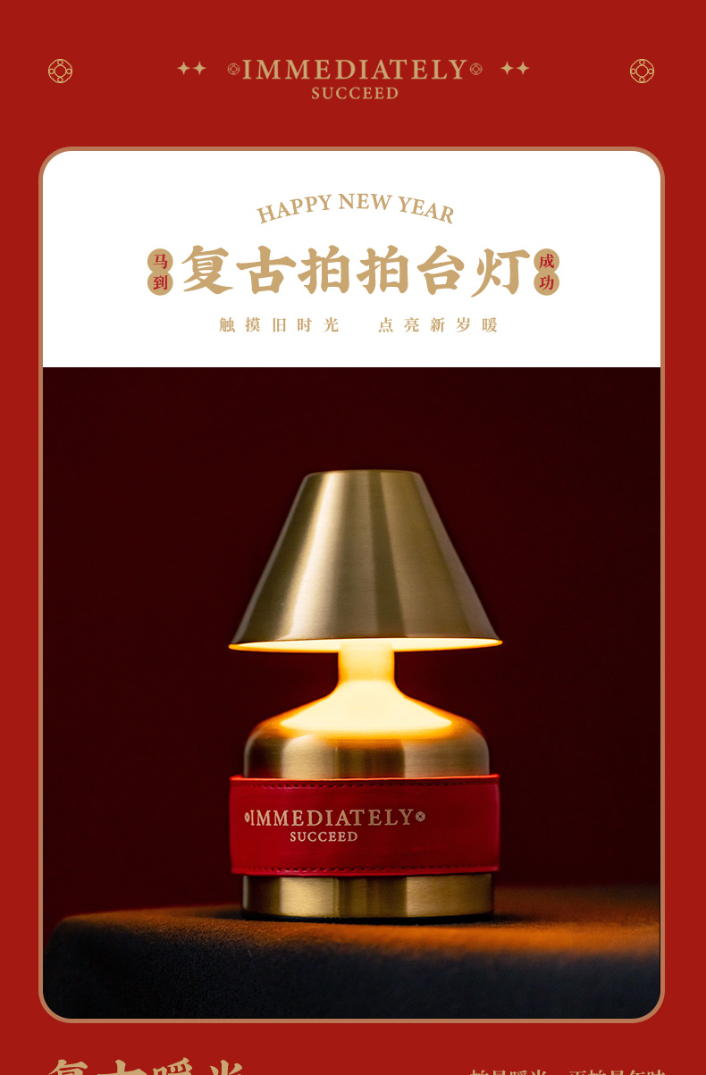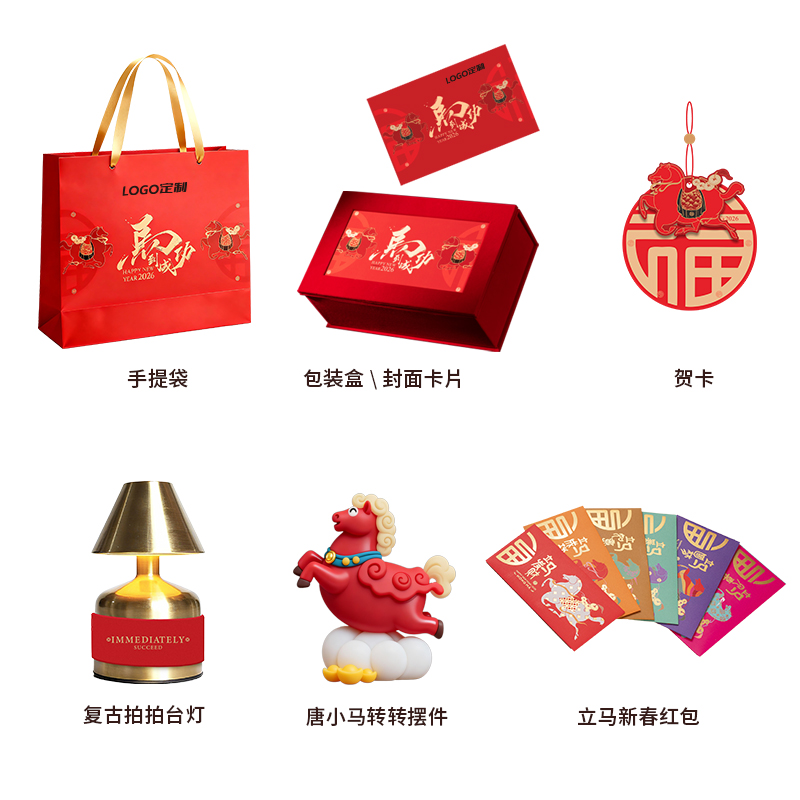 1、复古拍拍小台灯:三色变光 触感变色 无极调光 2、马到成功桌面摆件 3、新年红包*6:开启新年好运程 4、马到成功 六福常伴礼C 5、绒面礼盒:日历功能、收纳功能 用完不闲置 注:礼盒可专版定制画面