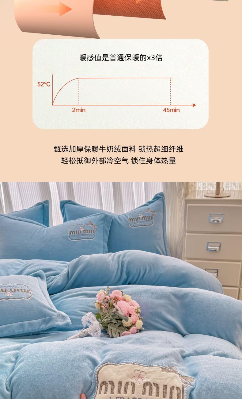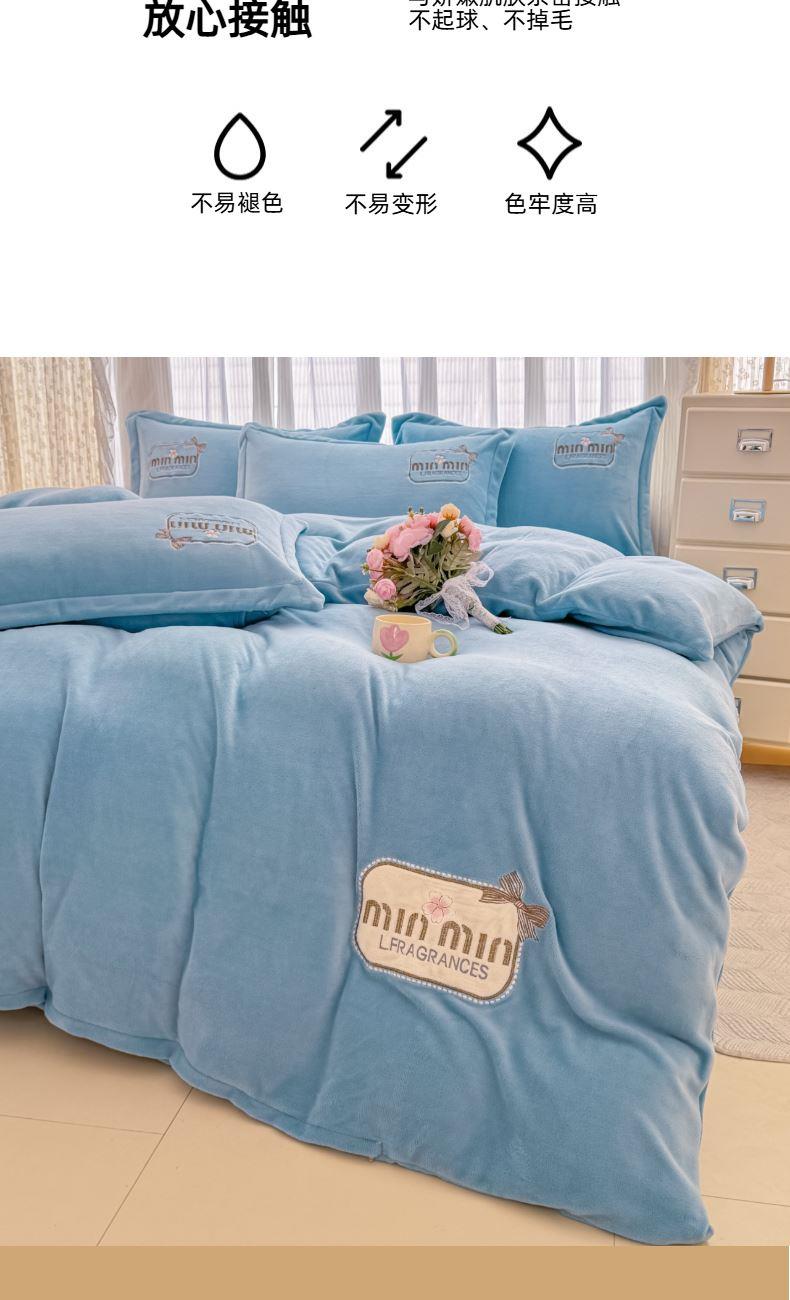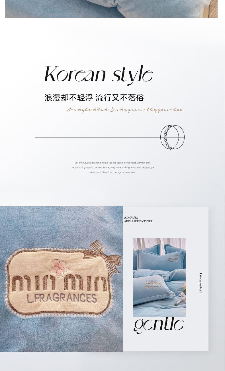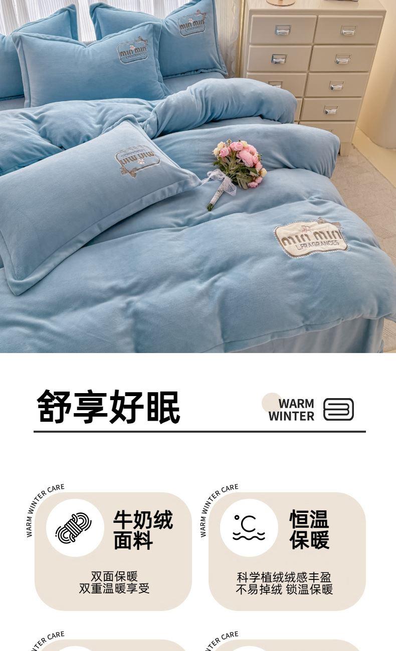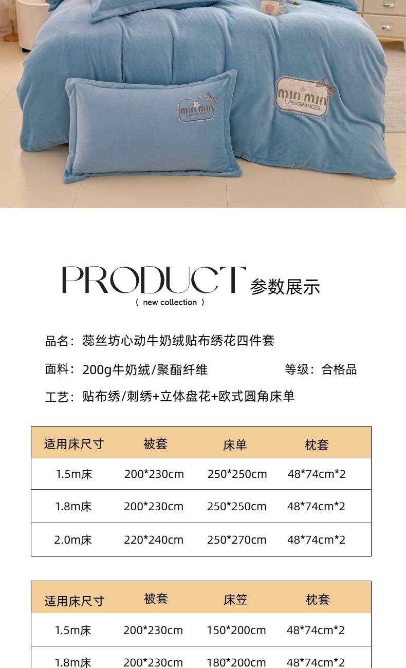 面料:200克牛奶绒 工艺:贴布绣/刺绣+立体盘花+欧式圆角床单 花色:心动紫、心动玉色、心动天蓝、心动灰、心动粉 规格:1.5米-1.8米床适用 被套200*230cm*1 床单230*245cm*1 枕套48*74cm*2 卖点:选用200g牛奶绒•质地蓬松•透气性好•温暖舒适 精美贴布绣/刺绣搭配立体盘花, 升温迅速,速暖控温,牛奶绒面料绒毛密度小,卷曲度低,能够防止热量散失。在逐渐变冷的秋冬季节,暖和的像恋人的拥抱。