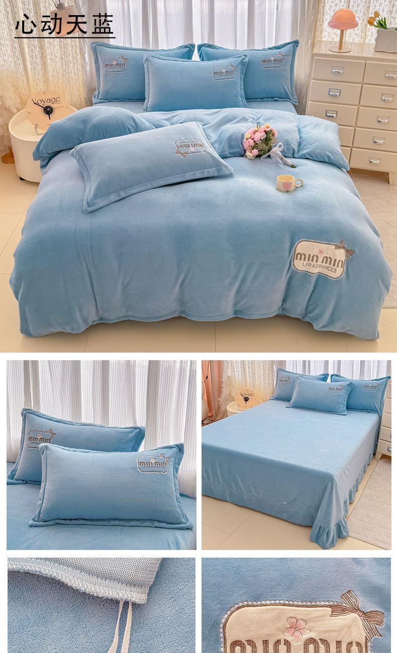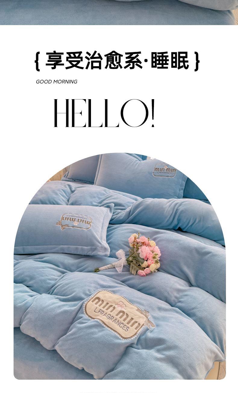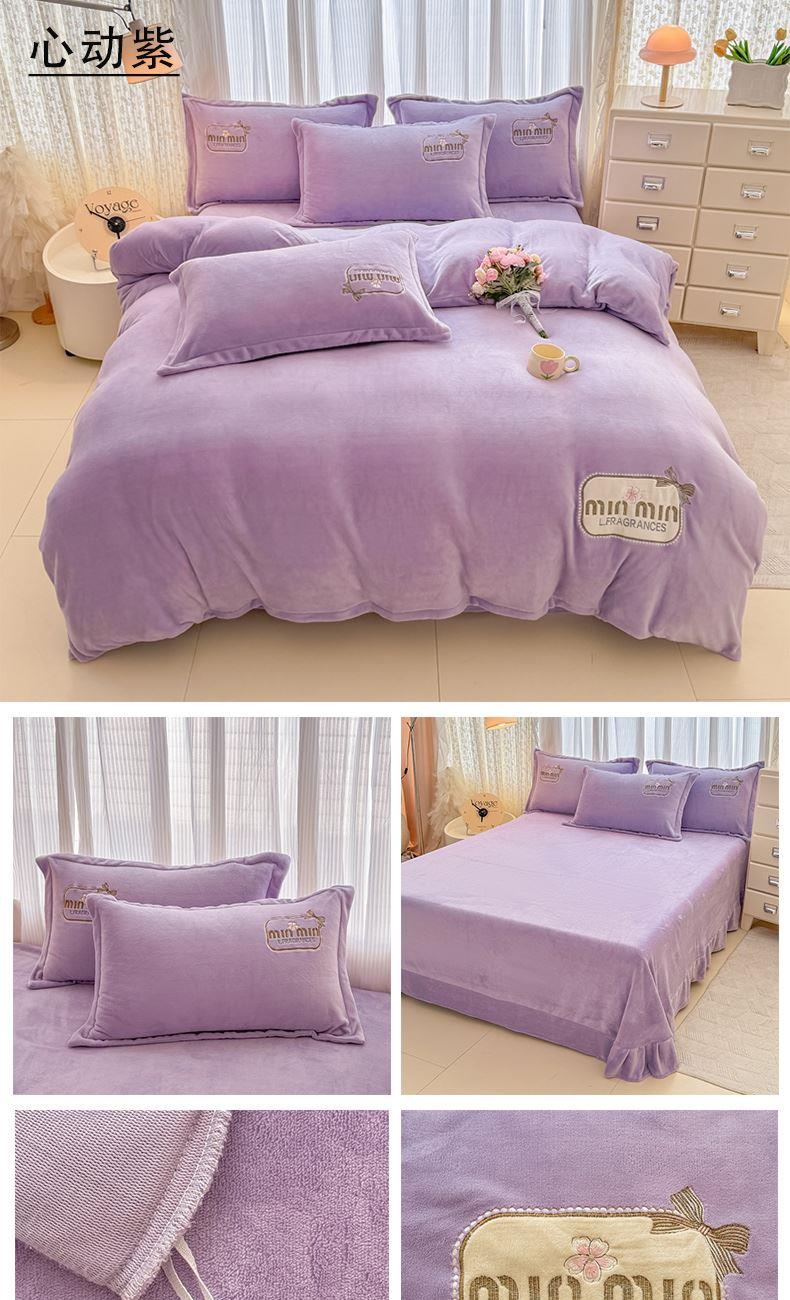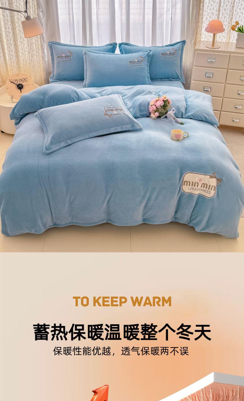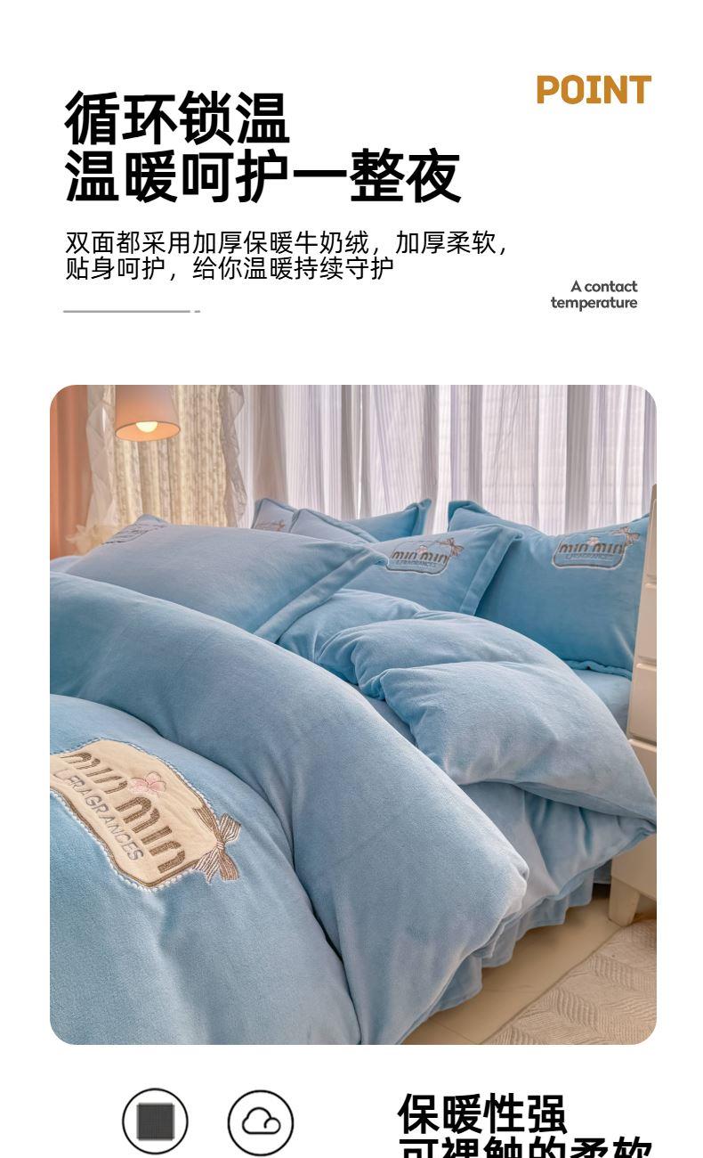 面料:200克牛奶绒 工艺:贴布绣/刺绣+立体盘花+欧式圆角床单 花色:心动紫、心动玉色、心动天蓝、心动灰、心动粉 规格:1.5米-1.8米床适用 被套200*230cm*1 床单230*245cm*1 枕套48*74cm*2 卖点:选用200g牛奶绒•质地蓬松•透气性好•温暖舒适 精美贴布绣/刺绣搭配立体盘花, 升温迅速,速暖控温,牛奶绒面料绒毛密度小,卷曲度低,能够防止热量散失。在逐渐变冷的秋冬季节,暖和的像恋人的拥抱。
