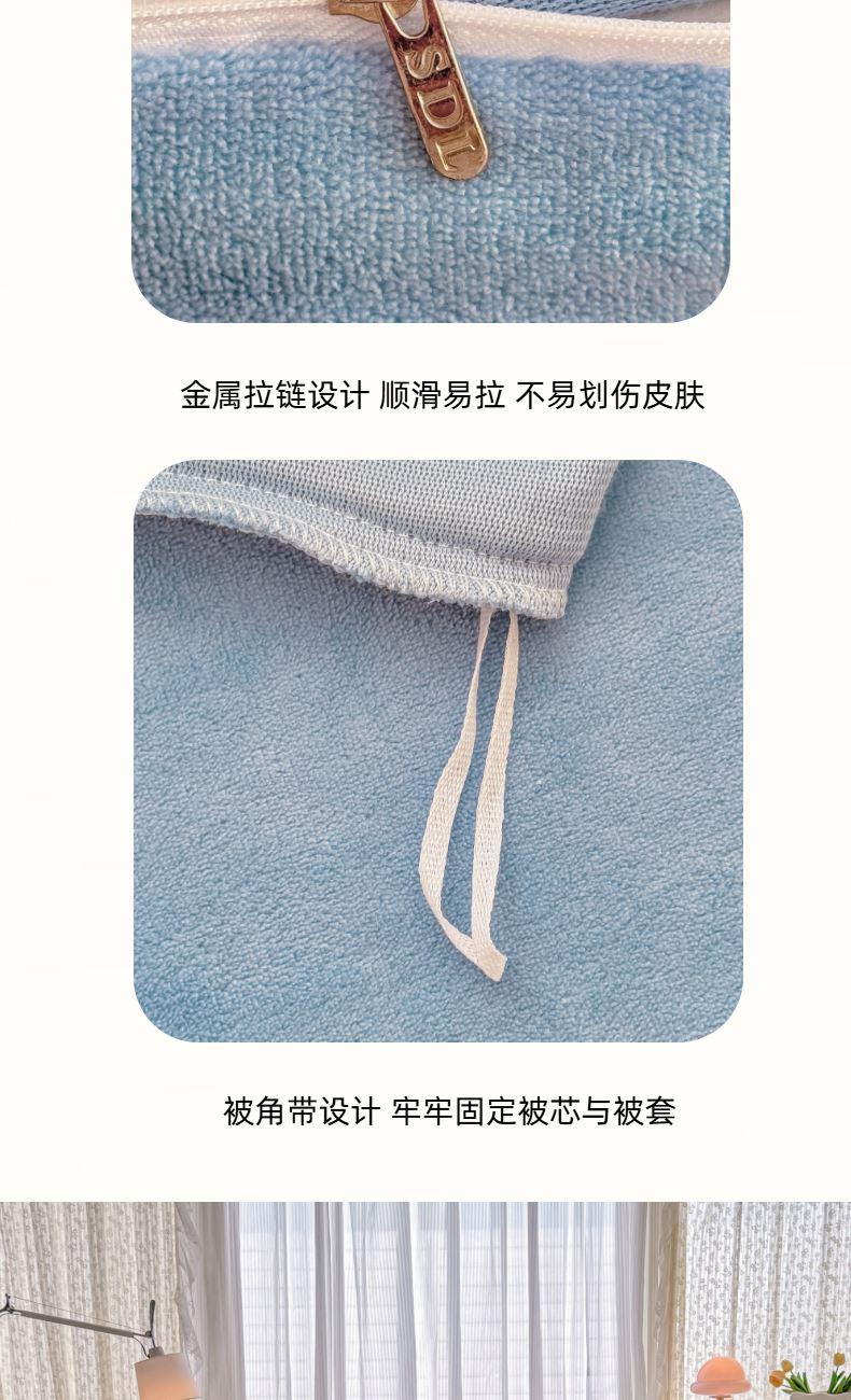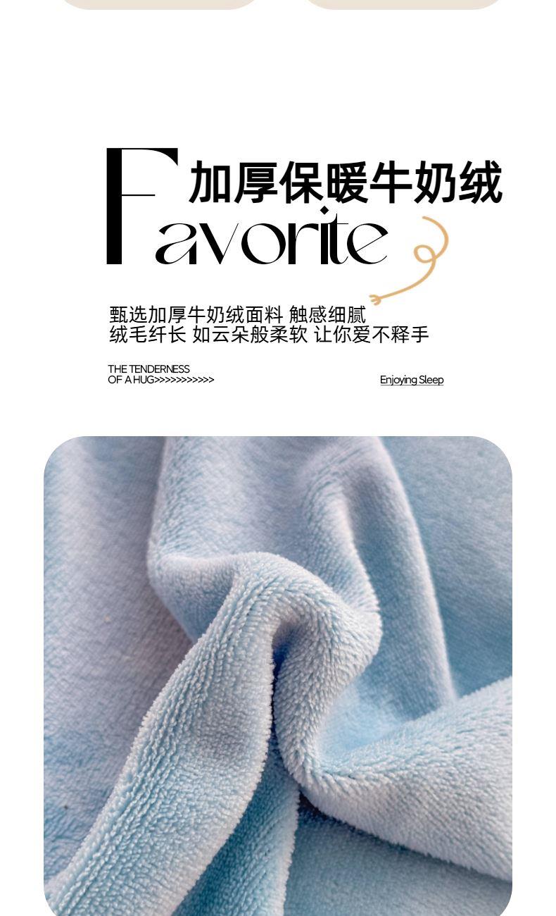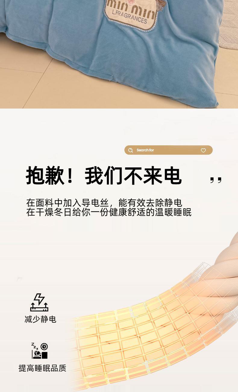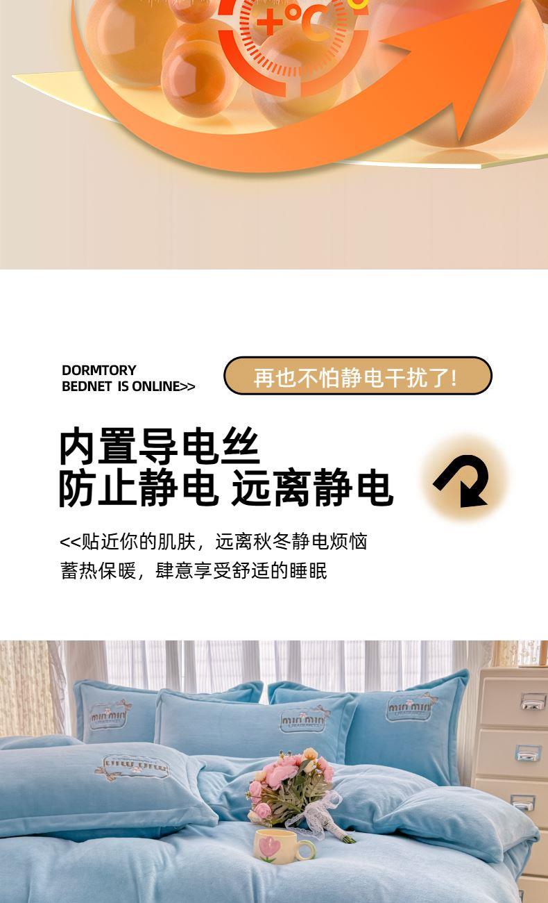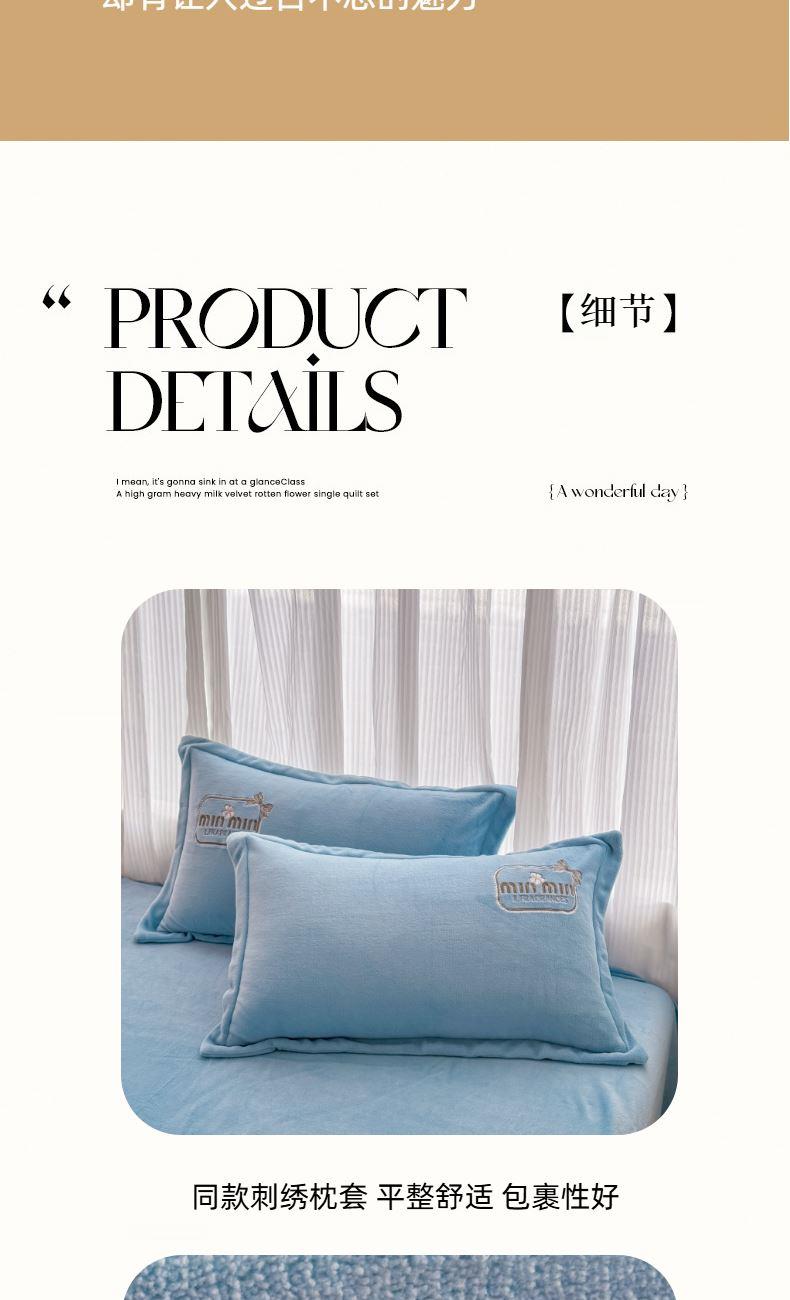 面料:200克牛奶绒 工艺:贴布绣/刺绣+立体盘花+欧式圆角床单 花色:心动紫、心动玉色、心动天蓝、心动灰、心动粉 规格:1.5米-1.8米床适用 被套200*230cm*1 床单230*245cm*1 枕套48*74cm*2 卖点:选用200g牛奶绒•质地蓬松•透气性好•温暖舒适 精美贴布绣/刺绣搭配立体盘花, 升温迅速,速暖控温,牛奶绒面料绒毛密度小,卷曲度低,能够防止热量散失。在逐渐变冷的秋冬季节,暖和的像恋人的拥抱。