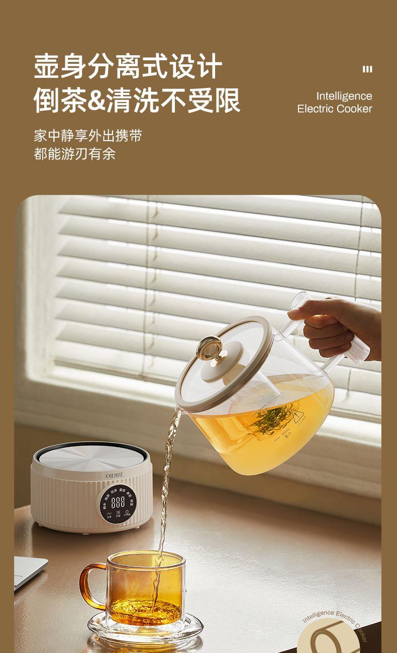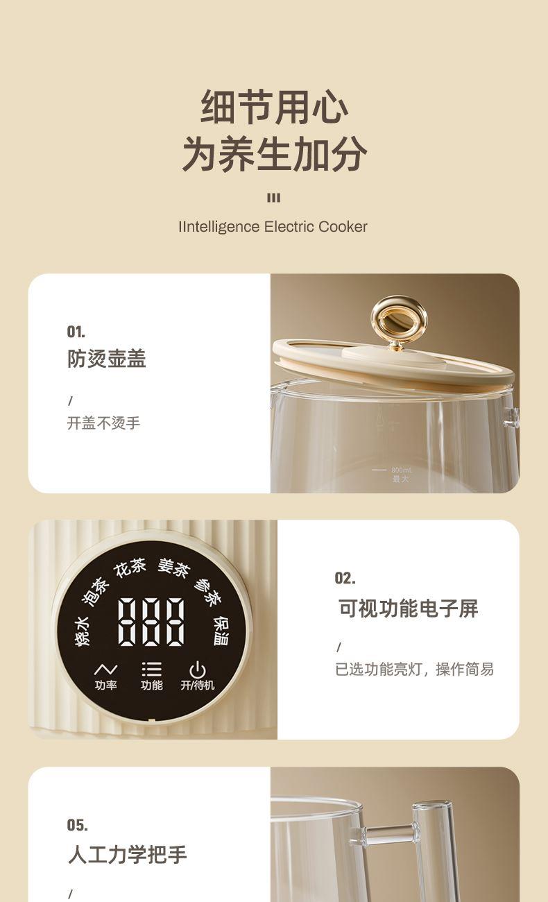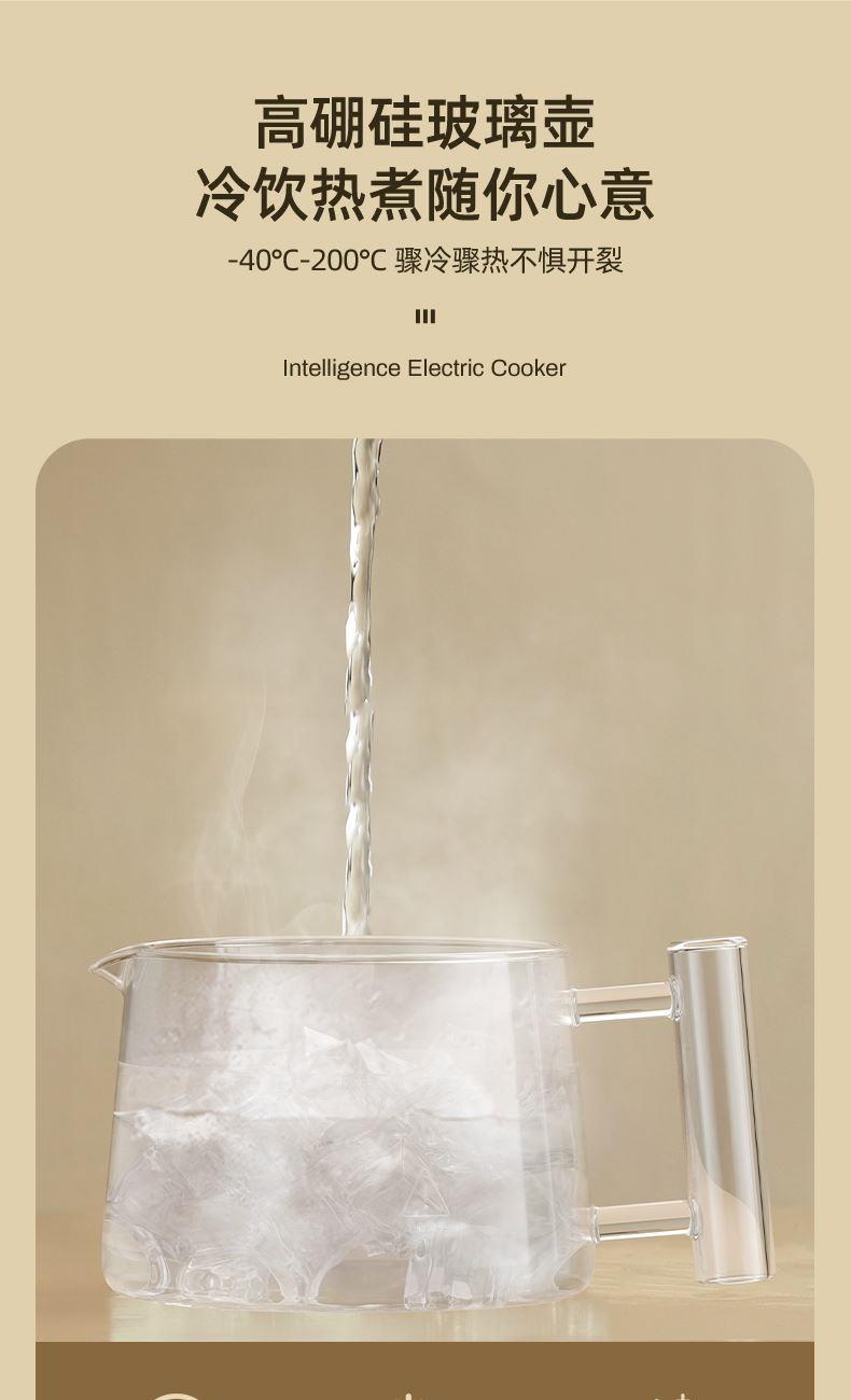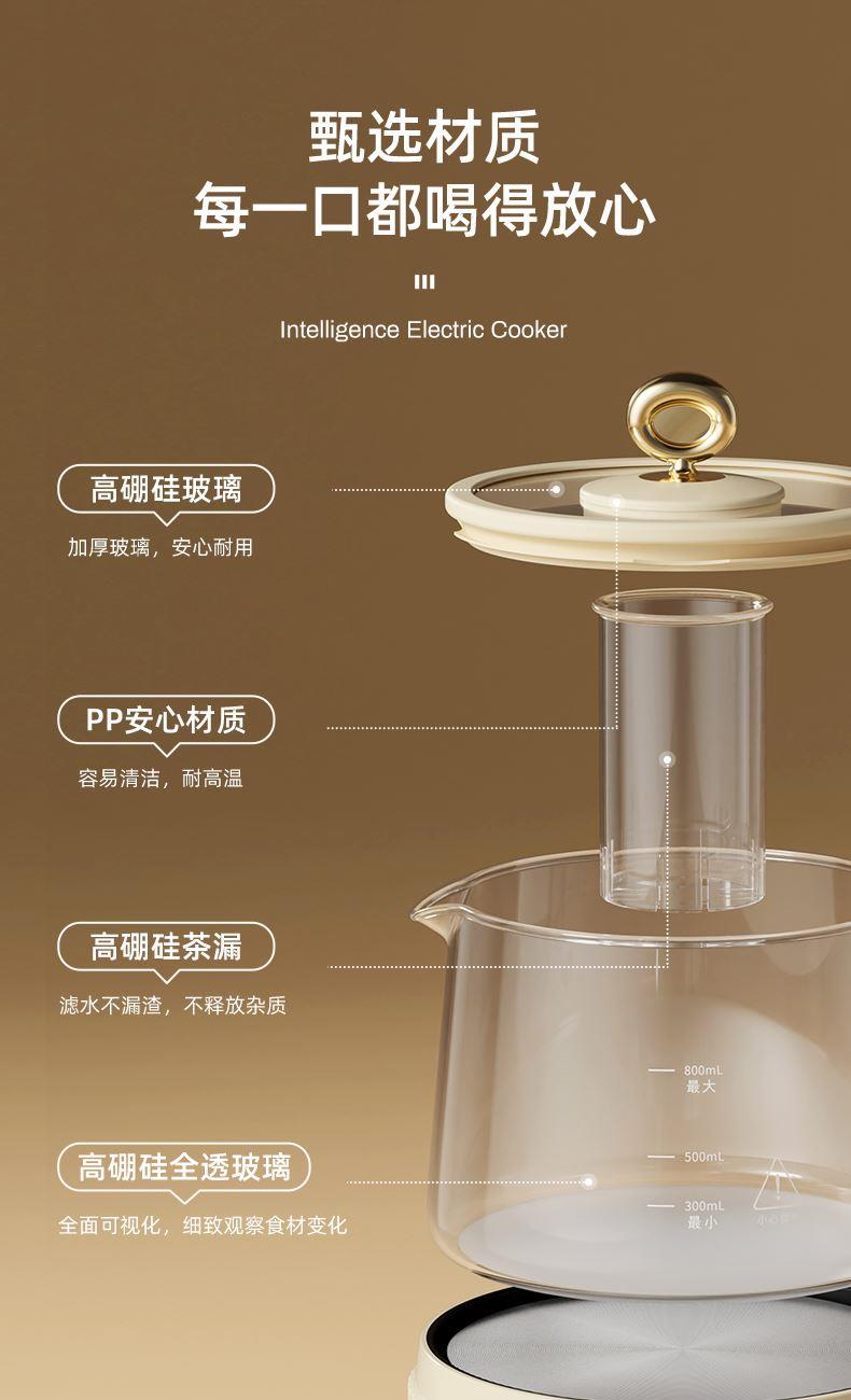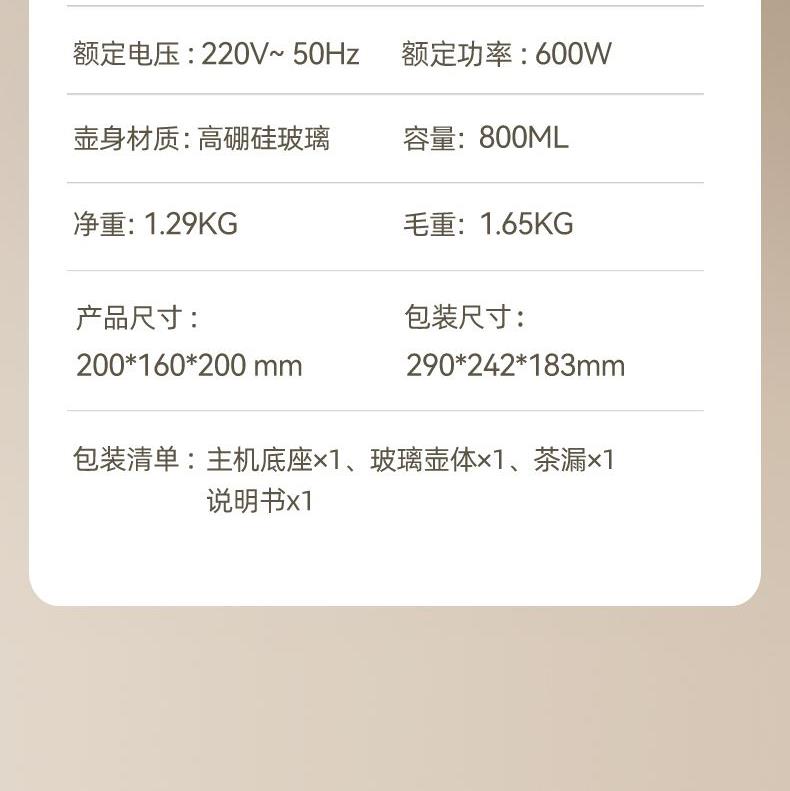主要材质:PP+高硼硅壶身 电压:220V 功率:600W 容量:800ml 1、800ML容量,适合1-2人使用 2、高硼硅玻璃材质,0水垢易清洗 3、分离式设计,玻璃壶体易清洗 4、4小时持续保温 5、6大功能,满足不同泡茶方式 6、一键触控,操作简单 7、搭配玻璃滤筒,支持分隔煮