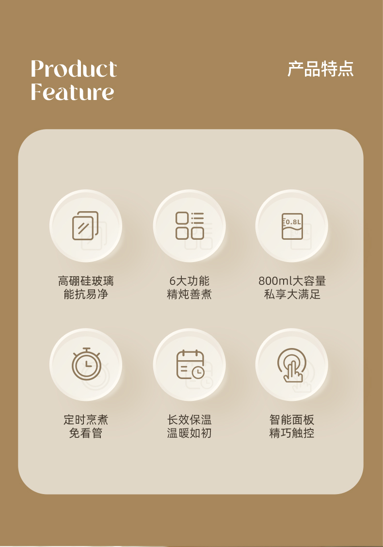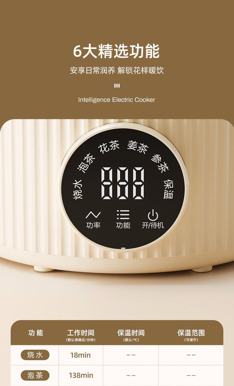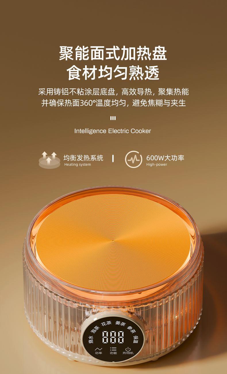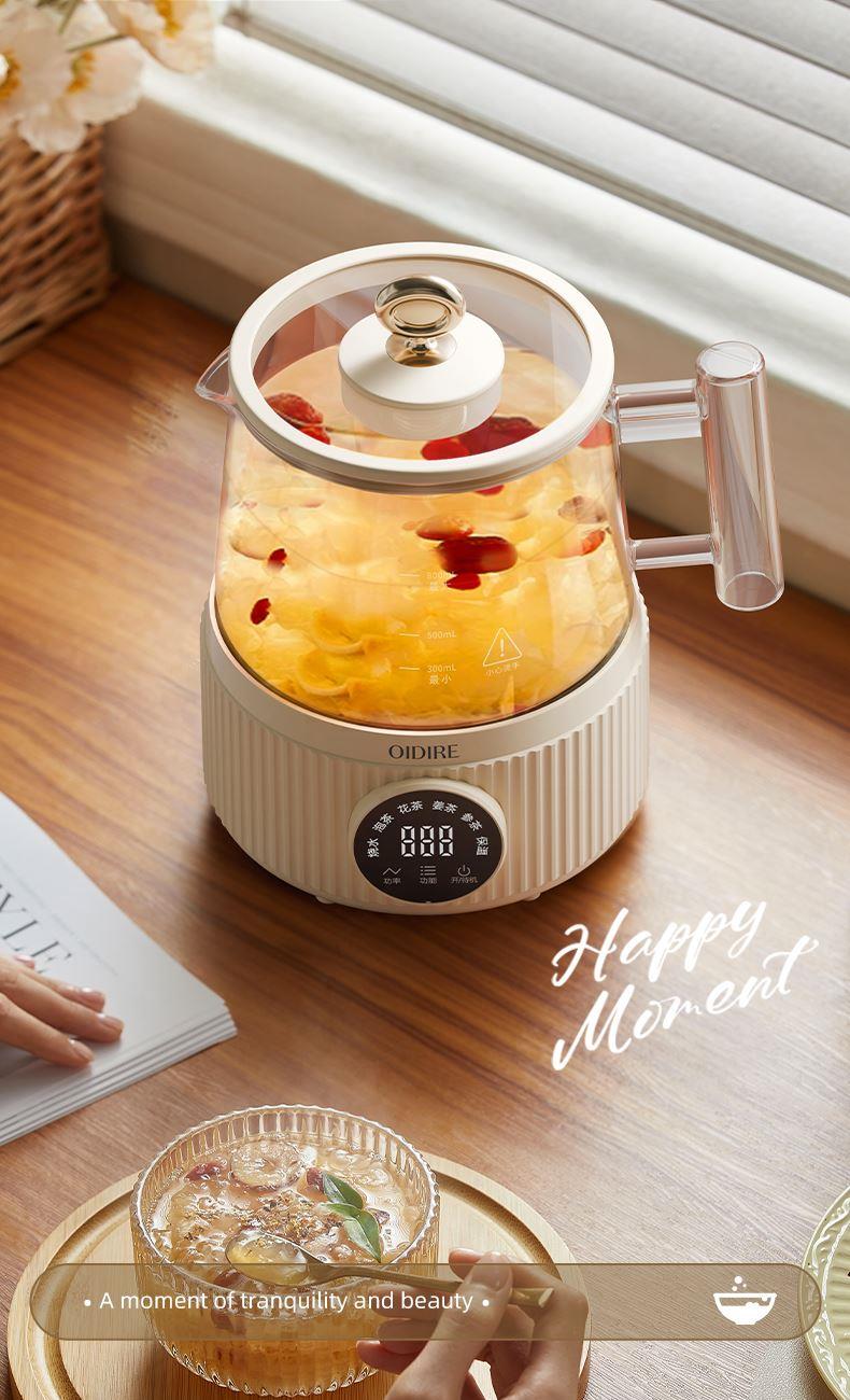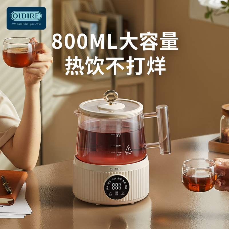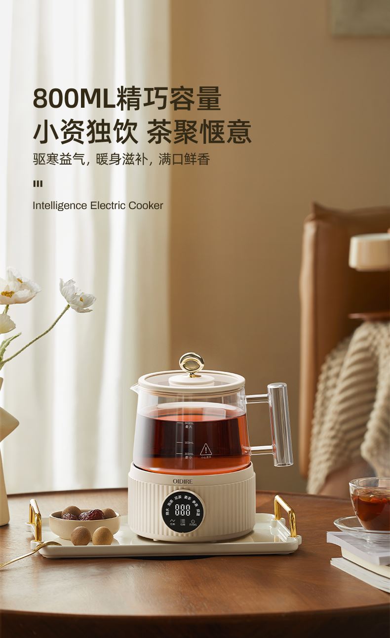主要材质:PP+高硼硅壶身 电压:220V 功率:600W 容量:800ml 1、800ML容量,适合1-2人使用 2、高硼硅玻璃材质,0水垢易清洗 3、分离式设计,玻璃壶体易清洗 4、4小时持续保温 5、6大功能,满足不同泡茶方式 6、一键触控,操作简单 7、搭配玻璃滤筒,支持分隔煮