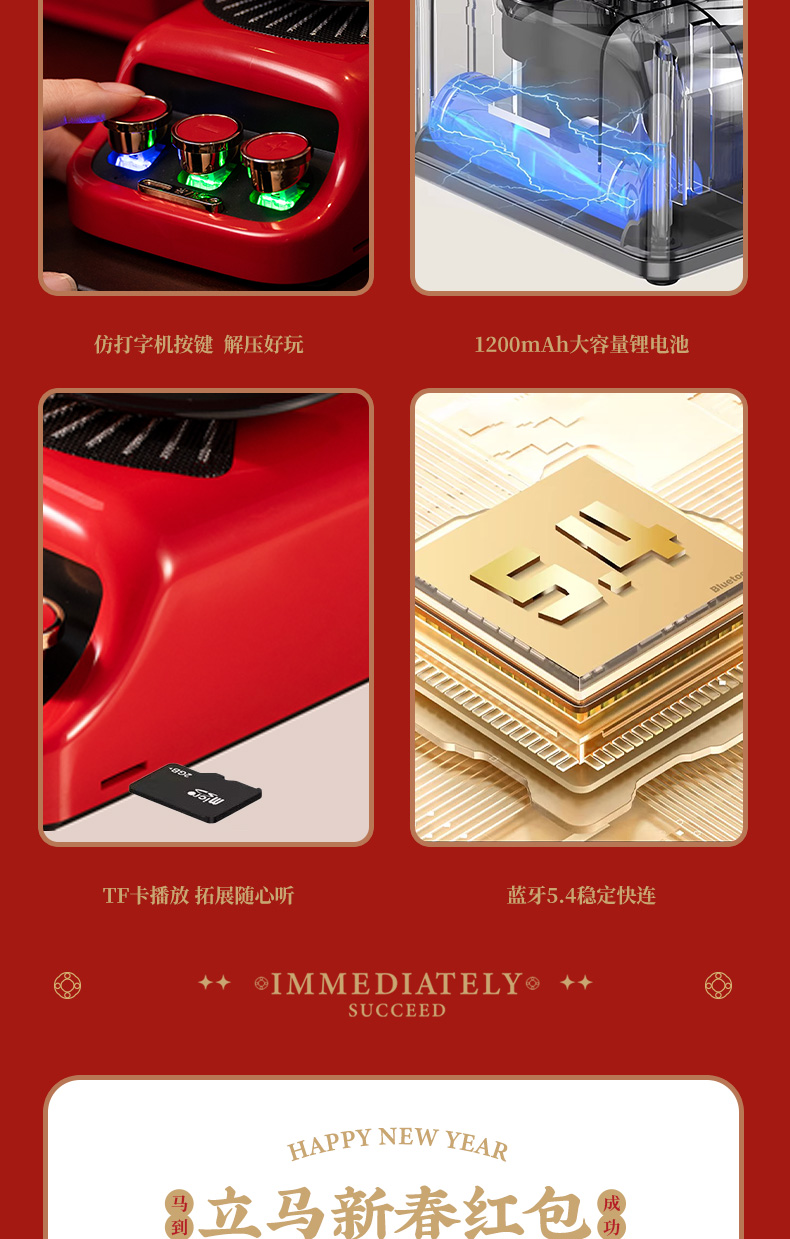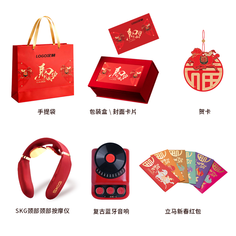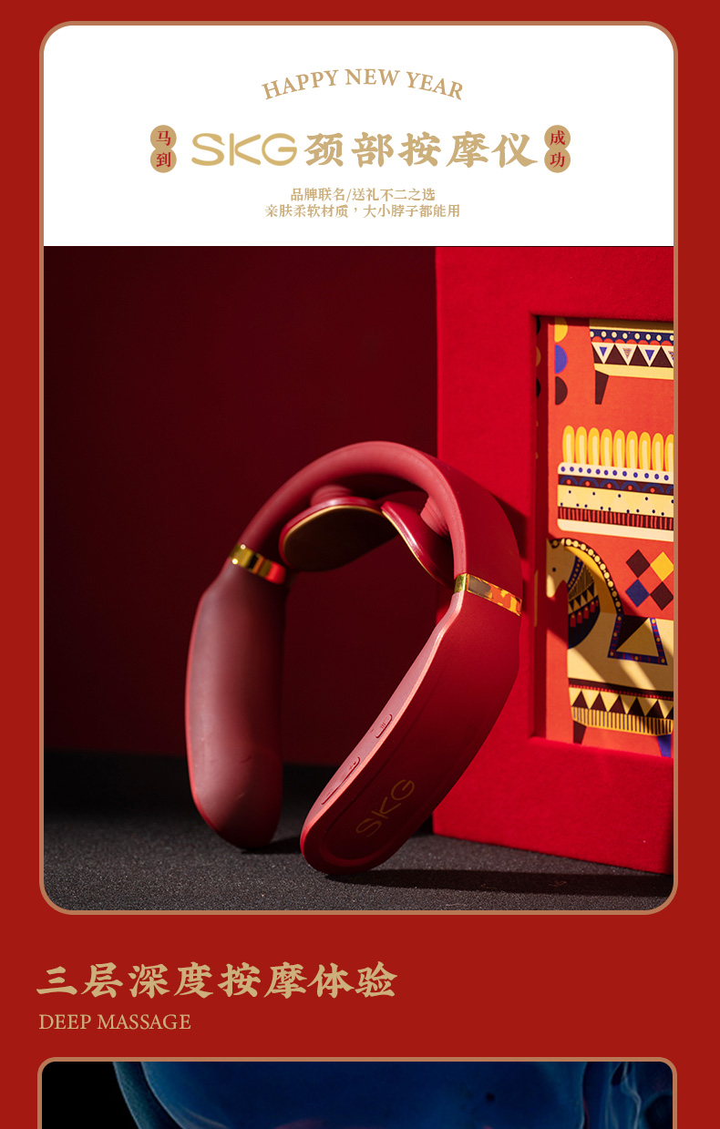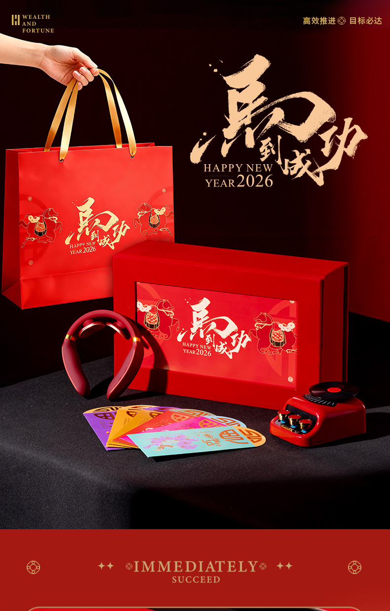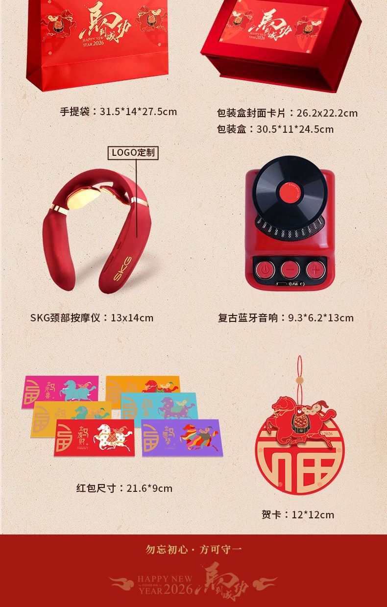 1、SKG颈部按摩仪给奋斗者贴心的守护: 四大模式、15档力度调节、三档温度随心调节双脉冲按摩 2、好运复古蓝牙音箱:蓝牙、氛围灯、趣味按键 3、新年红包*6:开启新年好运程 4、绒面礼盒:日历功能、收纳功能 用完不闲置,