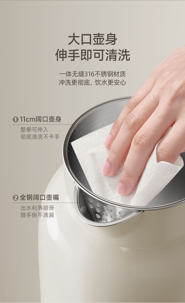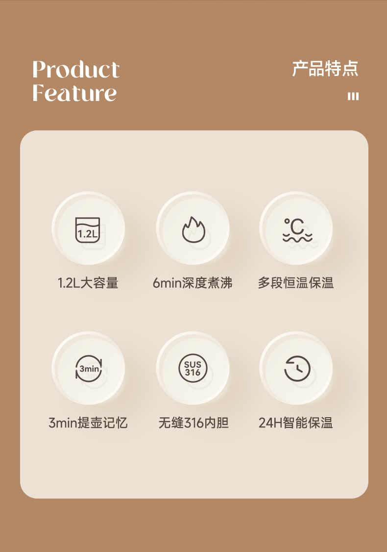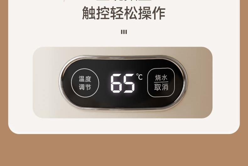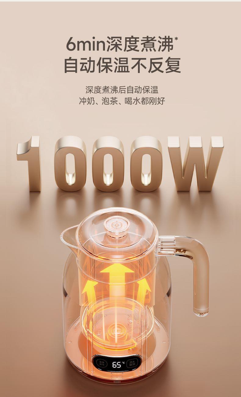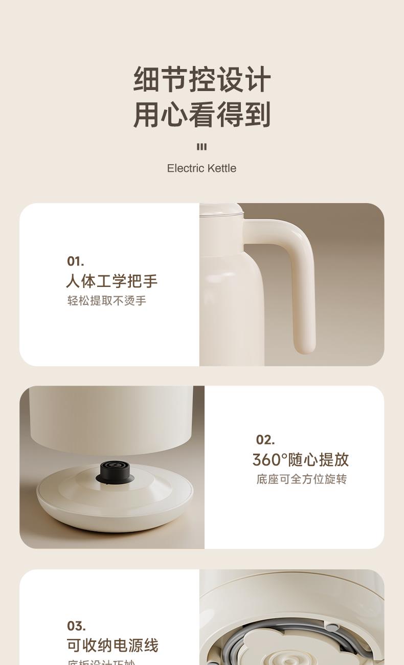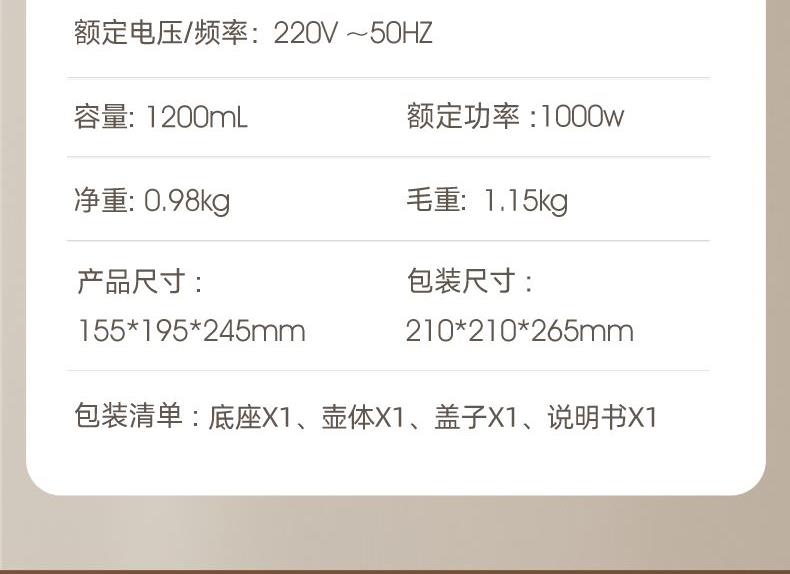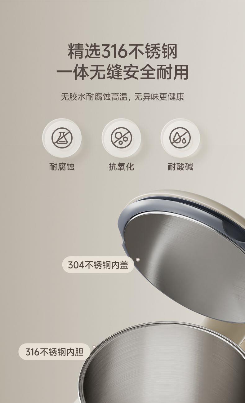 主要材质:PP+316无缝内胆 电压:220V 功率:1000W 容量:1.2L 颜色:里米尼白 1、1.2L大容量,满足饮水需求 2、316不锈钢无缝内胆,材质安全放心 3、隔热设计,壶身表面不烫手 4、数码屏显示,触控按键 5、底部设有感温探头,实时检测内部水温 6、过热保护,安全无忧 7、24小时自动保温