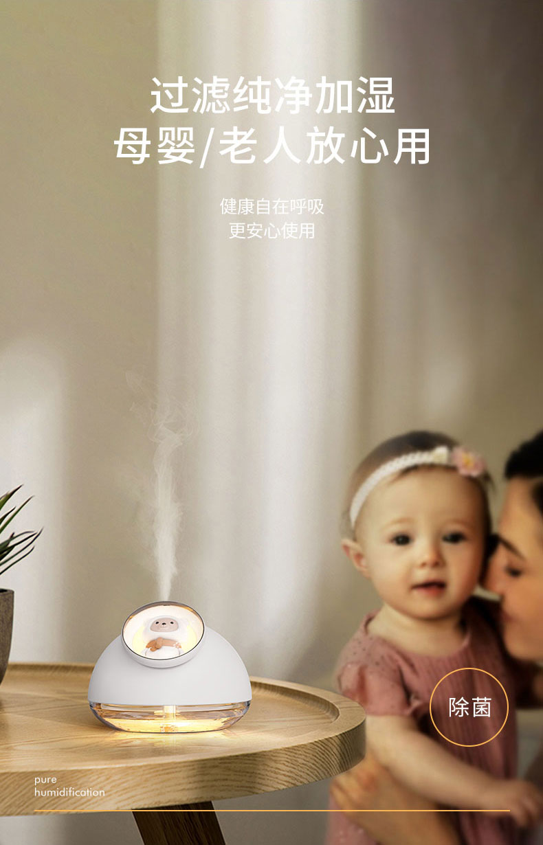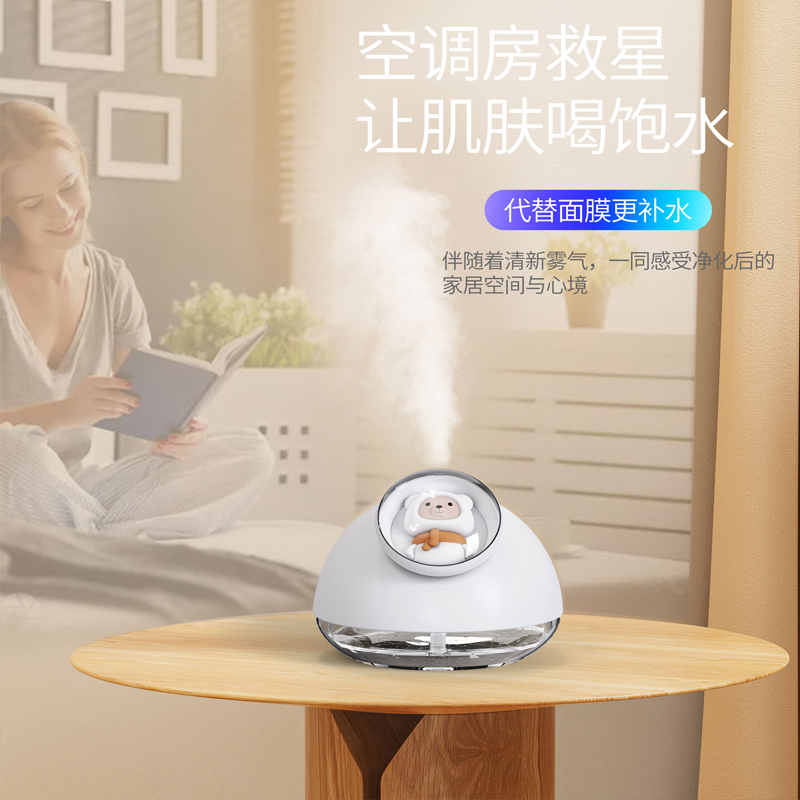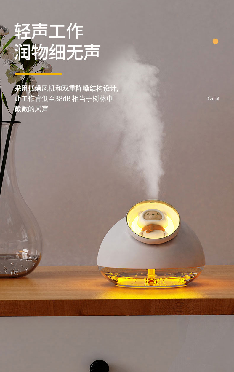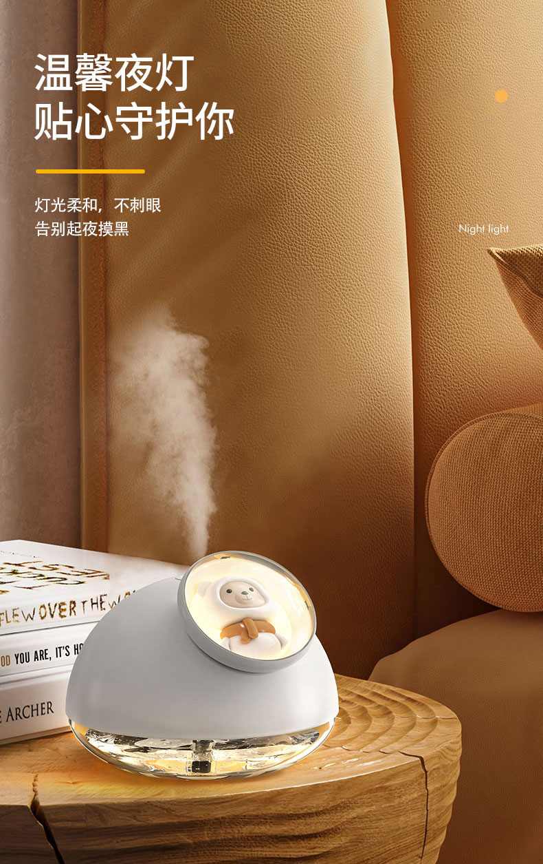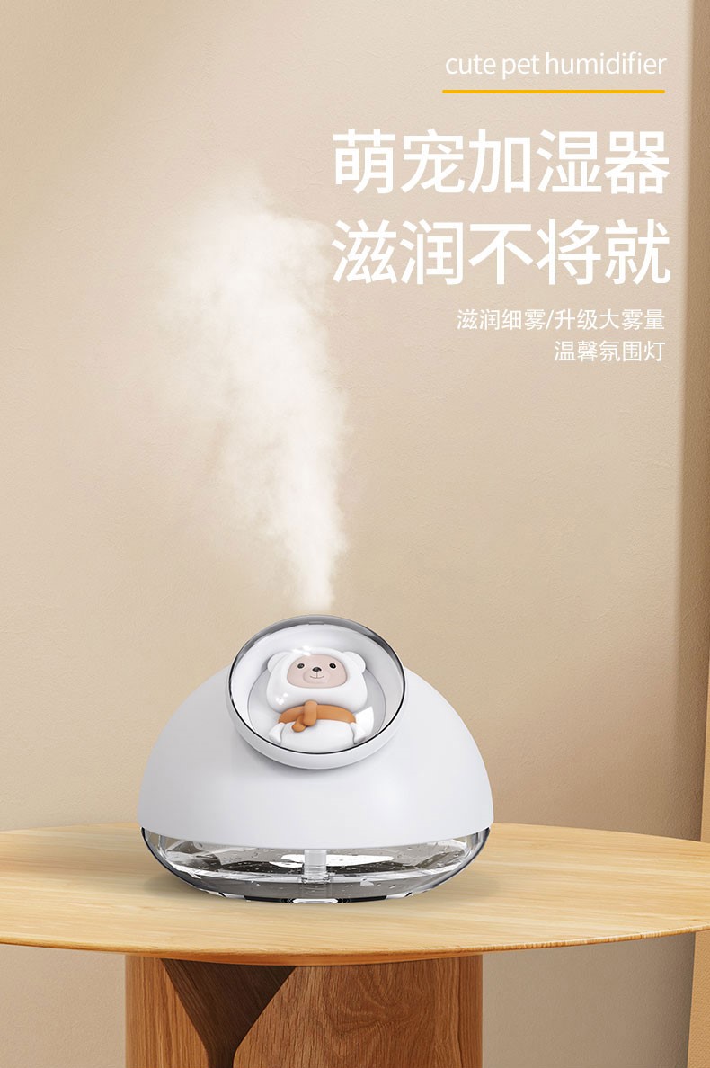 笨笨熊A 桌面喷雾加湿器 颜色:象牙白 材质:ABS 尺寸:119*125*94mm 容量:160mL 包装:彩盒包装 【功能特点】: 笨笨熊可爱萌宠可添加香精 低噪风机润物细无声 持续/间歇 双模式 柔光温馨小夜灯 160mL容量加湿