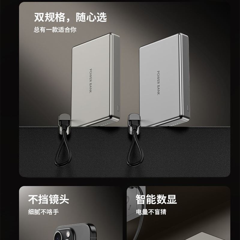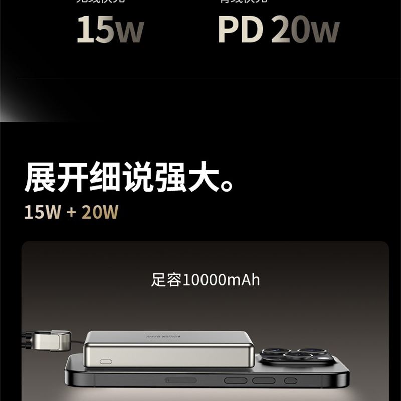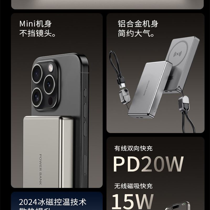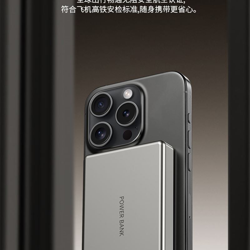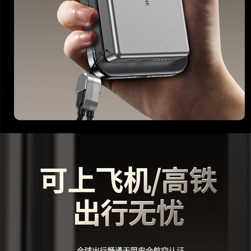 10000毫安22.5W双向超级快充 15W超强磁吸无线充电 铝合金超薄机身 自带双向快充数据线 符合民航局标准,可随身携带 颜色:枪灰色 材质:铝合金 容量:10000毫安 尺寸:103*65*15mm(10000毫安)