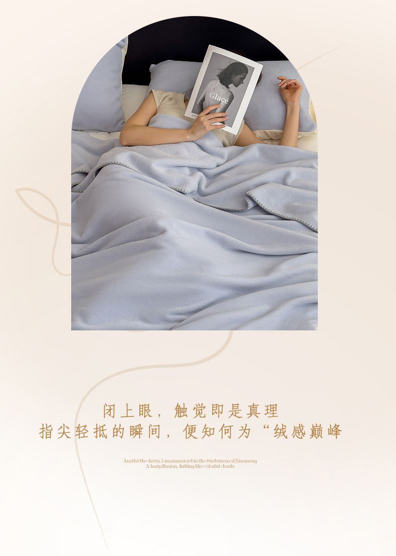 规格:180*200cm 面料:獭獭绒 克重:1100g 产品包装:精美礼盒 包装尺寸:48*35*16cm 1.獭獭绒面料纤维细腻蓬松,触感柔软、顺滑亲肤。 2.面料柔和细腻,保暖性突出,轻盈不压身,盖在身上无压迫感。