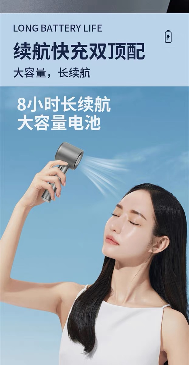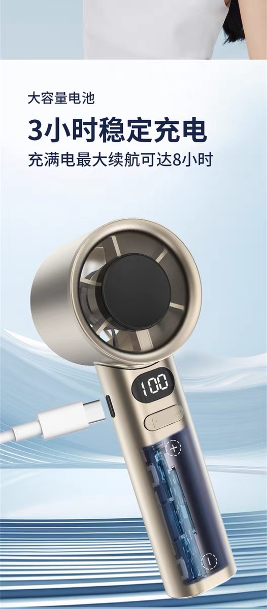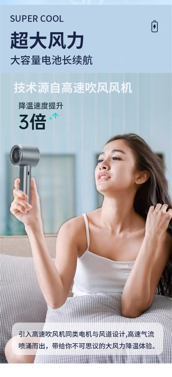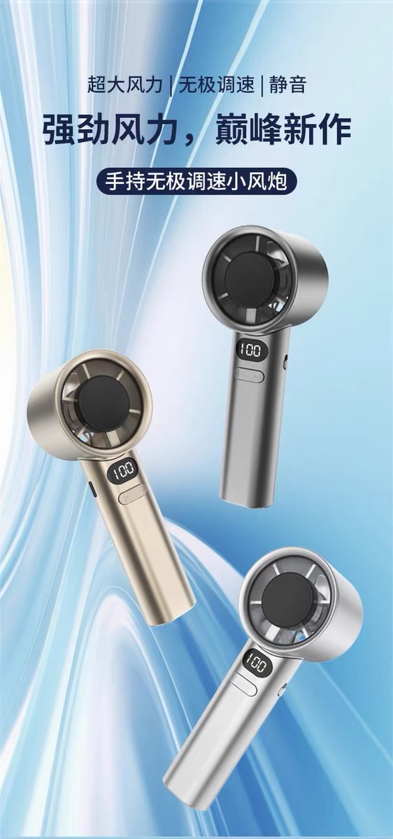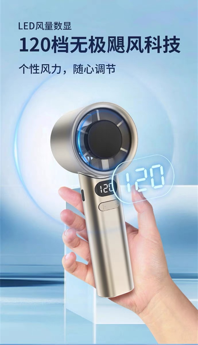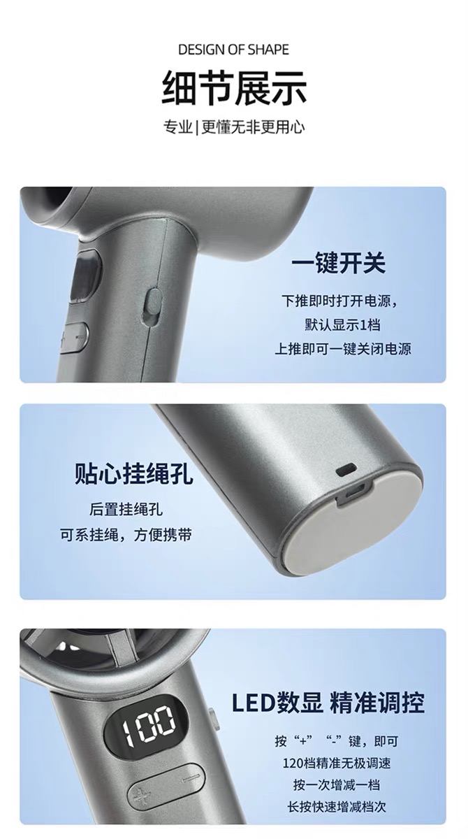 产品材质:ABS 产品功能:120档风力调节 产品容量:400mAh 产品尺寸:56*57*160mm 产品颜色:白色,灰色,金色 智能数显设计,120档风速,采用高性能锂电池,续航更持久;一键开关,使用更方便。