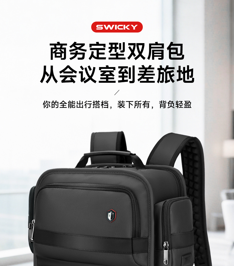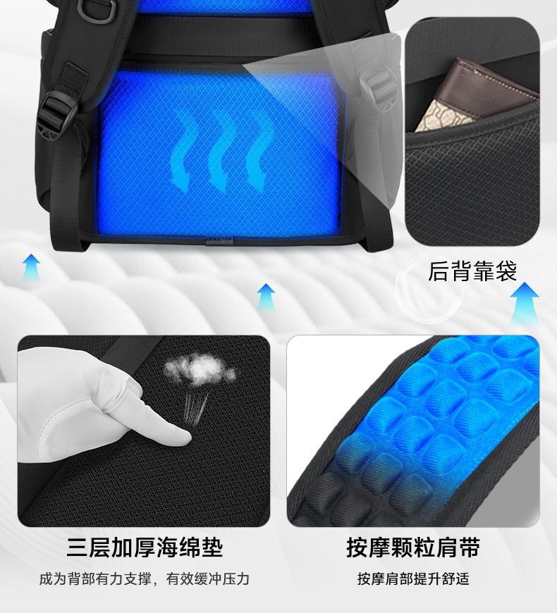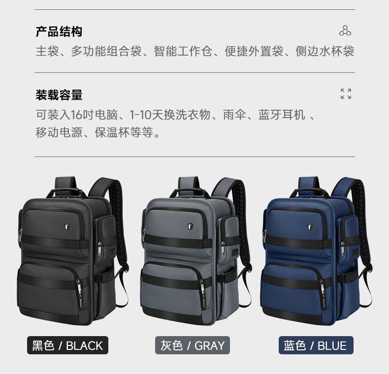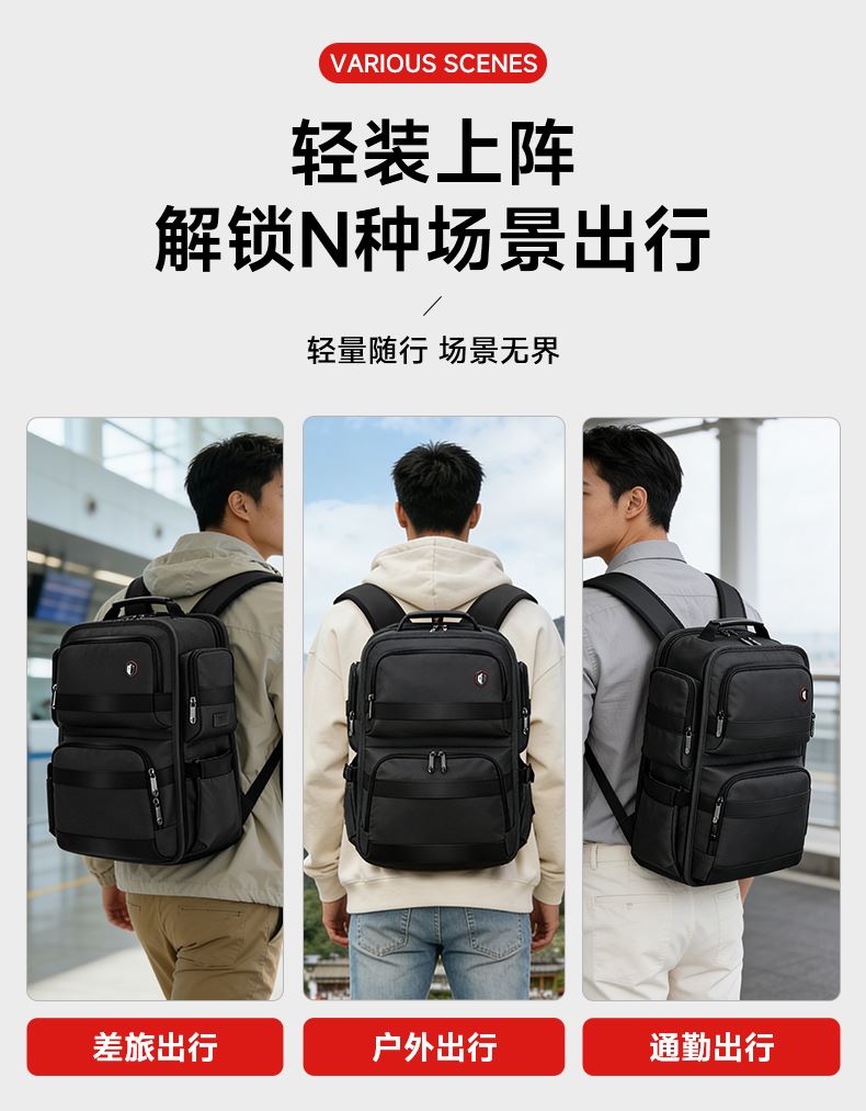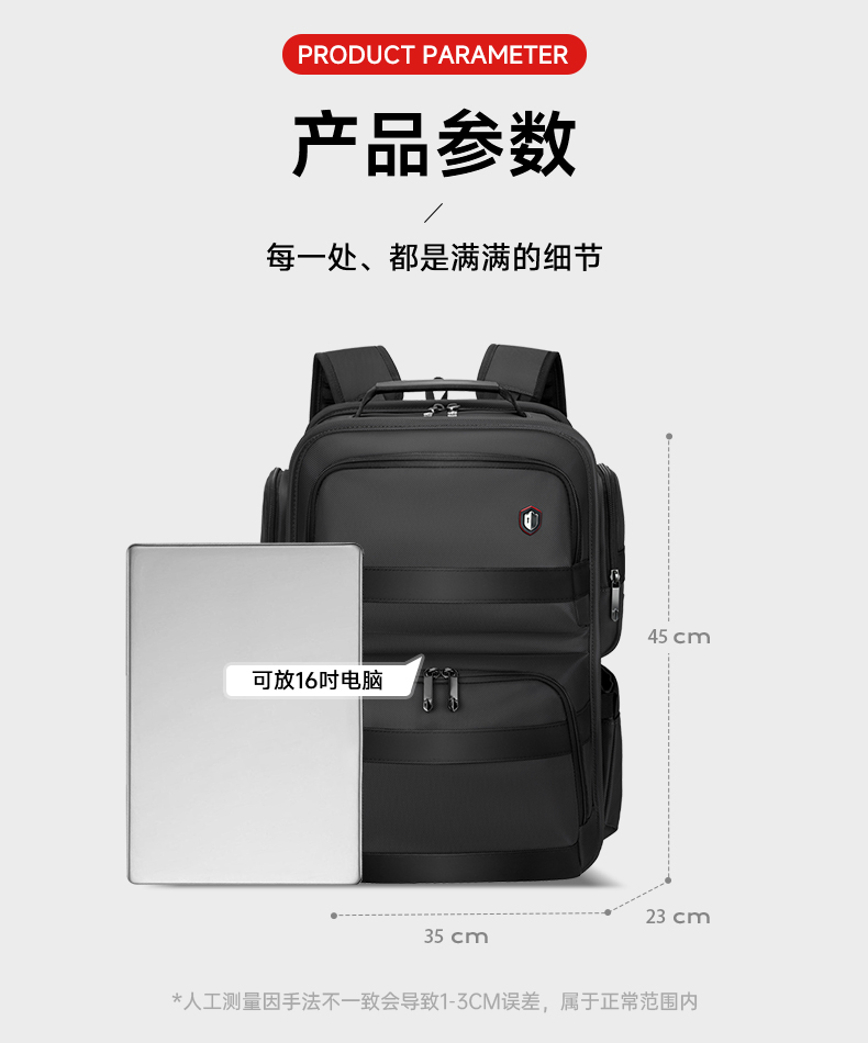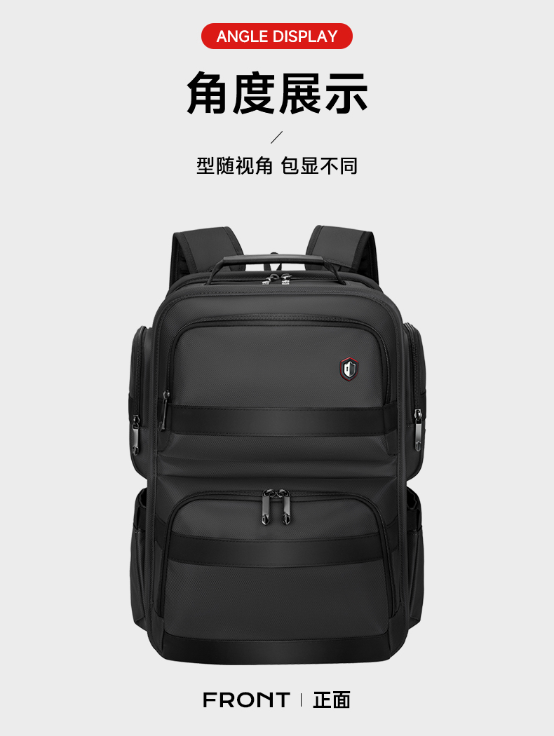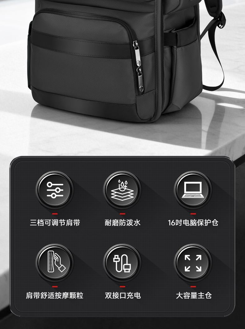 型号:82528 尺寸: 长35*宽23*高45cm 重量:1.2KG 材质: 涤纶(聚酯纤维) 颜色:黑色/蓝色/灰色 1.大容量主仓,180度大开口设计,箱式开合.. 2.高密度复合面料,防波水,防刮耐磨,防尘设计! 3.独立电脑仓,可放16寸以内电脑. 4.弹力背板、透气、缓压、减震 5.反重力减压肩带-高弹按摩颗粒平均分散压力减负更轻松 6.双侧自伸缩水杯袋-容量杯仓秒速回弹包包有型更有料 前幅拉链袋