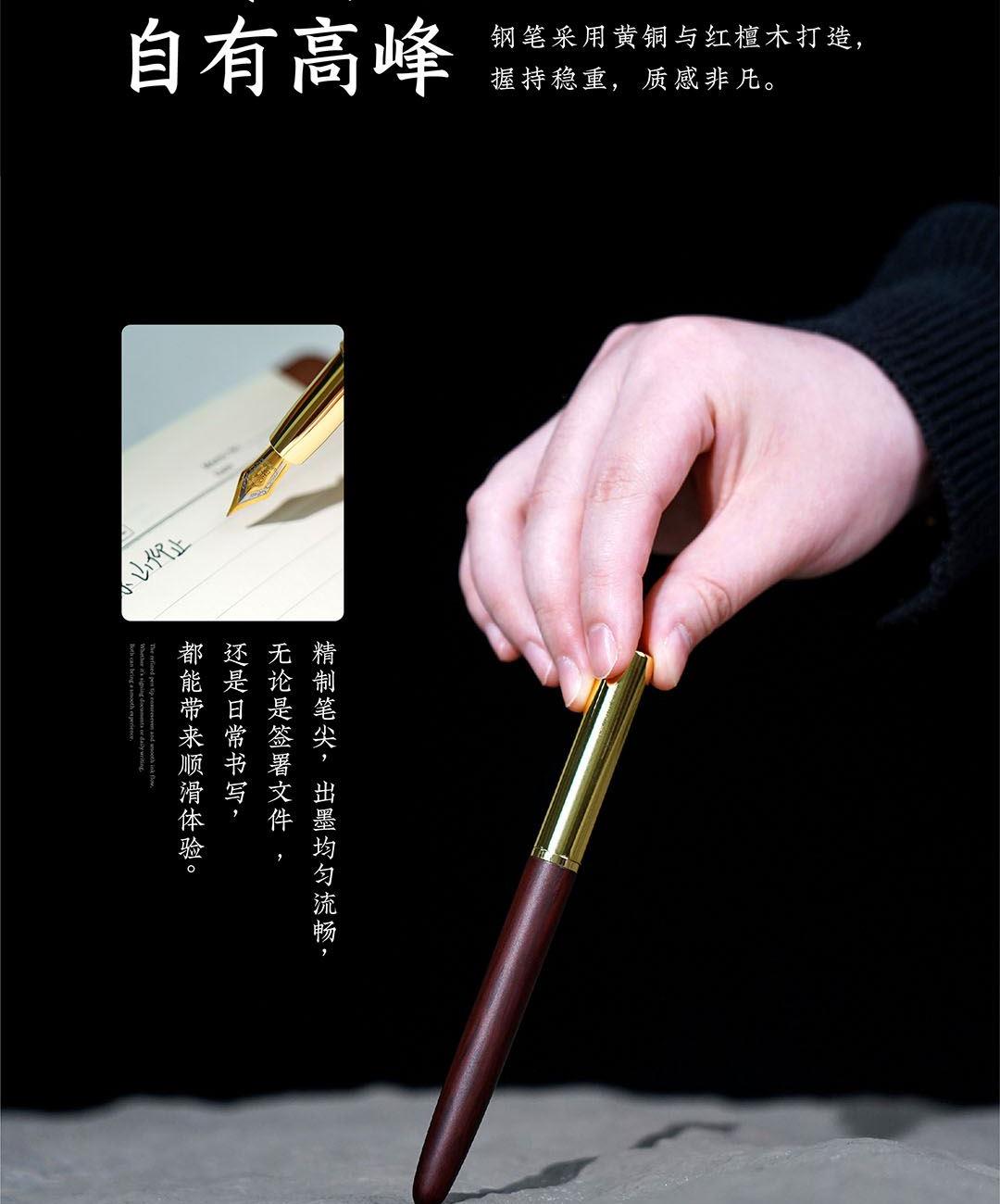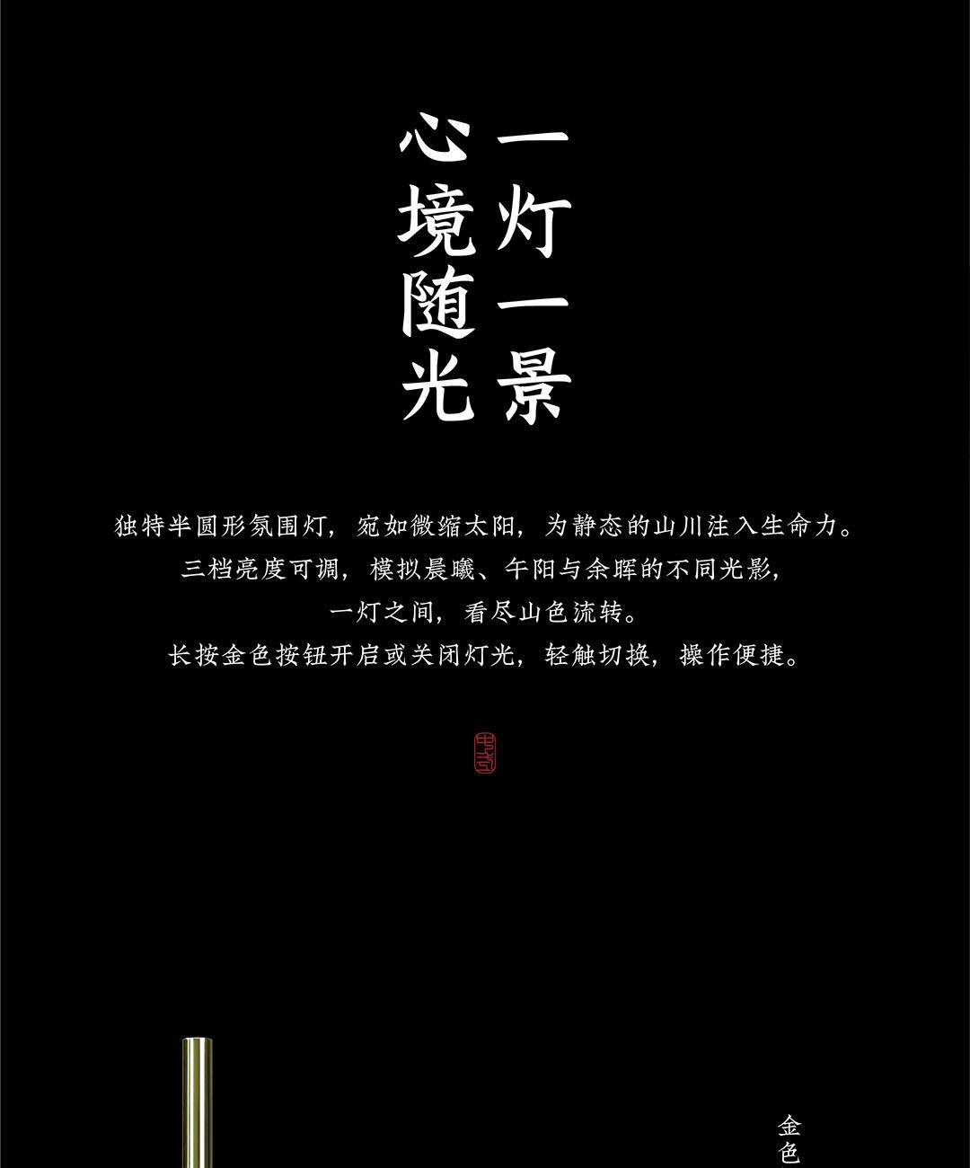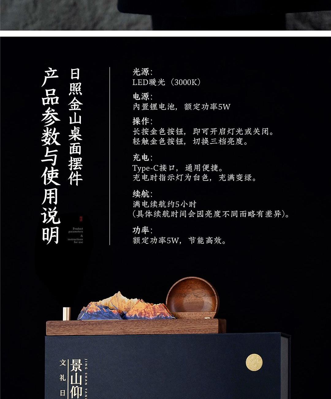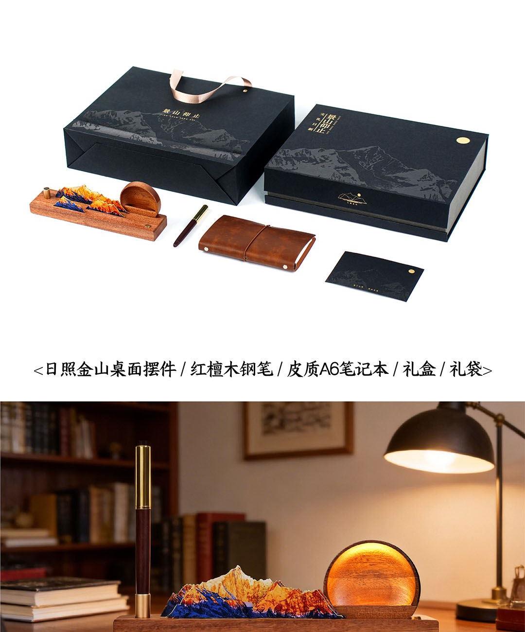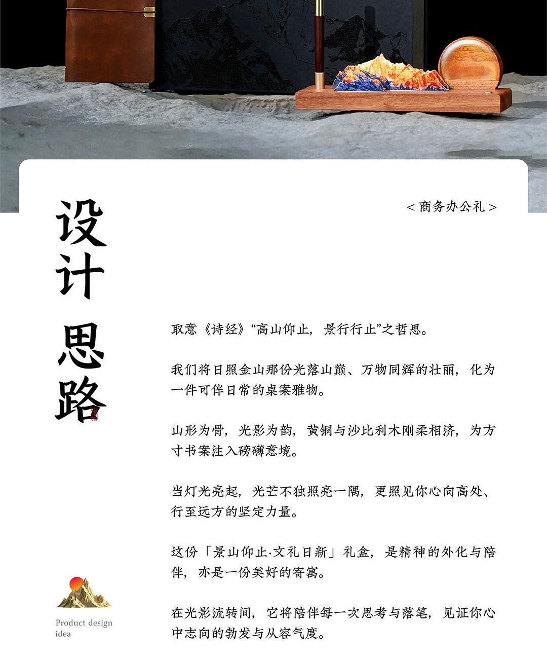 取意《诗经》“高山仰止,景行行止”之哲思。我们将日照金山那份光落山巅、万物同辉的壮丽,化为一件可伴日常的桌案雅物。山形为骨,光影为韵,黄铜与沙比利木刚柔相济,为方寸书案注入磅礴意境。当灯光亮起,光芒不独照亮一隅,更照见你心向高处、行至远方的坚定力量。这份「景山仰止·文礼日新」礼盒,是精神的外化与陪伴,亦是一份美好的寄寓。在光影流转间,它将陪伴每一次思考与落笔,见证你心中志向的勃发与从容气度。 材质 / Material 沙比利木 红檀木 皮革 规格 / Size 礼盒:35.5*27.5*10cm 礼袋:37.5*29.5*12cm 皮质A6笔记本:18*12*2.5cm 红檀木钢笔:14*φ1.2cm 日照金山桌面摆件:26*6*9cm