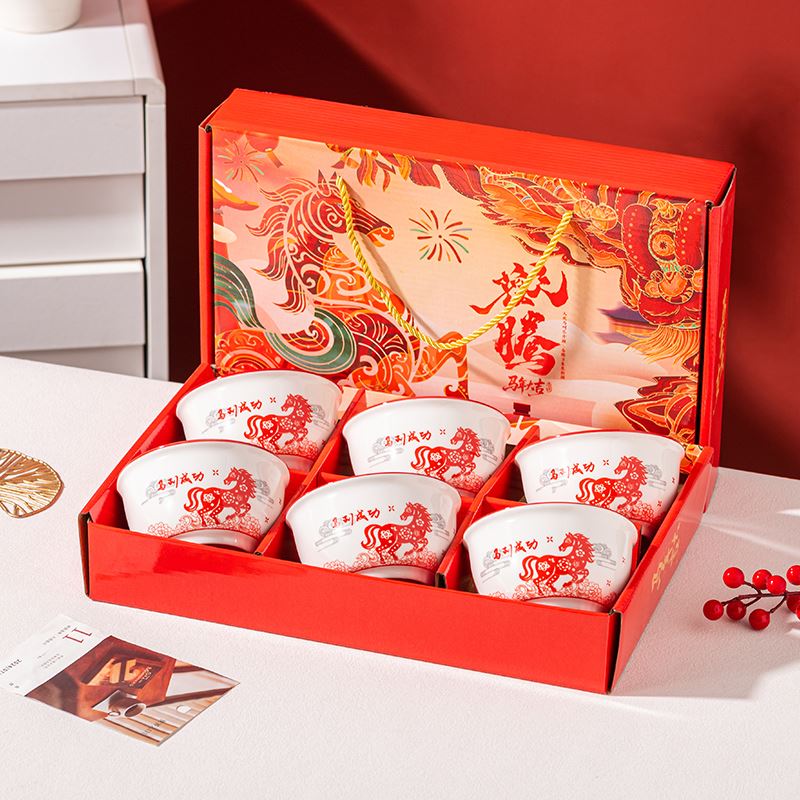 6碗套装:规格:36.5*6*24.5cm、1325g 外箱尺寸:75×33×49CM 28.5kg、配法:6碗 产品特点: 马年窗花碗礼,把新春福气捧在手心,当马年的祥瑞遇上传统剪窗花工艺,这组碗具礼盒便成了新春里别致的心意。那碗身的骏马剪纸,红得热烈又鲜活,似是从民俗窗花里跃出,带着“马到成功”的美好祈愿,将年节的红火与祝福都盛了进来。无论是自家添新岁,还是赠予亲友贺新春,这一份融了传统剪纸艺术与马年吉兆的礼,都能让年味在餐桌间,在心意里,悄然升温。