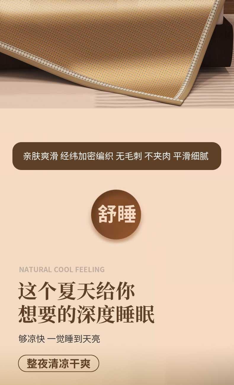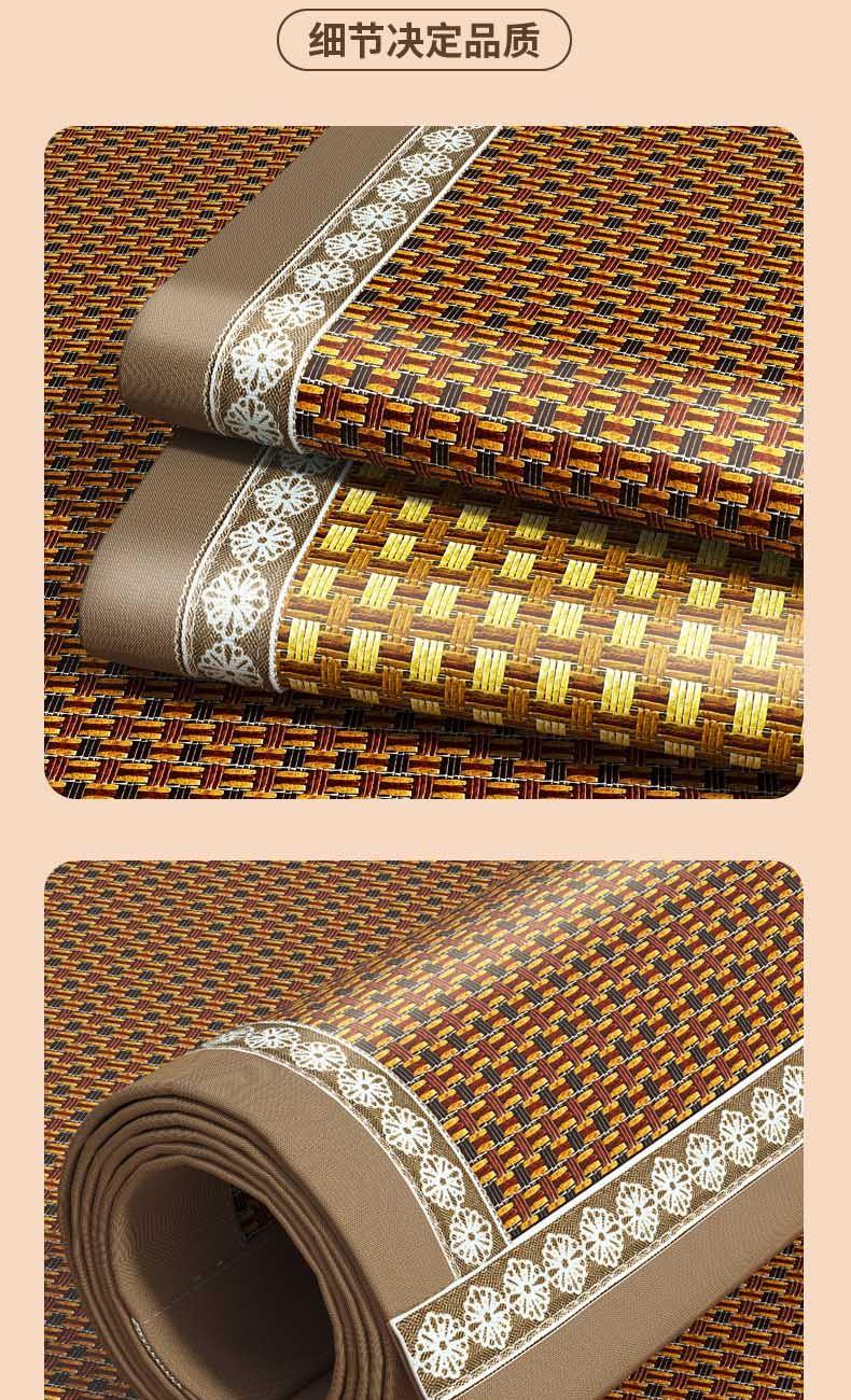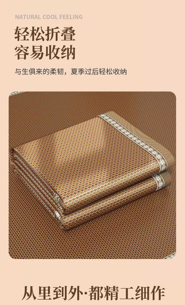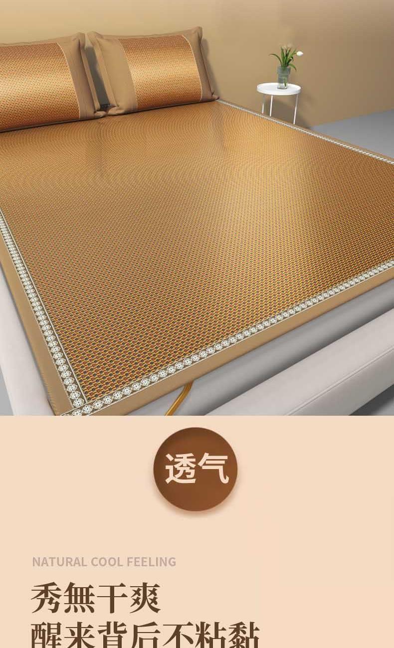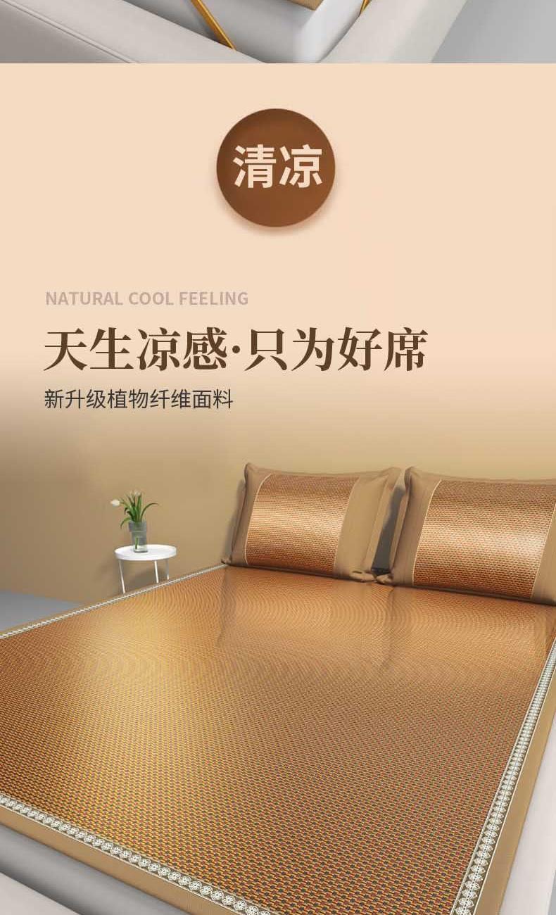 花色:咖色 面料:聚酯纤维 底层:丙纶 凉席*1:180*200cm 枕套*2:48*74cm 包装方式:时尚格子提袋 包装尺寸: 495*90*400mm 外箱尺寸:830*510*660mm 面料选用草本面料,高密编织。席面贴复古花边织带,层次感分明。反面复合高克重全环保无纺布,四角高弹松紧绑带,可扣于床垫四方,有效抑制睡眠时的席子挪动跑位。