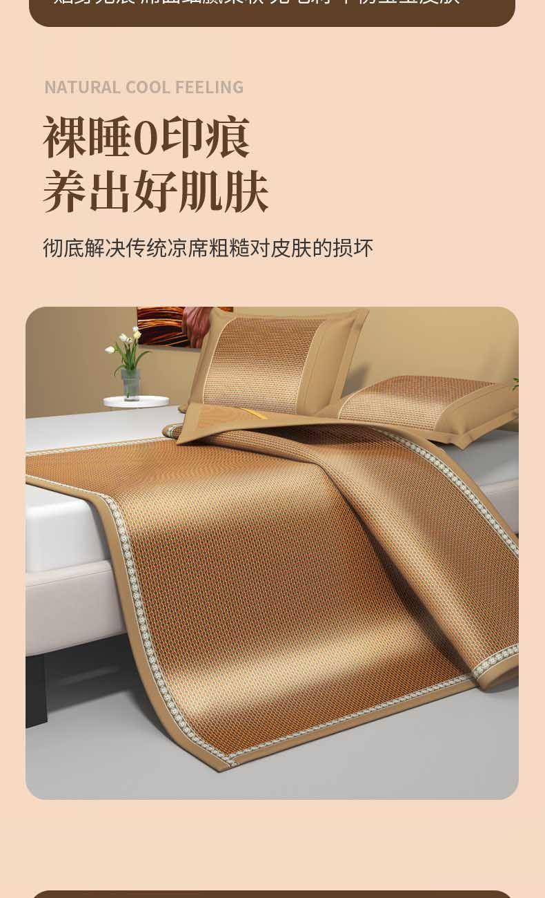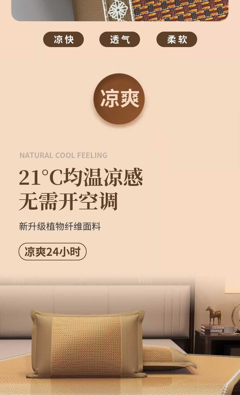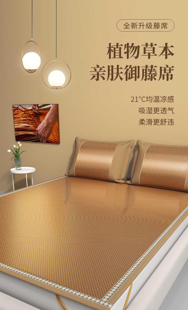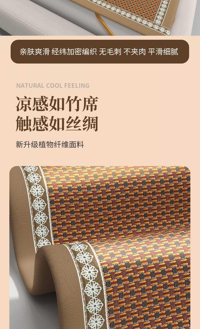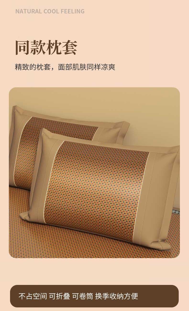 花色:咖色 面料:聚酯纤维 底层:丙纶 凉席*1:180*200cm 枕套*2:48*74cm 包装方式:时尚格子提袋 包装尺寸: 495*90*400mm 外箱尺寸:830*510*660mm 面料选用草本面料,高密编织。席面贴复古花边织带,层次感分明。反面复合高克重全环保无纺布,四角高弹松紧绑带,可扣于床垫四方,有效抑制睡眠时的席子挪动跑位。