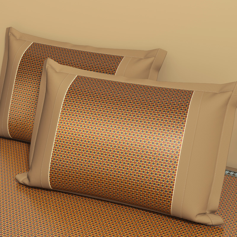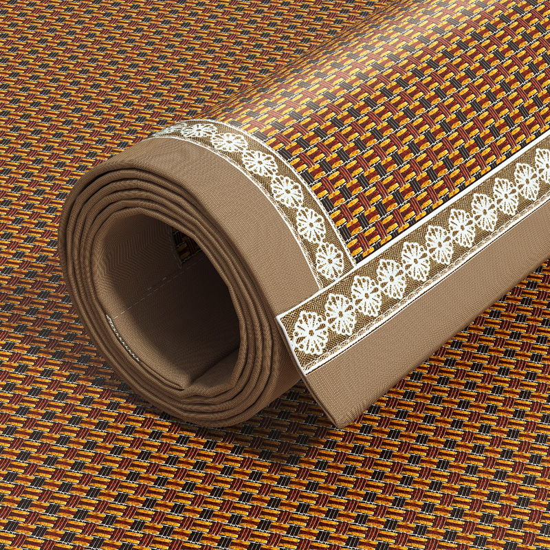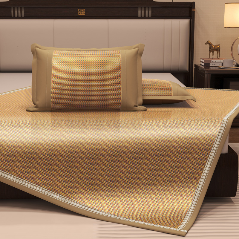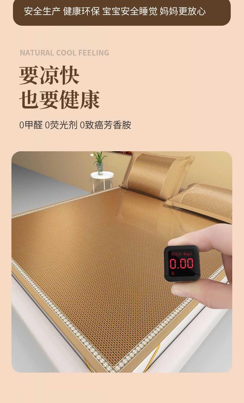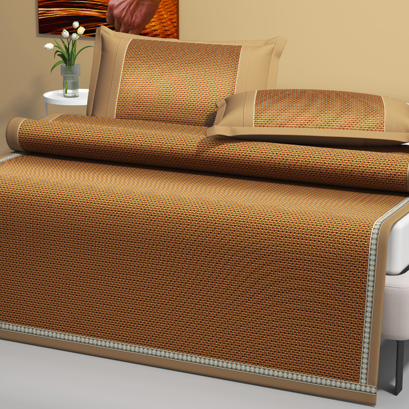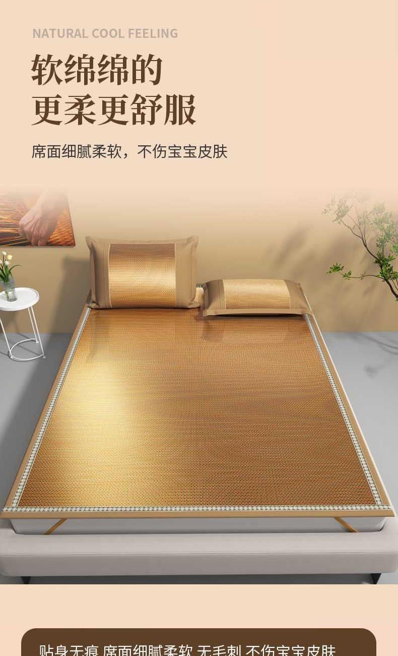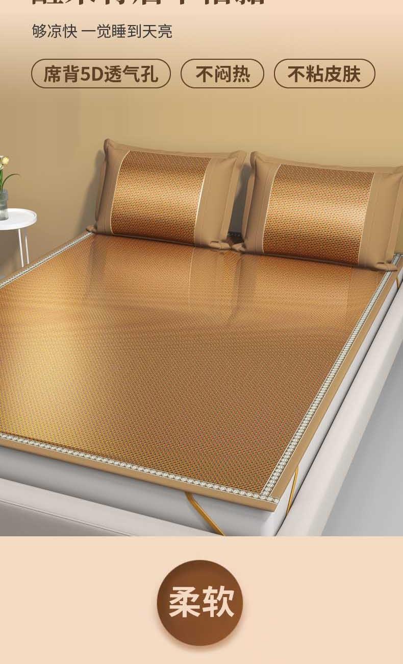 花色:咖色 面料:聚酯纤维 底层:丙纶 凉席*1:180*200cm 枕套*2:48*74cm 包装方式:时尚格子提袋 包装尺寸: 495*90*400mm 外箱尺寸:830*510*660mm 面料选用草本面料,高密编织。席面贴复古花边织带,层次感分明。反面复合高克重全环保无纺布,四角高弹松紧绑带,可扣于床垫四方,有效抑制睡眠时的席子挪动跑位。