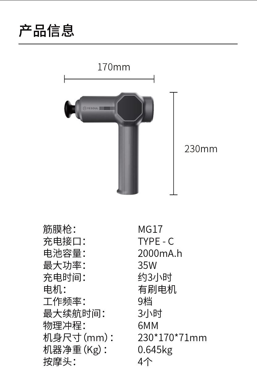 采用6mm按摩深度,不易造成肌肉损伤,受力更温和 7.4V锂电暴力输出,搭配高扭矩电机,转速可达3200r/min,可以带来10KG的冲击力度,加速体内乳酸的排出 搭配2000mAh高压储能锂电池,持久续航;Type-c充电,方便快捷 一键9档,适应不同需要,放松不同部位;自带显示屏,感知舒适