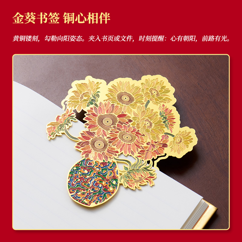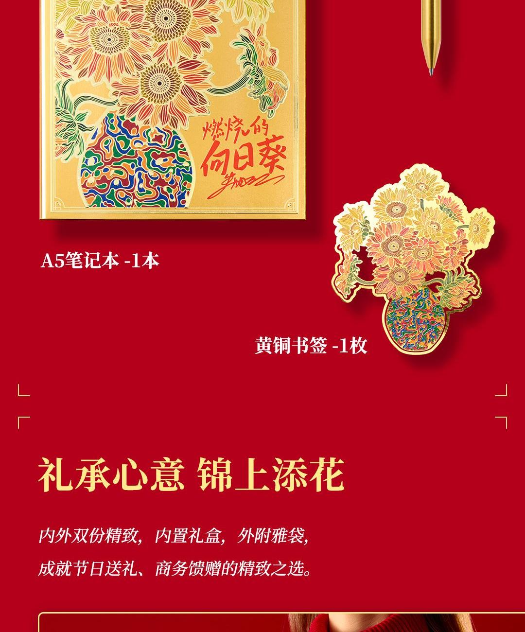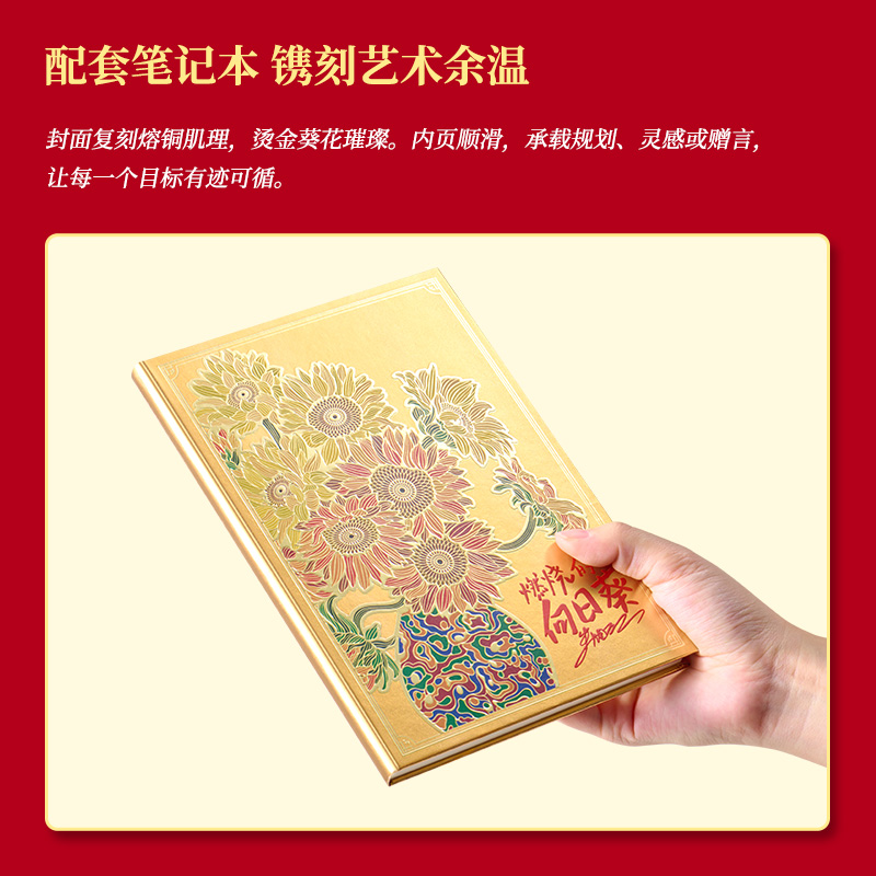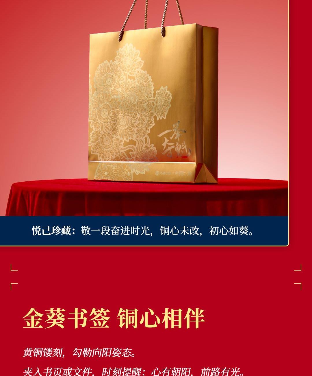 尺 寸:单套(含手提袋,约860g) 材 质:铜(笔杆、书签、出芯向日葵),纸卡·(笔记本封面),80g道林纸(内页) 外观颜色:金色 1、将《燃烧的向日葵》的艺术精髓与视觉意象,融入书写艺术。 2、内置礼盒,外附雅袋,节日送礼、商务馈赠的精致之选。 金葵书签*1,纯铜镂刻,勾勒向阳姿态。 3、FIRST 初心 签字笔*1,寓意金葵盛放 向阳而生而生。 4、配套笔记本*1,封面复刻熔铜肌理,烫金葵花璀璨。 包装方式:礼盒配一个手提袋