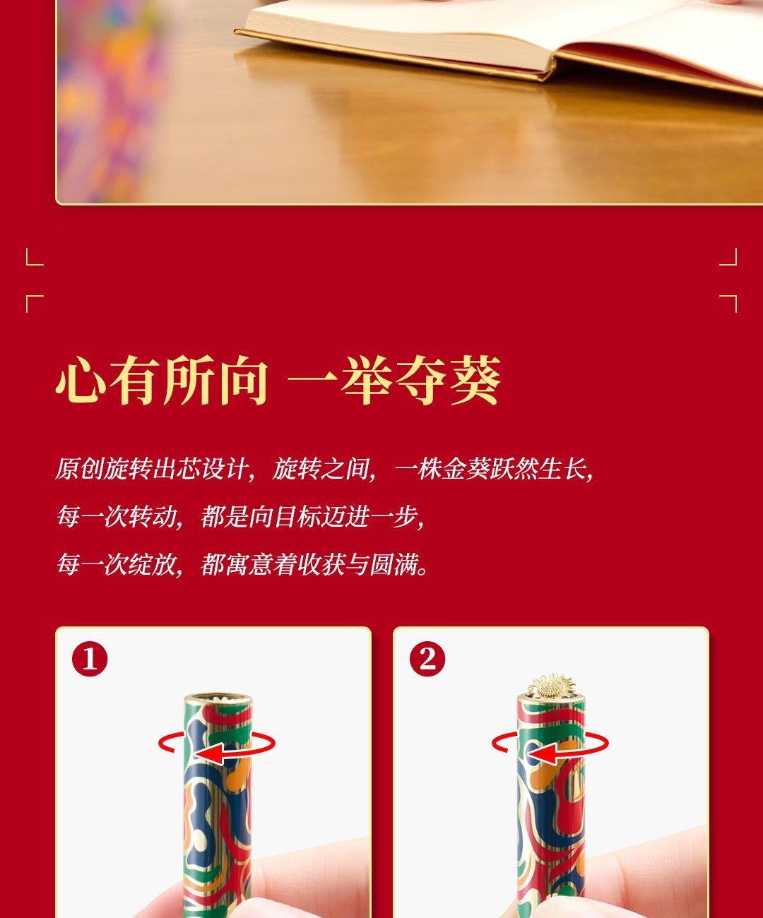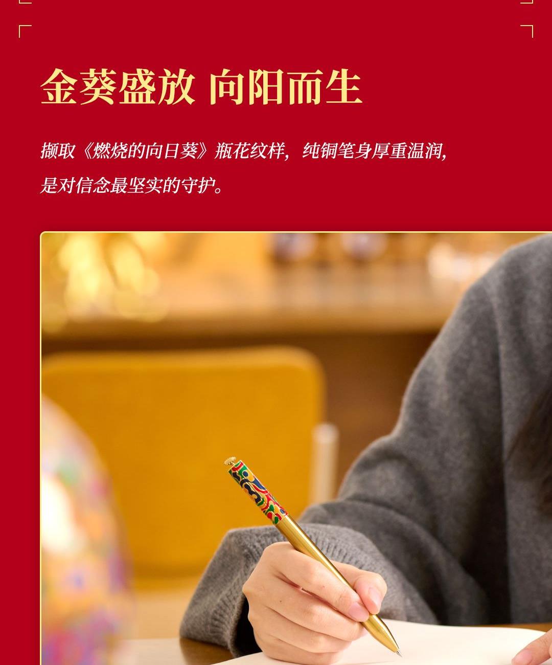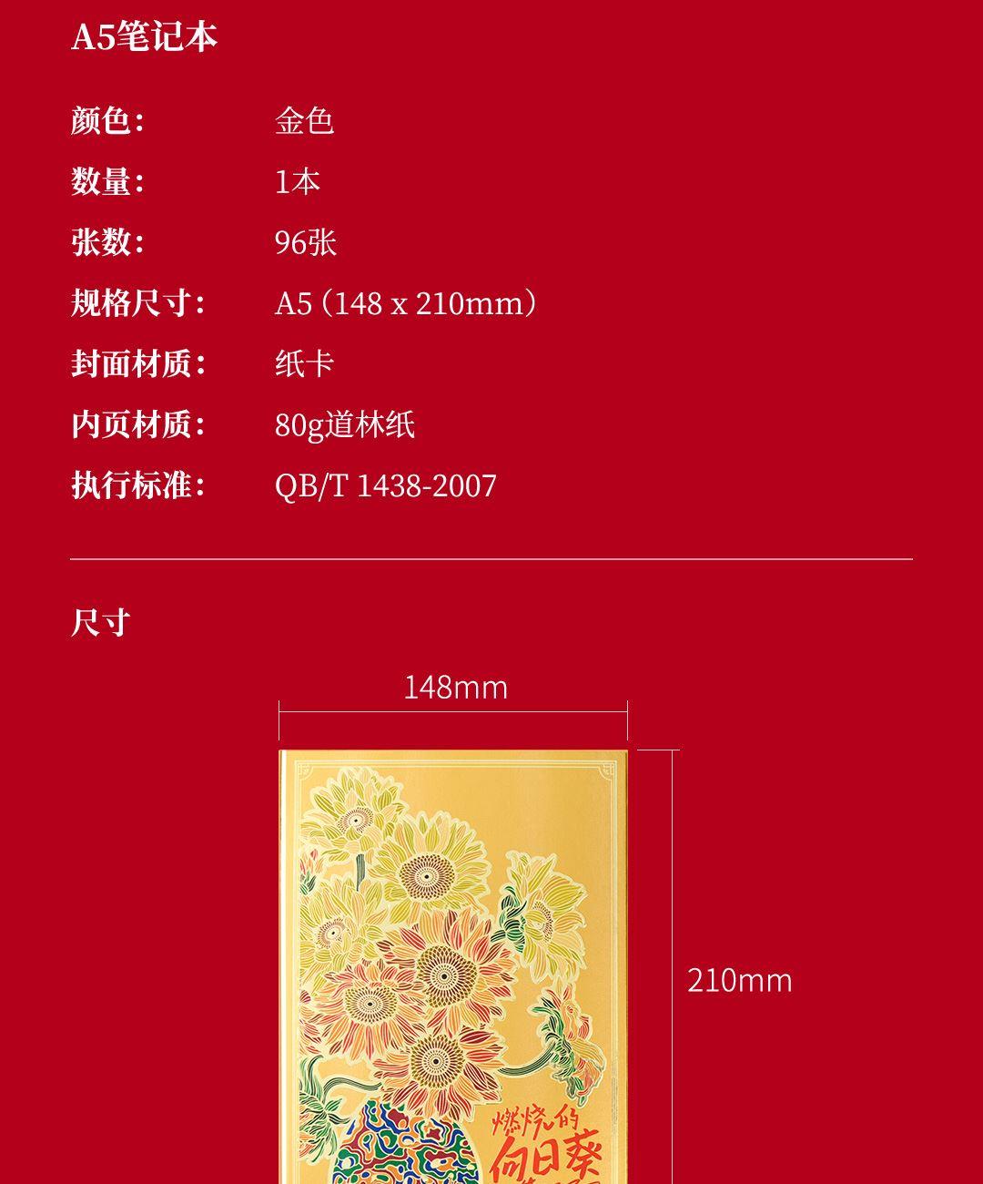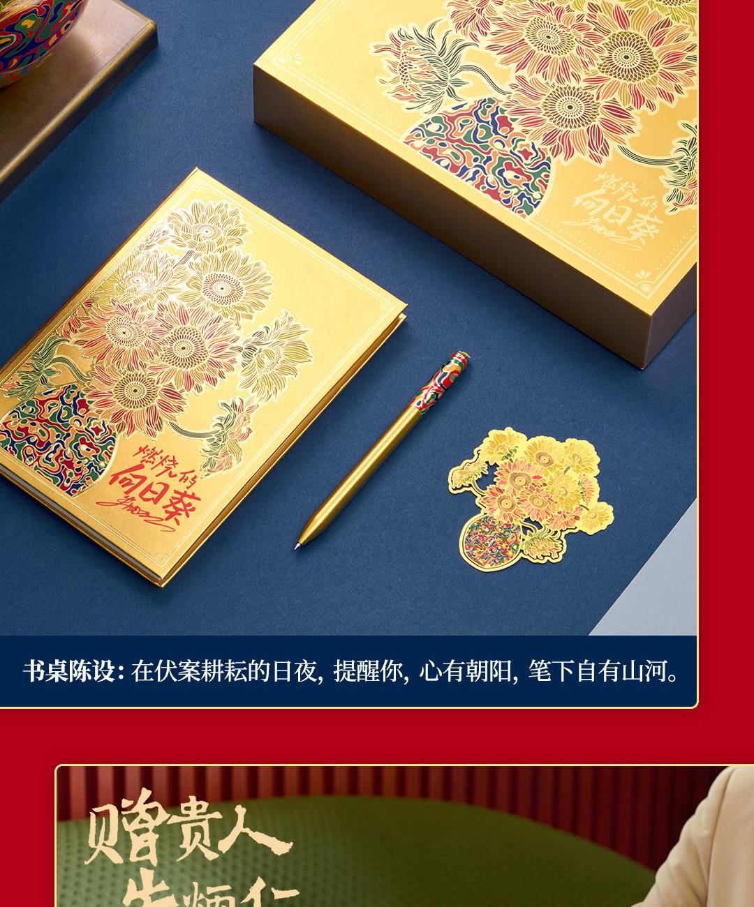 尺 寸:单套(含手提袋,约860g) 材 质:铜(笔杆、书签、出芯向日葵),纸卡·(笔记本封面),80g道林纸(内页) 外观颜色:金色 1、将《燃烧的向日葵》的艺术精髓与视觉意象,融入书写艺术。 2、内置礼盒,外附雅袋,节日送礼、商务馈赠的精致之选。 金葵书签*1,纯铜镂刻,勾勒向阳姿态。 3、FIRST 初心 签字笔*1,寓意金葵盛放 向阳而生而生。 4、配套笔记本*1,封面复刻熔铜肌理,烫金葵花璀璨。 包装方式:礼盒配一个手提袋
