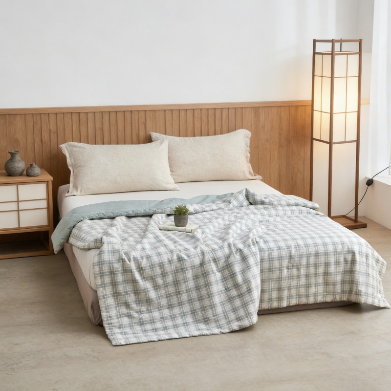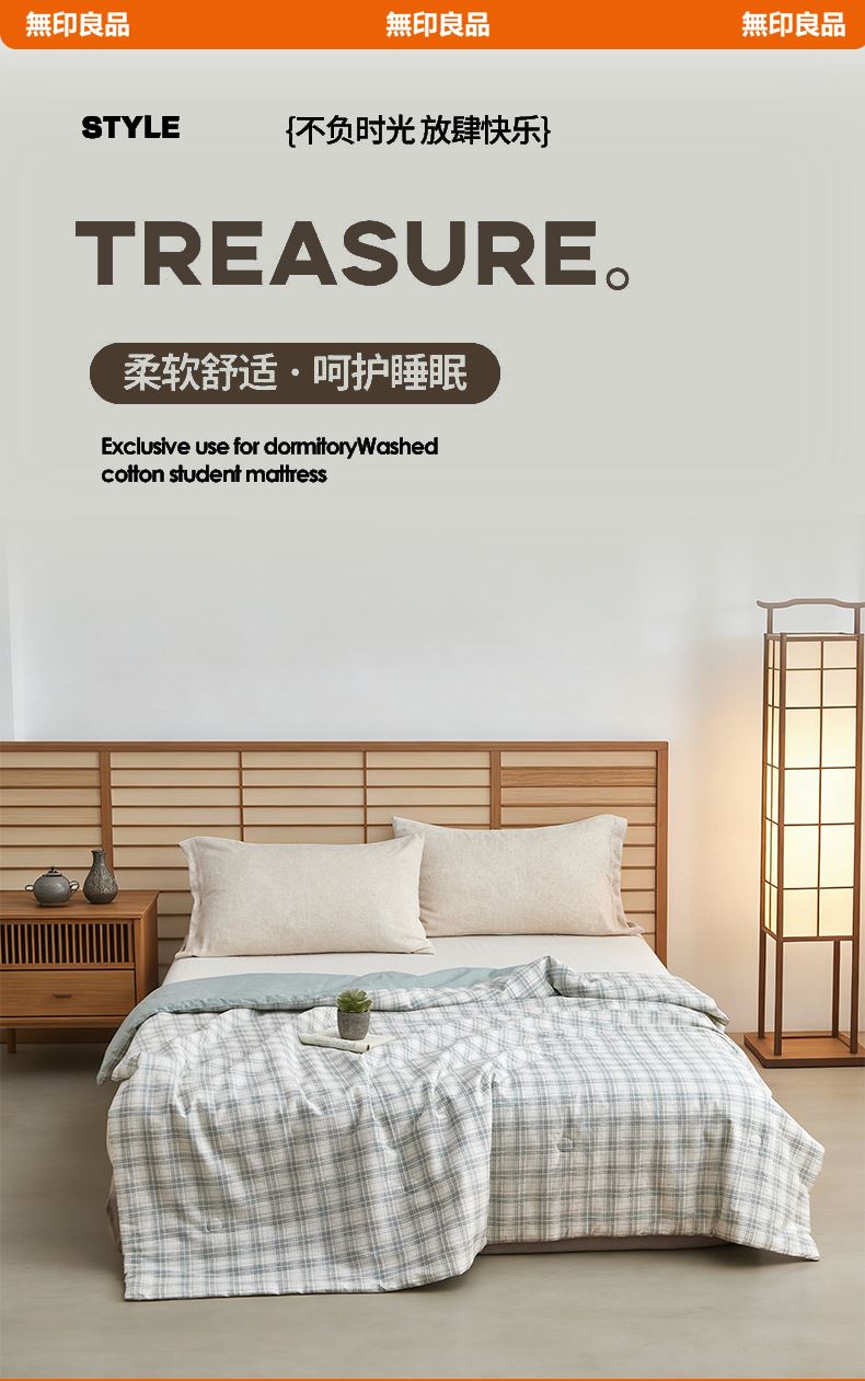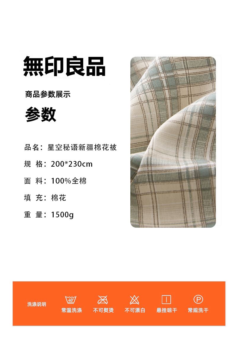 规格:200*230cm 面料:全棉 填充:棉花 克重:1500g 执行标准:GB/T22796-2021 安全类别:GB18401-2010 B类 1.采用优质纯棉面料,斜纹织造,水洗处理,手感柔糯,吸湿透气,贴身更舒适贴; 2.填充物选用优质A类整张羽丝棉纤维手感犹如羽绒般,轻盈蓬松,柔软舒适 3.采用单边暗合缝制,定点绗缝工艺,日式简约设计风格,简约时尚,让您感受科技生态睡眠!