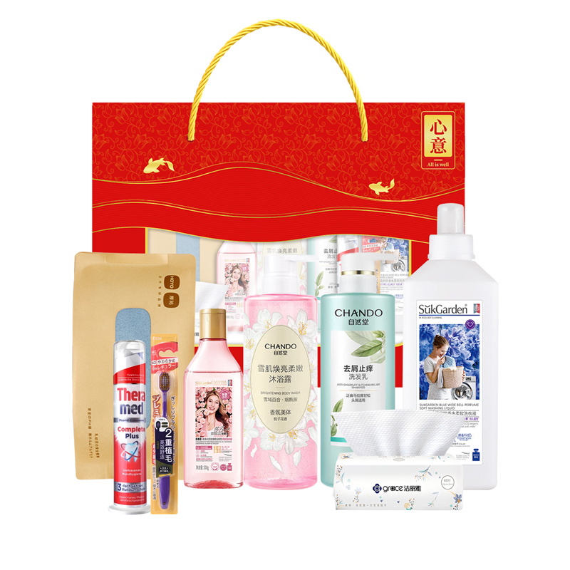 礼盒尺寸:32*8.5*24.5cm 包装尺寸:66*46.5*51CM 产品配置:(香型随机) 自然堂洗发水-600ml 自然堂沐浴露-600ml 蔬果园内衣洗衣液-200ml 蔬果园洗衣液-1kg 汉高三色牙膏-100ml 进口宽头软毛牙刷 HOYO毛巾-35*75cm 洁丽雅洗脸巾-50抽/包 精美礼盒