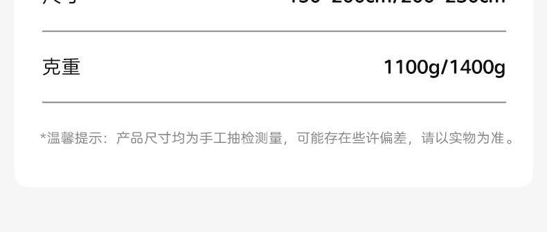 货 号 :HXB-2512 面 料 :100 %纯棉 填 充 :超细纤维 规 格 :200*230cm 重 量 :1400g 包装尺寸 :48x36x13.5cm 装 箱明细 :8床/箱或50条/包 1.精选面料 : 采用100 %全棉制作成的面料,透气性强; 2.优质填充 : 优质超细纤维,柔软亲肤 导湿透气; 3.精致工艺 : 精致绗缝,简约时尚的风格 适合各种卧室风格;