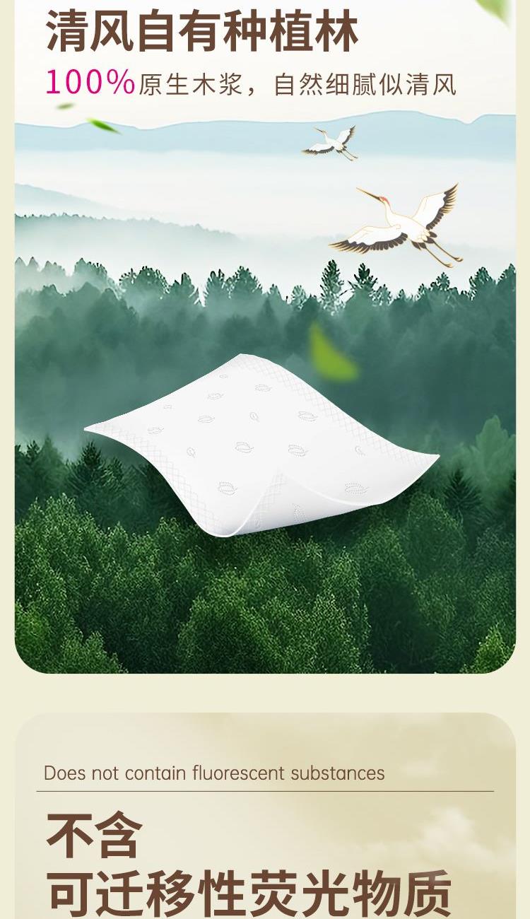 香型:无香  主要原料:原生木浆 保质期:3年  细腻好纸,7年相思木,1张细腻纸。 1.原生木浆 使用原生种植林原木生产的木浆,从源头保证绿色健康品项。全程严控更放心,不添加可迁移性荧光增白剂。 2.四层厚实,蓬松舒软 原生木浆好木出好纸,纸感细腻,棉柔亲肤。 3.湿水依旧强韧 湿水不易破,吸水力UP,多场景安心使用。 4.纤维交织紧密 长短纤维交织工艺,黄金配比,成就柔韧细腻,不掉屑、不分层,自然亲肤,品质呵护。 清风 隶属于金光集团APP,实力拥有“林浆纸一体”产业链,“种6棵,用1棵”,在国内自有林场地面积超过27万公顷,碳储量4239万吨。