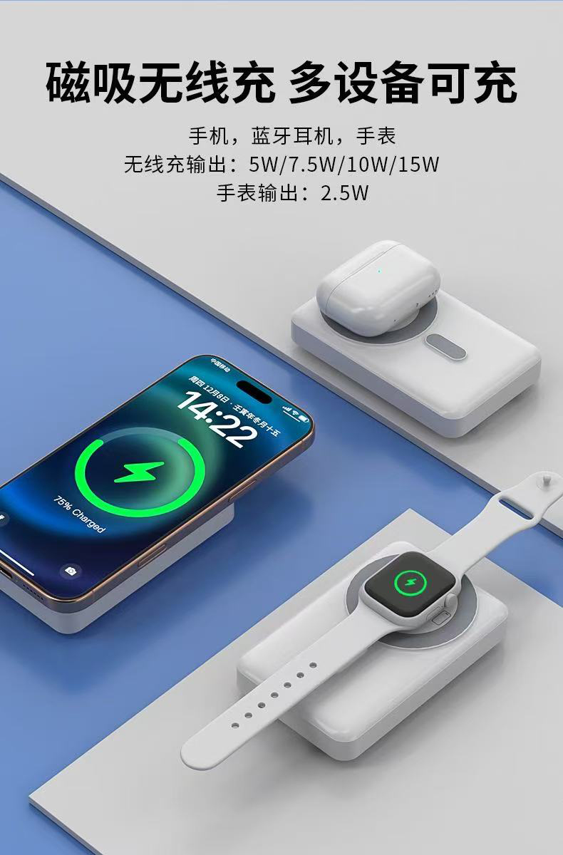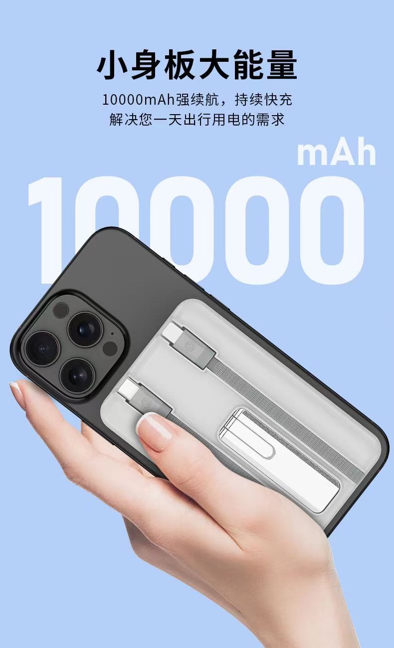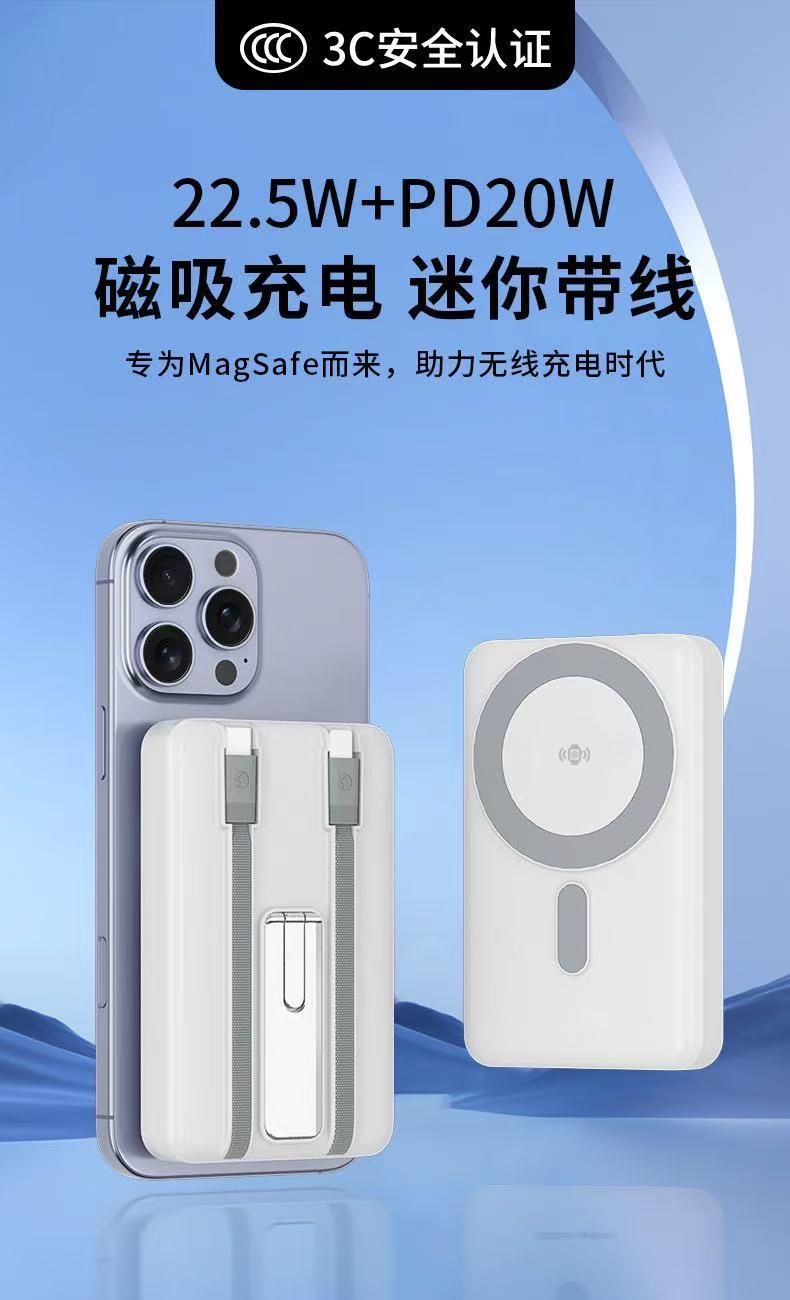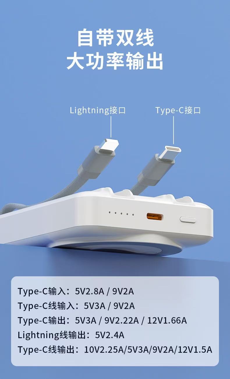 3C认证证书,聚合物电芯,超10000mAh, USB快充22.5W,磁吸无线快充15W, 苹果手表无线充功能, 自带Type-C线,Lightning线输出, 兼容市面上主流大部分机型,秒速过检,直接登机