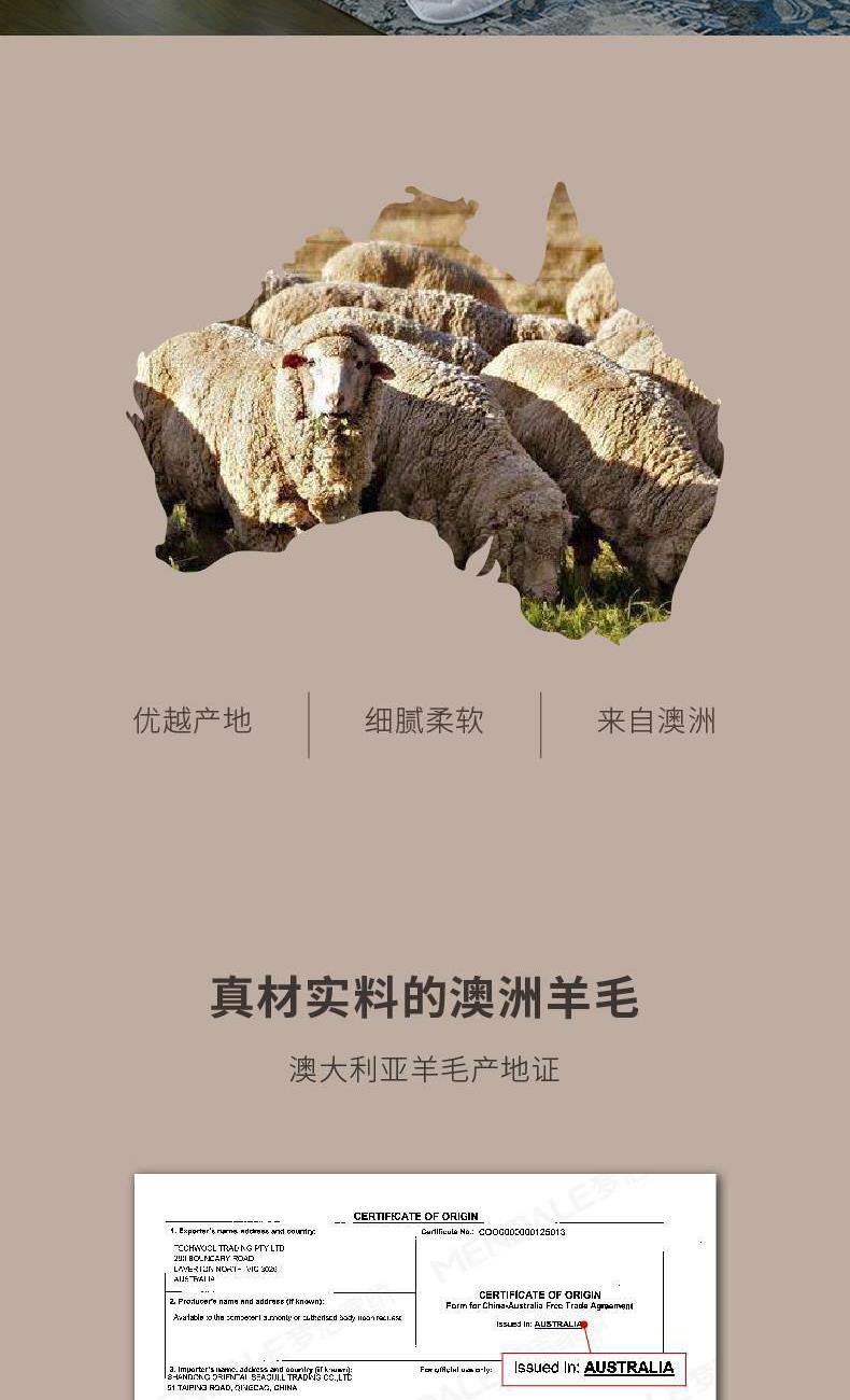 面 料:全涤磨毛 尺 寸:200×230cm 填充物 : 51%澳毛+49%聚酯纤维 填充克重:800g 填充:羊毛本身具有良好的吸、放湿性。羊毛工艺与纤维均匀混纺,平整且蓬松,无异味。 面料:手感细腻,亲肤柔软,舒适贴合; 工艺:蓬松回弹、厚实保暖;细致包边,固定被芯。