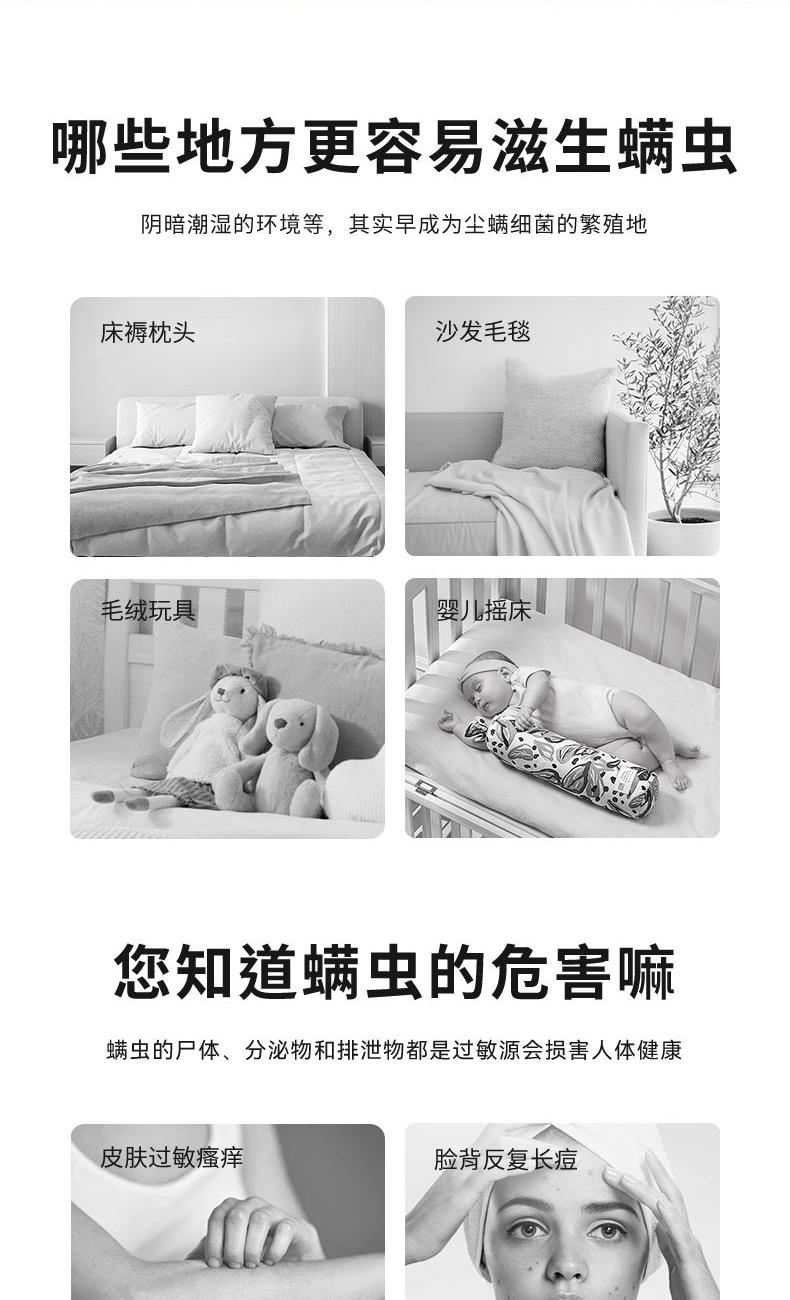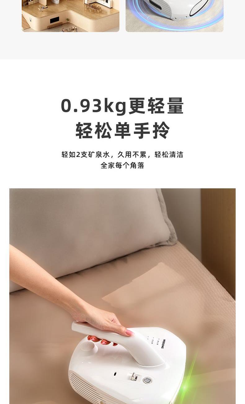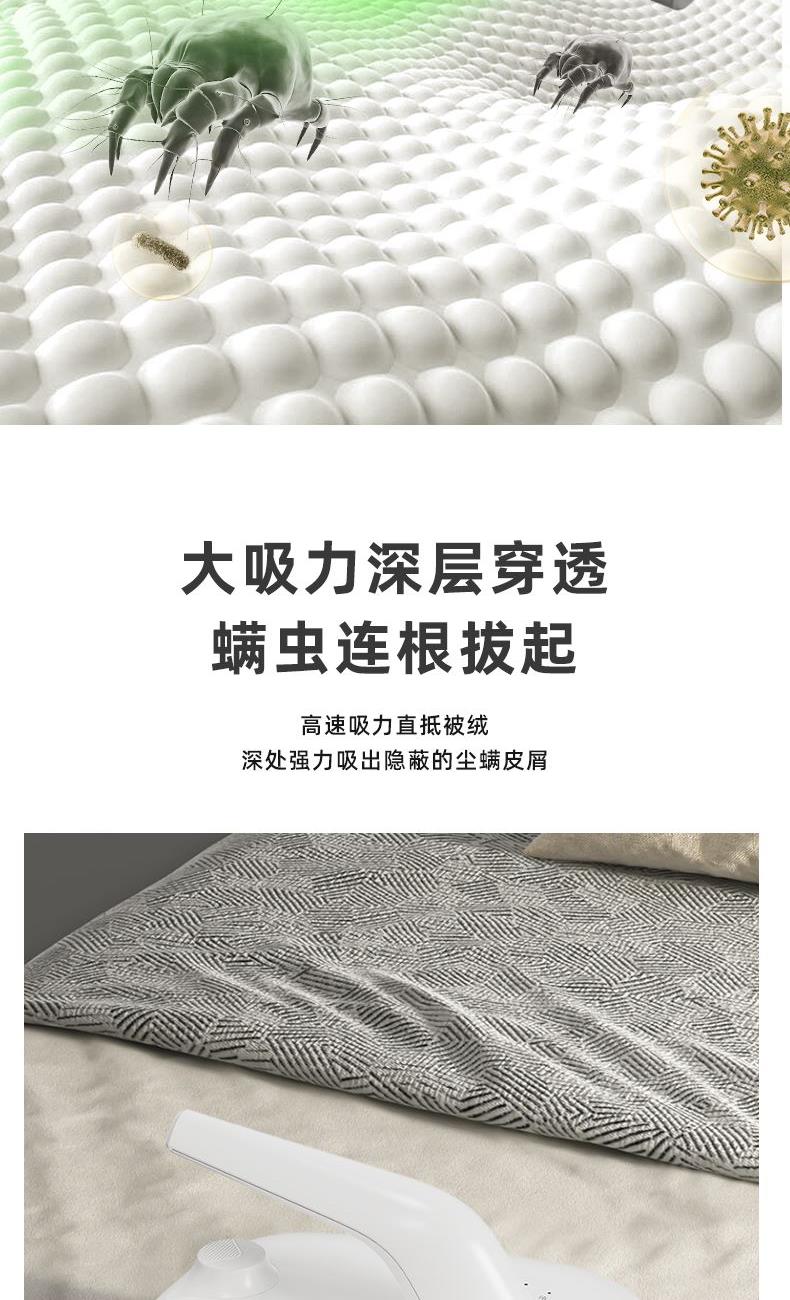 产品净重:0.88KG 产品毛重:1.27KG 额定功率:150W 额定电压:11.1V~ 尘盒容量:550mL 锂电池:2000mAH 吸力:≥3000pa 内含:主机x1、电源线x1、说明书x1 1.除尘:采用大风量穿透床单,达到除尘和除螨的目的; 2.除螨:紫外线大面积覆盖床面,强穿透到床单深处,破坏螨虫生长环境,等方式达到除螨效果; 3.光显灰尘:绿光显尘60CM,从源头除螨抑螨,无线充电摆脱线的困扰,实现无拘无束自由;