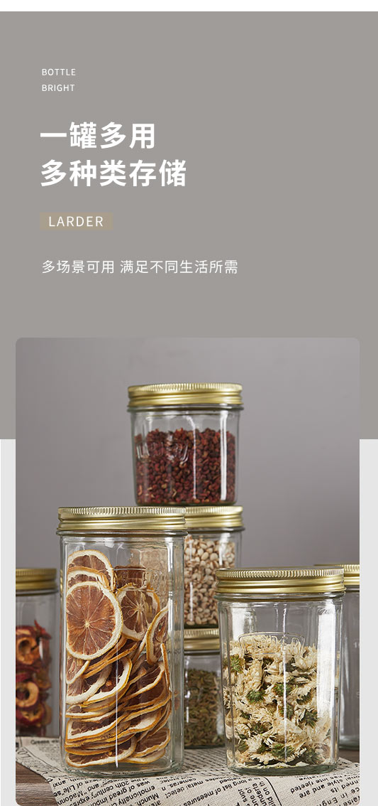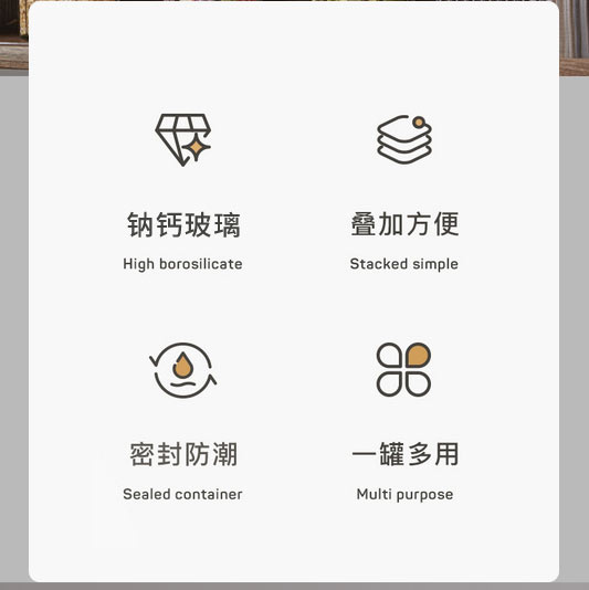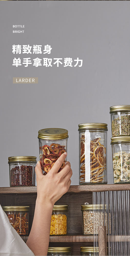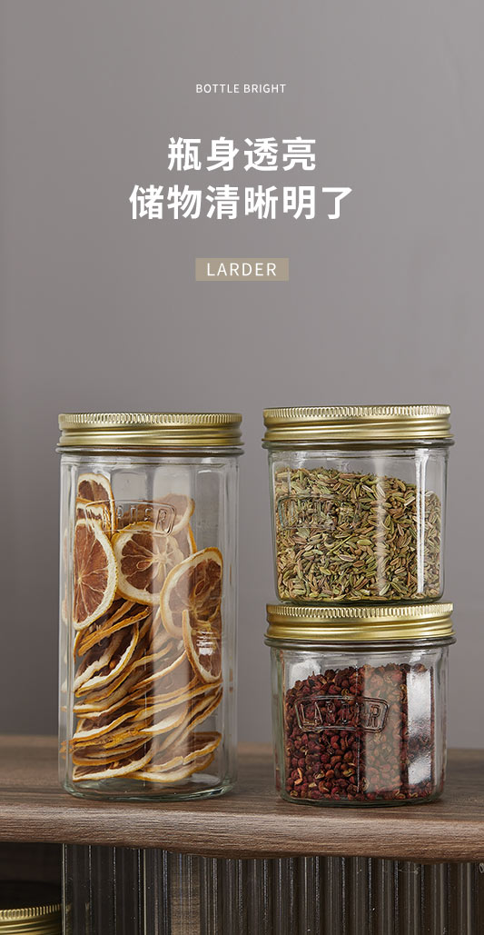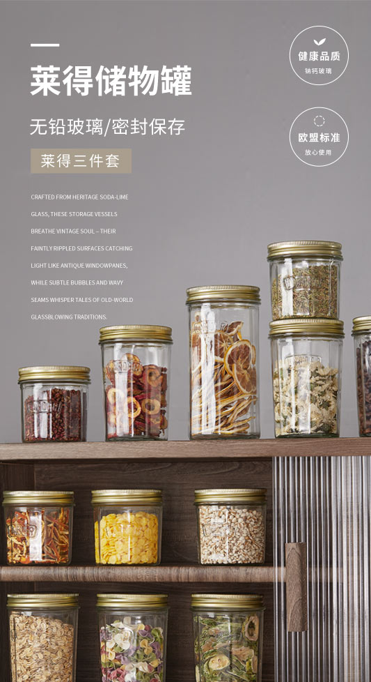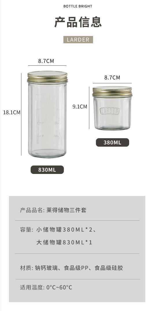 材 质:高白料钠钙玻璃 产品参数:大830ml*1、小380ml*2 彩盒尺寸:187*95*193mm 外箱尺寸:40*39*40.4cm 产品卖点:1.采用高透光无铅玻璃瓶身,无毒无异味,可直接接触食材,符合健康饮食需求,透明质地清晰展示内容物状态。2.复古工业美学设计复刻1927年经典工业风,古铜色马口铁螺纹防滑盖+棱纹金属质感,搭配叠落式结构。3.三容量选择,满足厨房储物、吧台调酒、办公收纳等需求;可叠放设计节省空间,成组摆放提升空间格调。