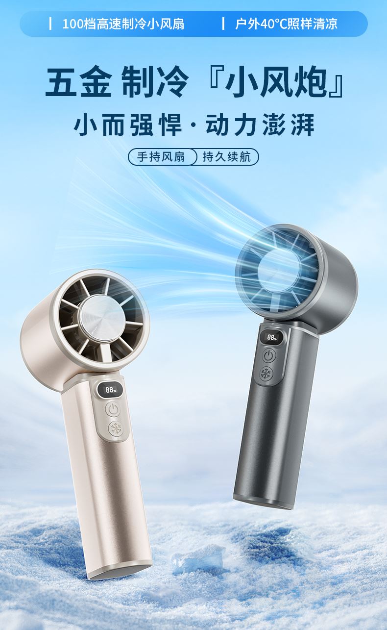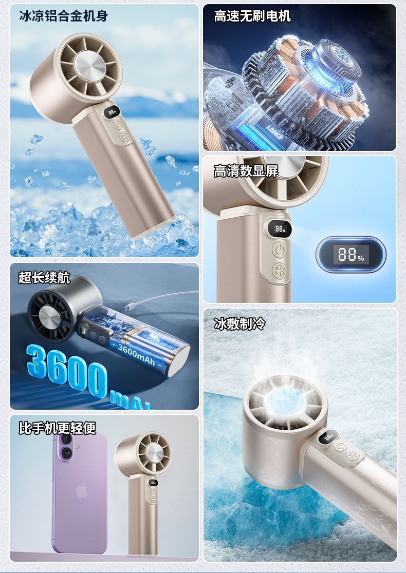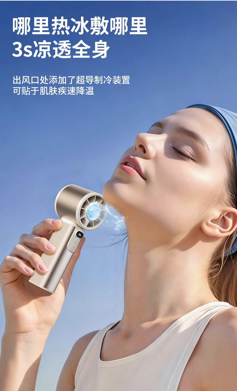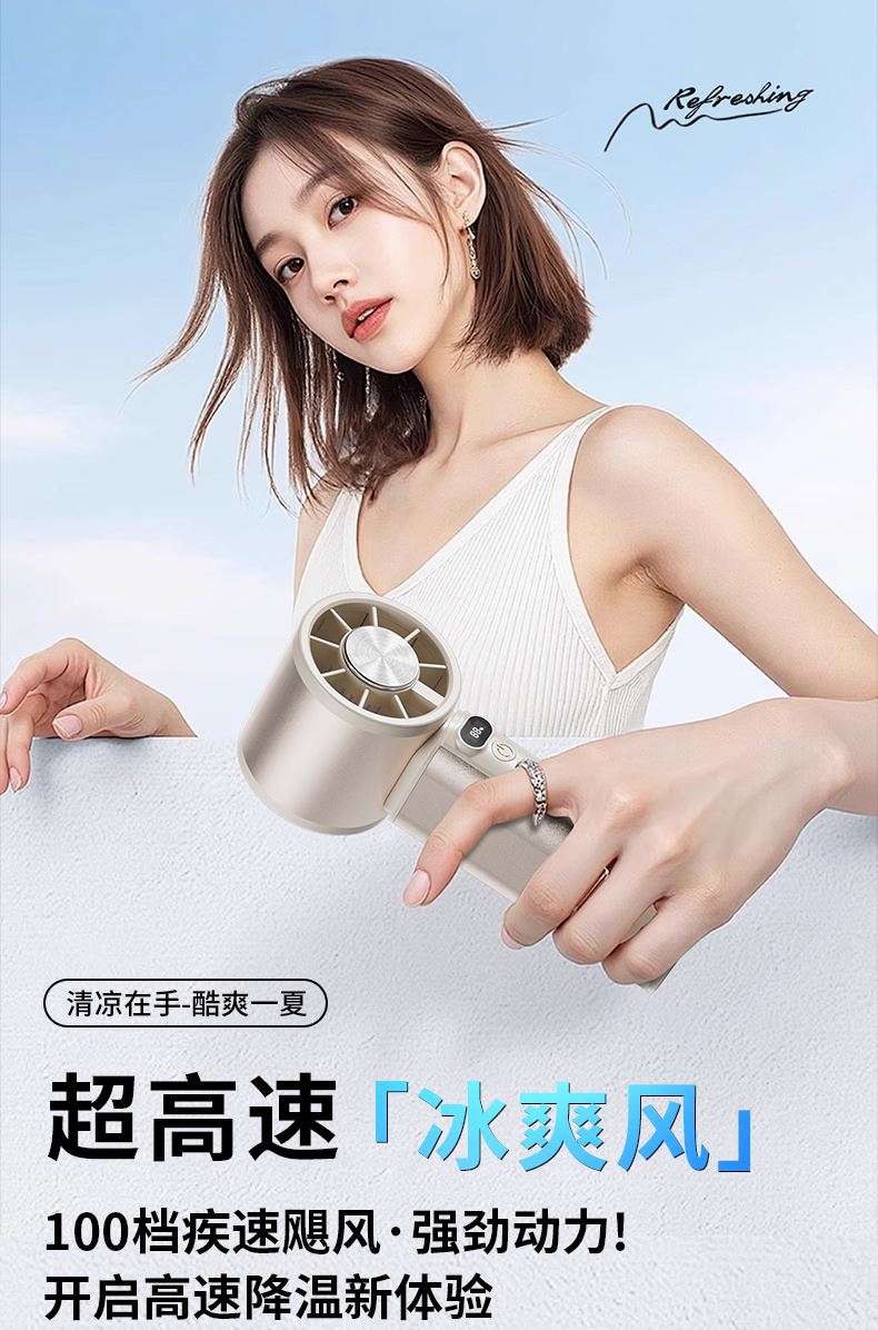*100档风力可调节,带冰敷制冷功能 *铝合金机身,高清数显屏 *迷你小巧,12800rpm *3600毫安电池
