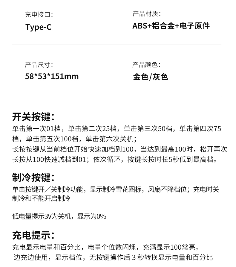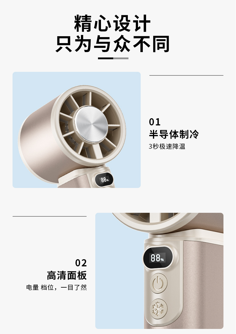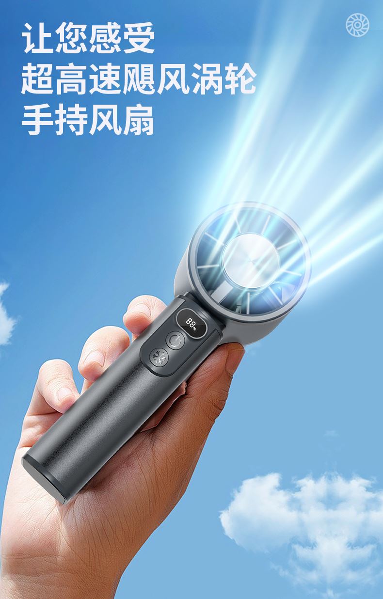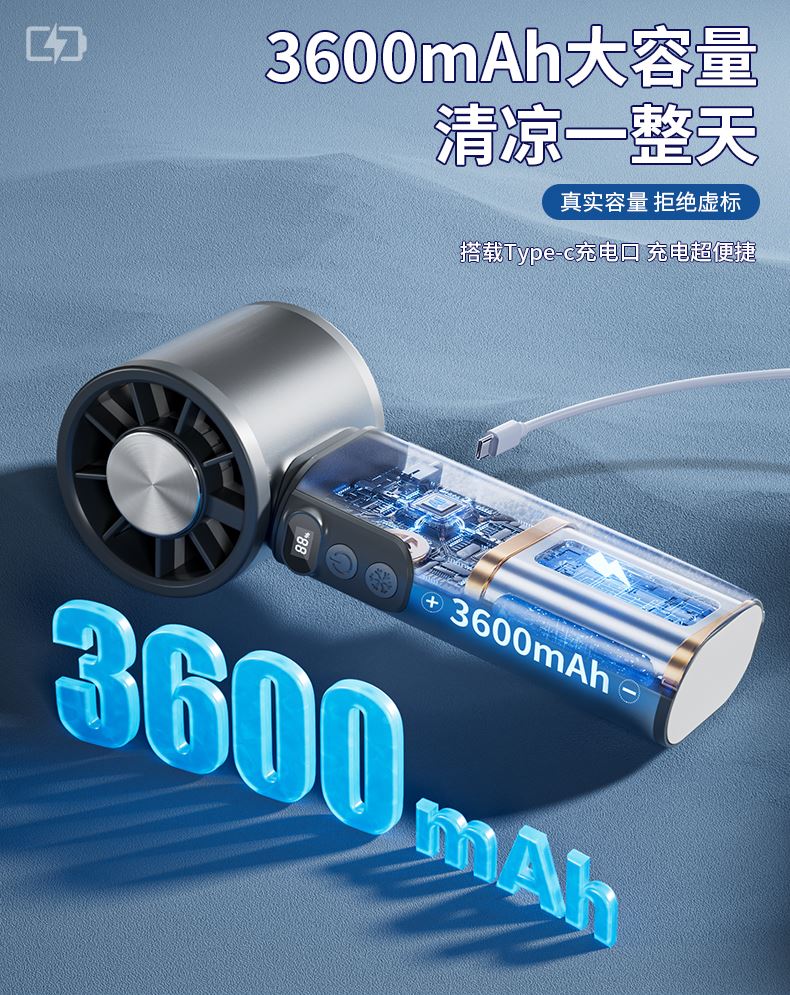 *100档风力可调节,带冰敷制冷功能 *铝合金机身,高清数显屏 *迷你小巧,12800rpm *3600毫安电池