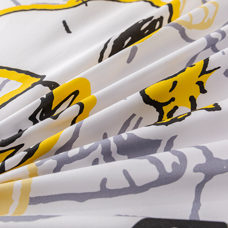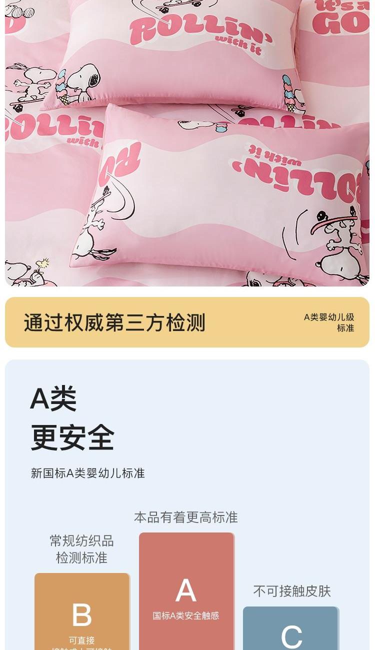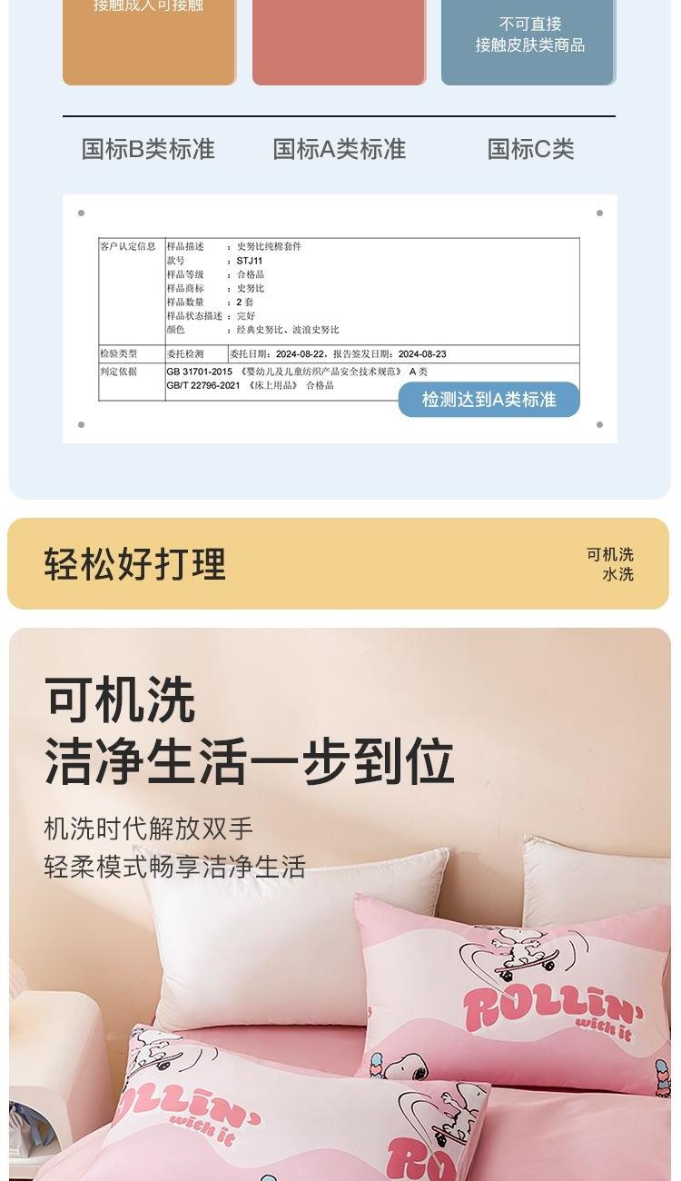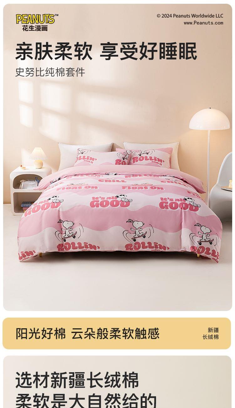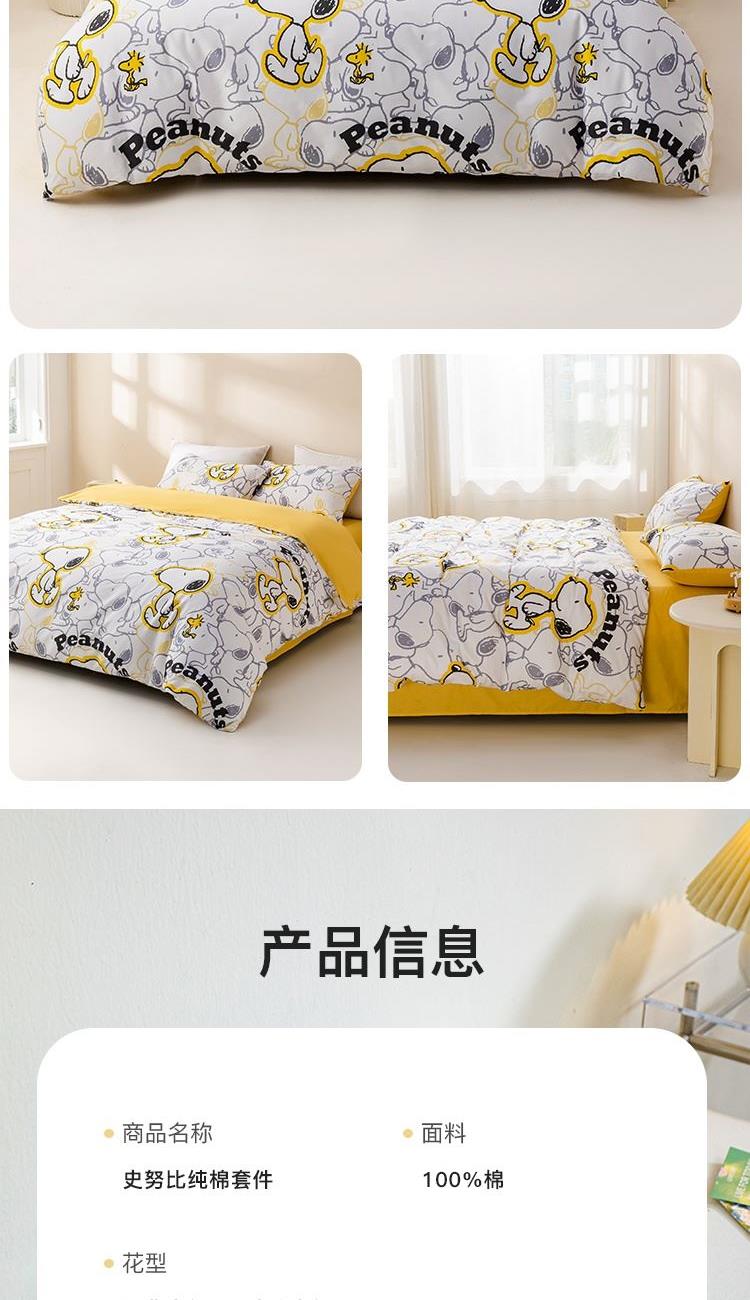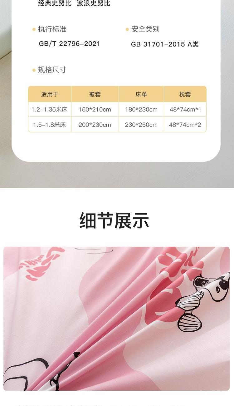 四件套:200*230cm(被套1床单1枕套2) 商品货号:STJ11 商品面料:棉 商品颜色:经典史努比、波浪史努比 严选优质好棉花 透气舒适 带来健康舒适睡眠 平滑纯棉面料 升级面料 纤维纤长 柔软细腻 史努比卡通图案印花 鲜艳花色 点缀家居 高颜值床品 让您爱不释手 新一代环保工艺 给生活多一点安全感 权威检测认证 贴肤使用 健康安心