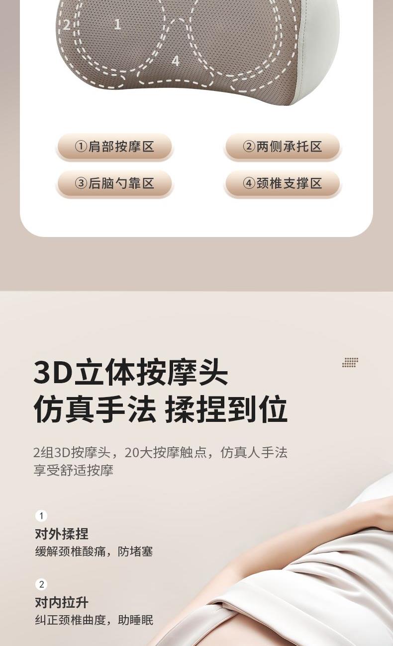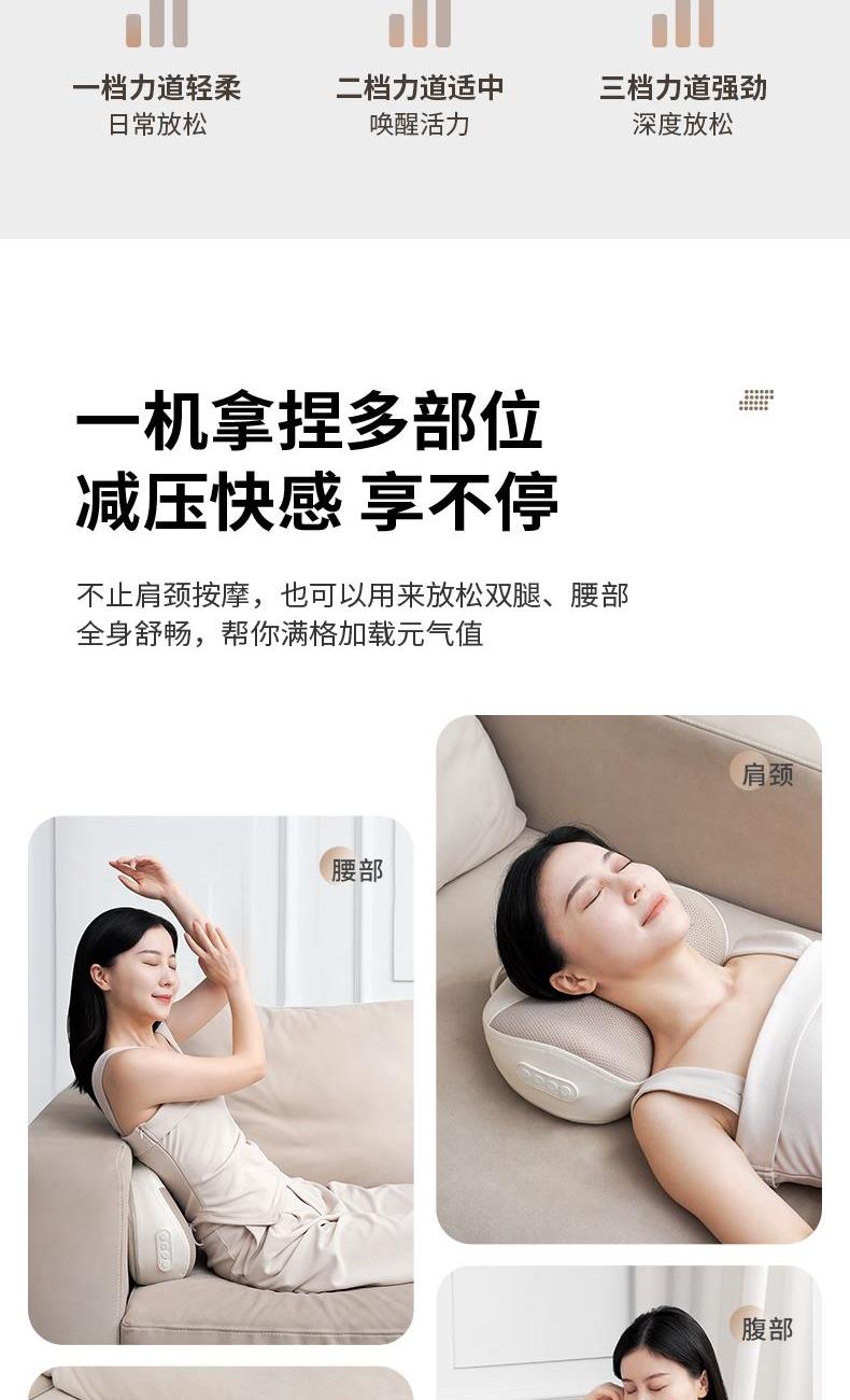 额定电压:5V 额定功率:10W 工作电压:7.4V 工作功率:15W 材 质:PU皮、弹性网 肩部放松,舒腰解乏,背部按摩,腿部养护,多部位使用 一机多用途,三档力度,正反可转,满足全家人使用 简单易操控,一键开机,一键加热,长辈一教就会 仿人手深层揉捏,深度贴合颈椎曲度,按摩放松到位 低分贝设计,轻音不扰人