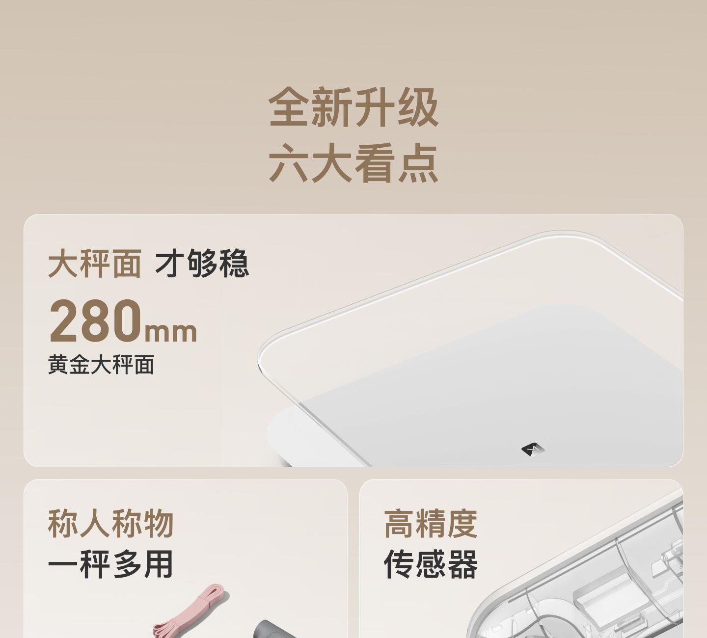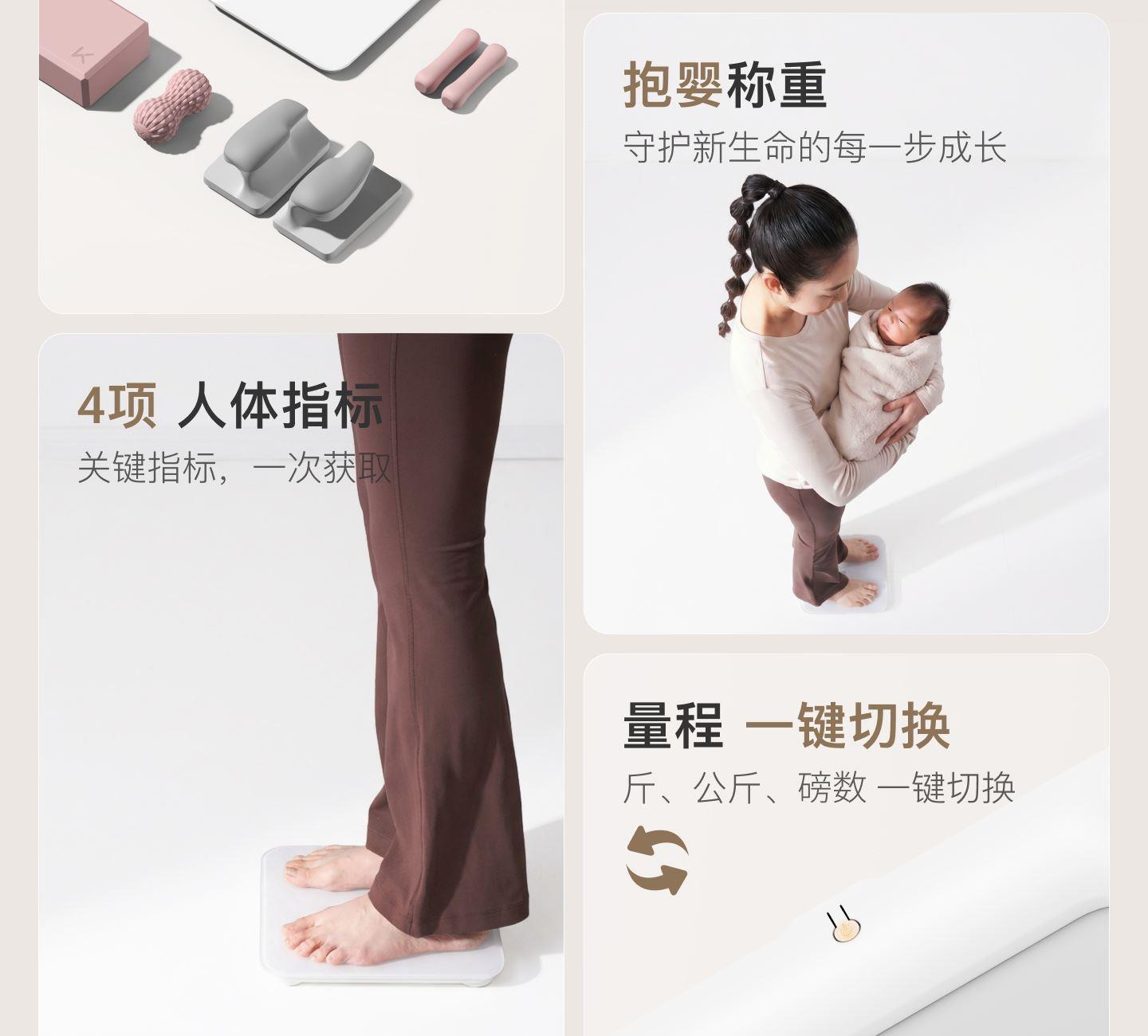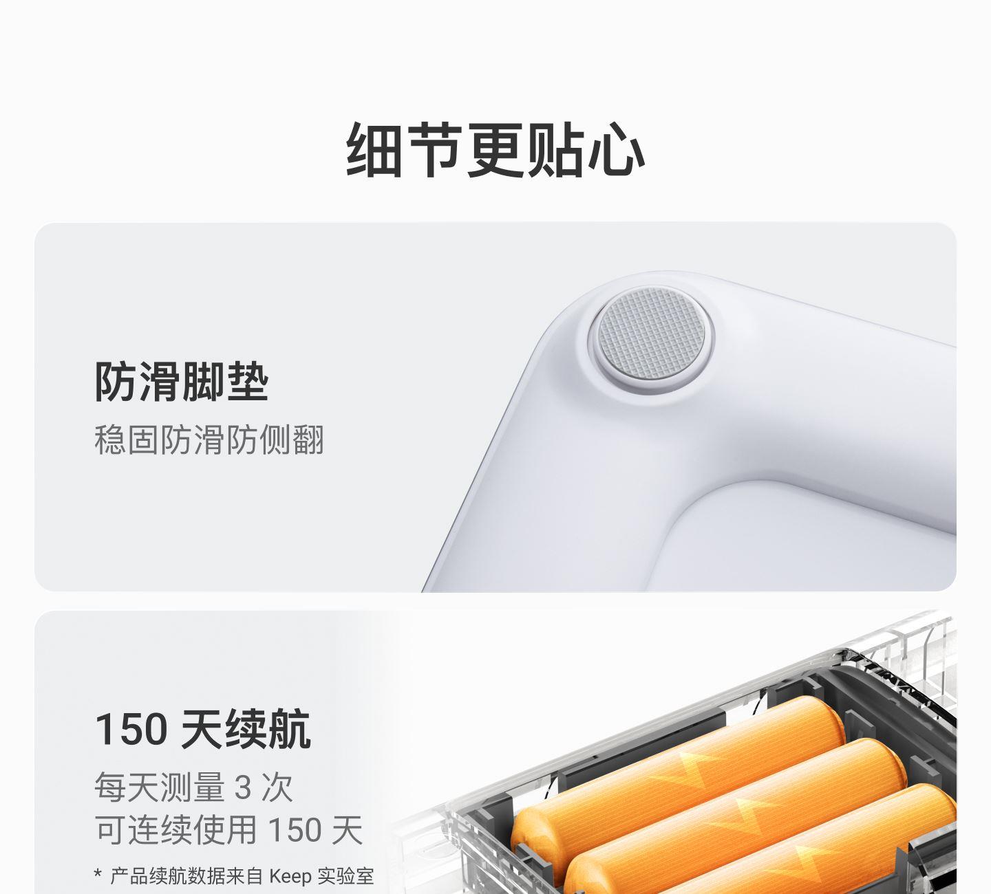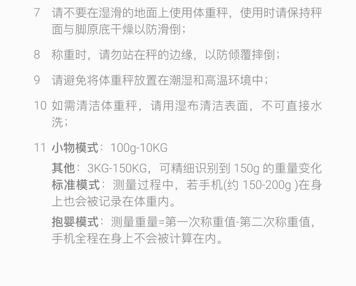 产品尺寸:280 x 280 x 26mm 产品净重:1.15kg 称重范围:0.1~150kg 无线连接:蓝牙5.2 电源类型:三节七号电池 150+天长续航数据自动记录 4项人体指标 150天超长续航 小物称重/抱婴称重 单位一键切换