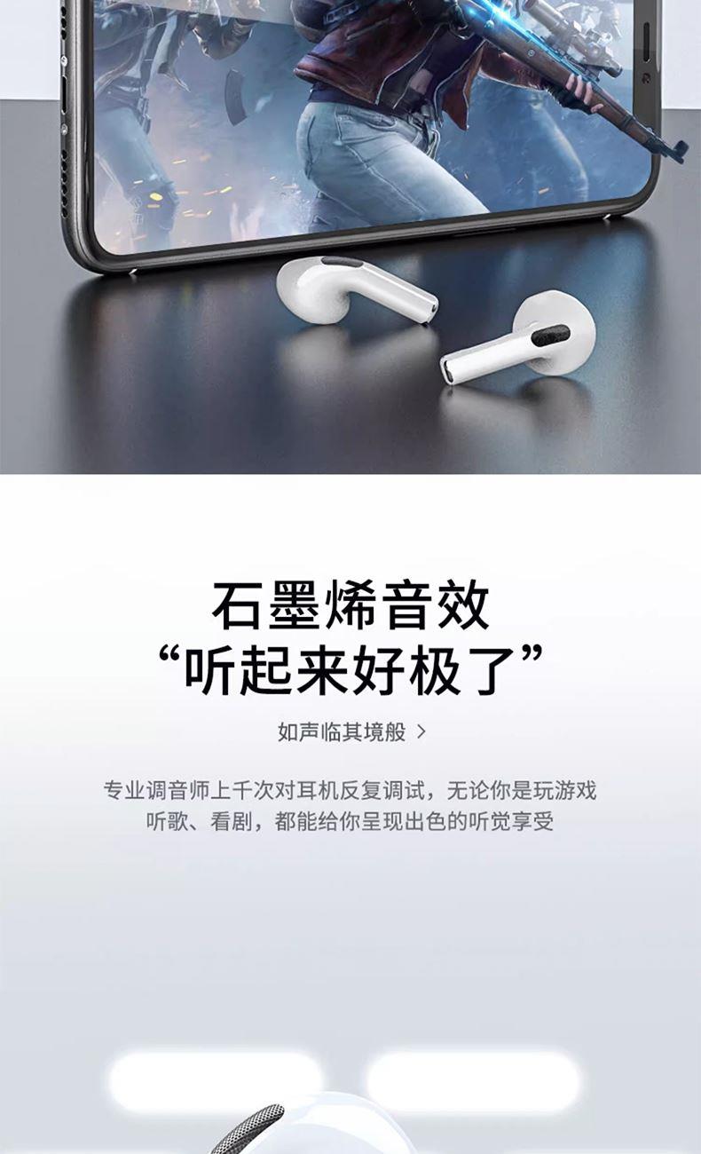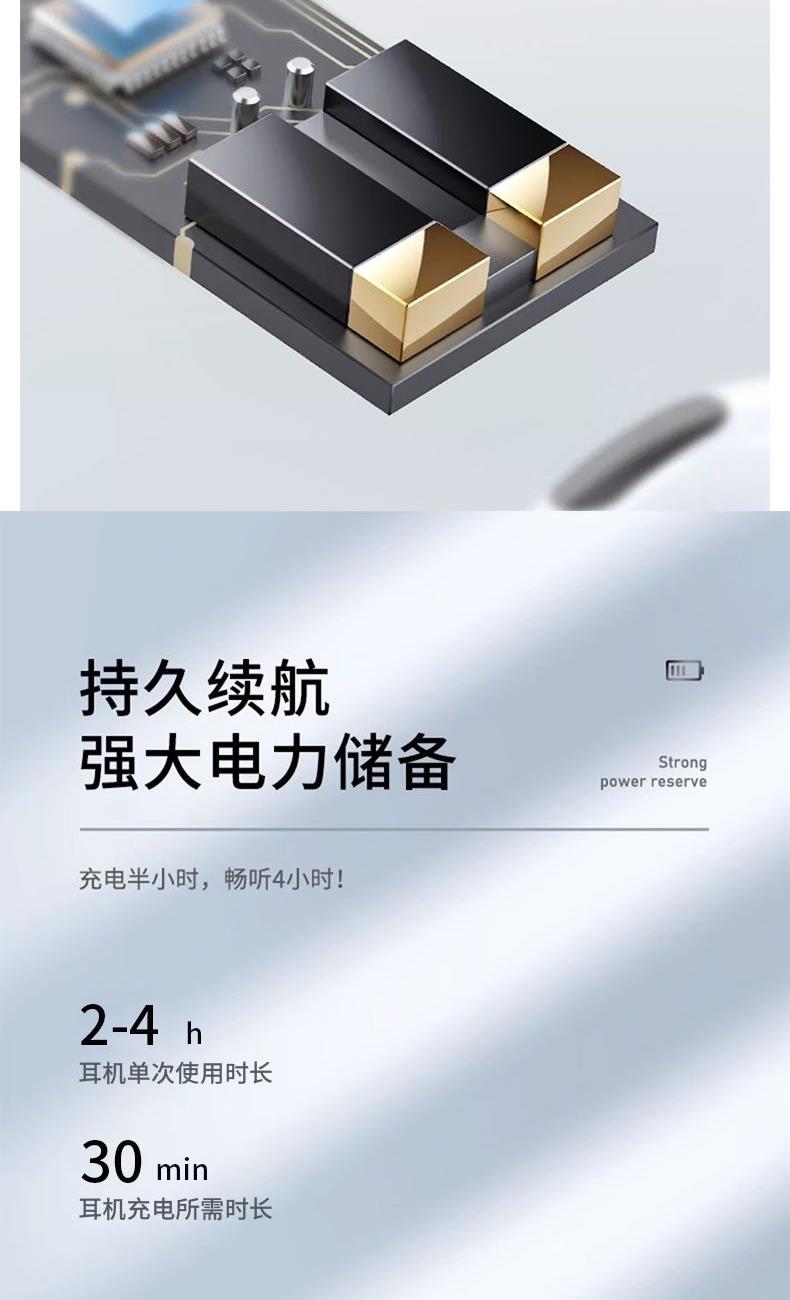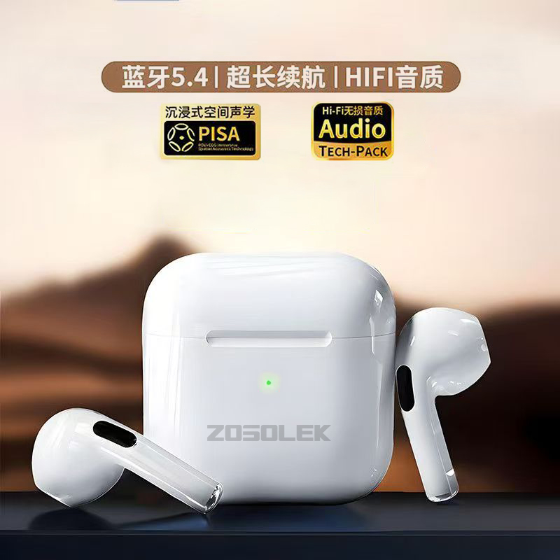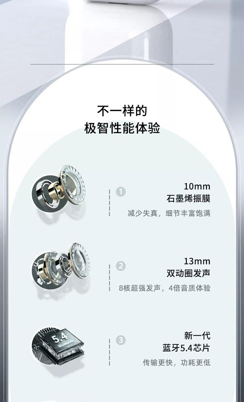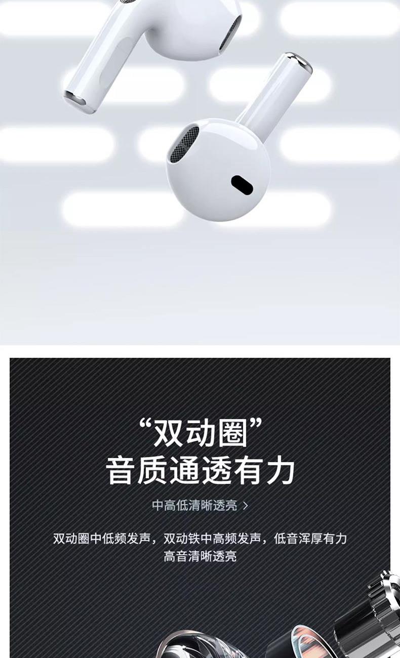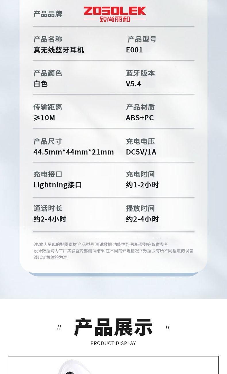 产品型号:E001 产品颜色:白色 音质等级:高品质HIFI 佩戴方式:入耳式 蓝牙版本:V5.4 传输距离:≥10M 产品材质:ABS+PC 产品尺寸:44.5mm*44mm*21mm 电仓电池容量:30mAh 耳机电池容量:180mAh 充电电压:DC5V/1A 充电接口:Lightning接口 充电时间:1-2小时 待机时间:30天 通话时长:2-4小时 播放时间:2-4小时产品特点:1、精致小巧、佩戴舒适、携带方便;2、德国专业调音团队,无限调试,适合每一双挑剔的耳朵;3、低功耗DSP抗干扰Bluetooth5.4芯片,连接顺畅不卡顿;4、ACC+SBC音频解码,无感延迟,音画同步;5、石墨烯振膜,减少失真,双动圈发声,畅享中高低音HIFI音效;6、安全高标准锂电池,续航更持久;7、生活防水,防水防汗,无惧风雨;8、礼盒包装,支持定制。