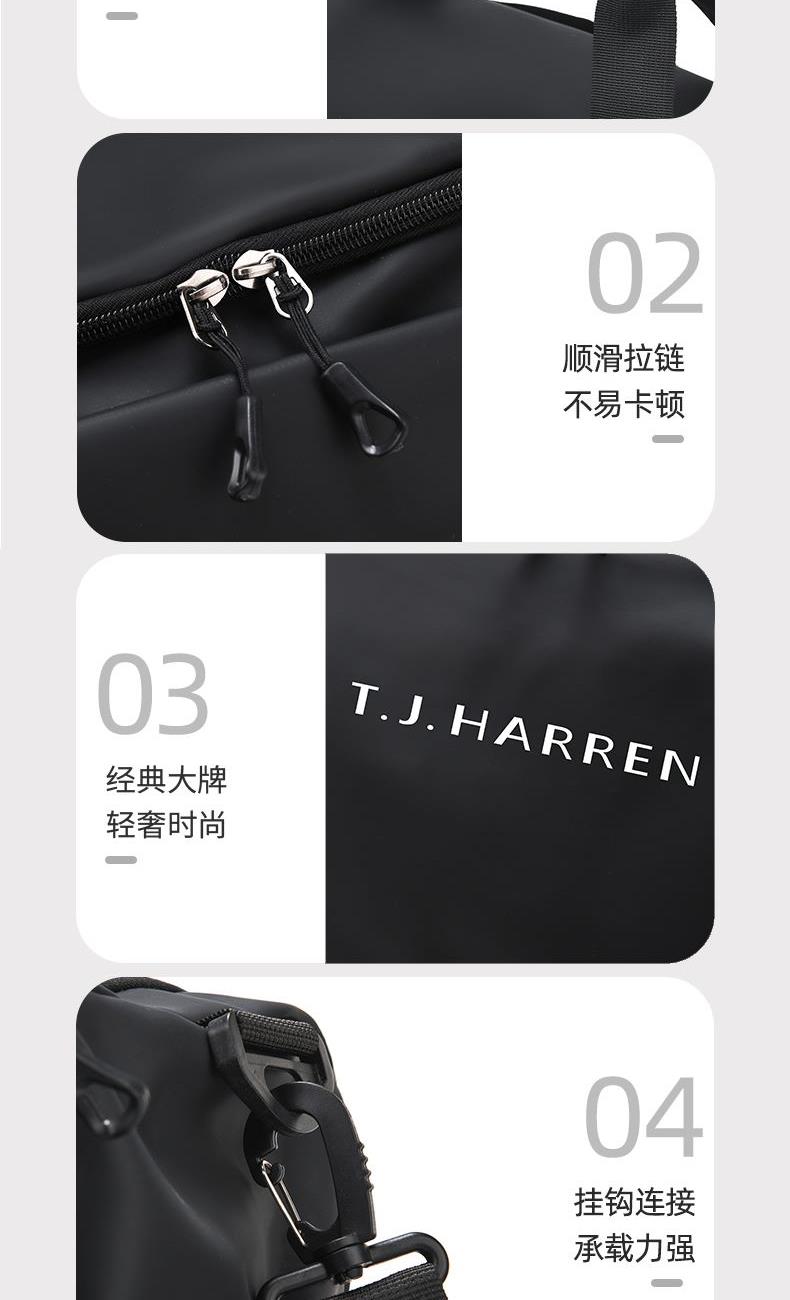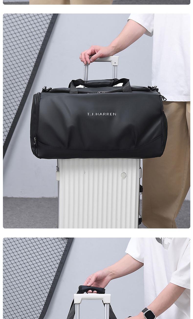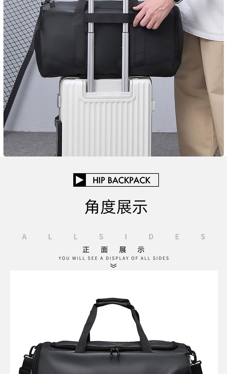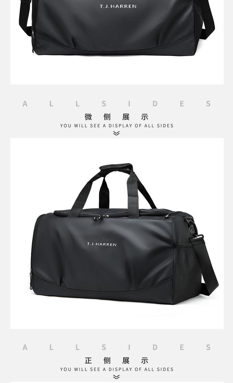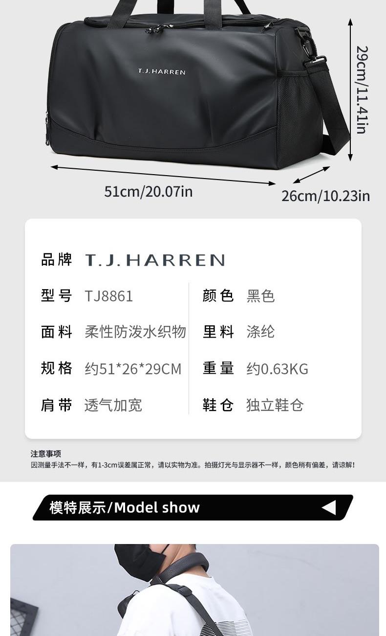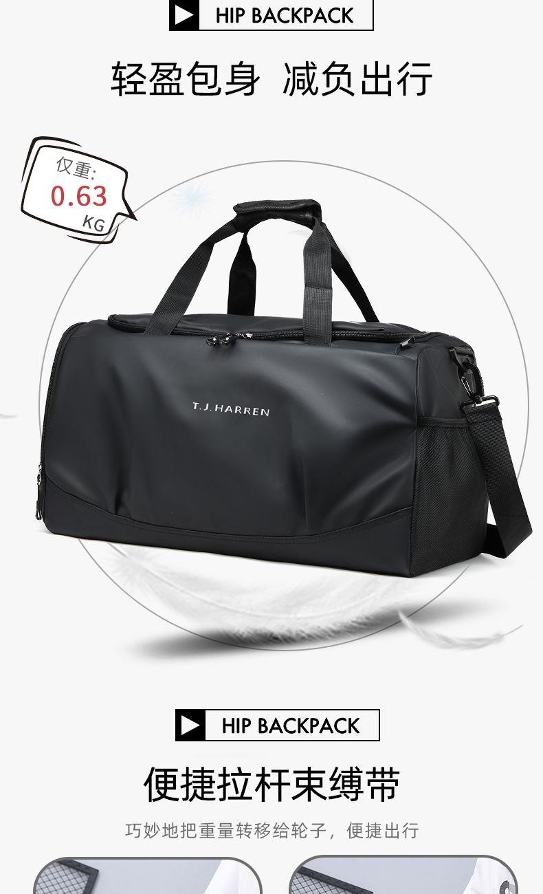 型号:TJ8861 颜色:黑色 尺英寸:约51*29*26CM 容量:约38L 材质:柔性防水织物 里料:涤纶 重量:约0.63KG 等级:一等合格品 执行标准:QB/T 2155-2018 产品特点: 1、新款轻量化设计,轻盈时尚;2、防泼水皮膜面料,一擦即干,轻松打理;3、多隔层结构,分区合理,轻松收纳;4、主袋约38L大容量,装的更多;5、独立鞋仓设计,干净易清理;6、大容量前置拉链袋,放置贴身物品;7、内置干湿分离袋,分区收纳;8、网兜侧袋设计,放置更多物件;9、拉杆固定束带设计,解放双手;10、加大加厚舒适提手与肩带,可背可提,出行更方便;11、支持客户定制。
