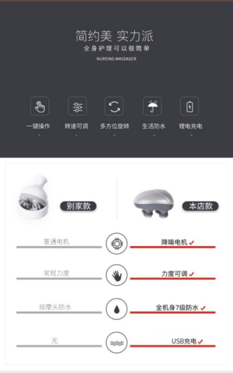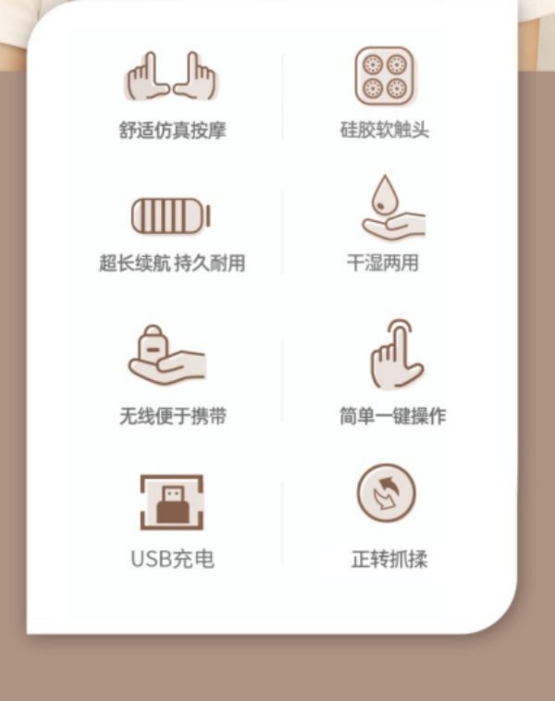 4、无线便于携带;简单一键操作;USB充电;正转反转抓揉