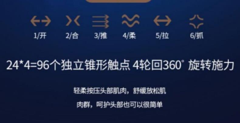 3、降噪电机,3档位自由切换,一键操作、简单方便,可根据按摩需求自由调节,保证头皮舒适的按摩力度